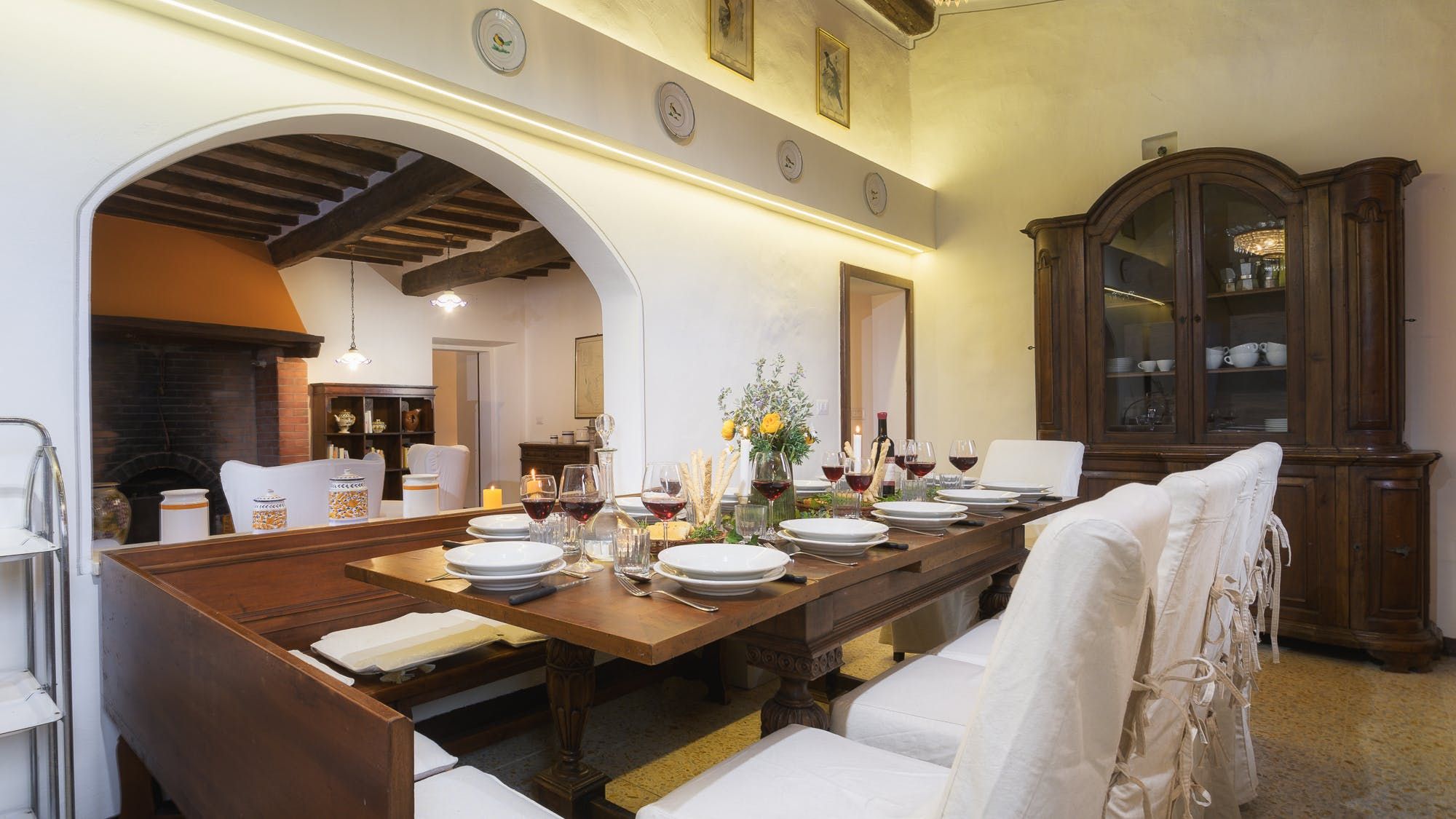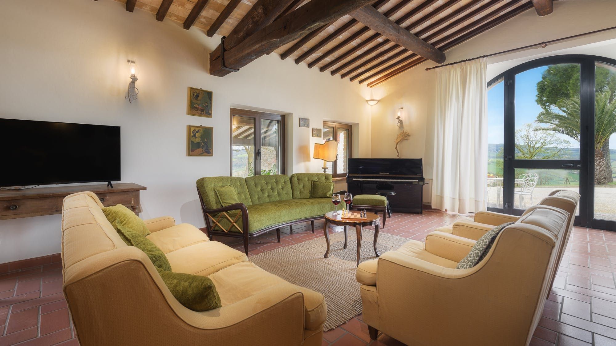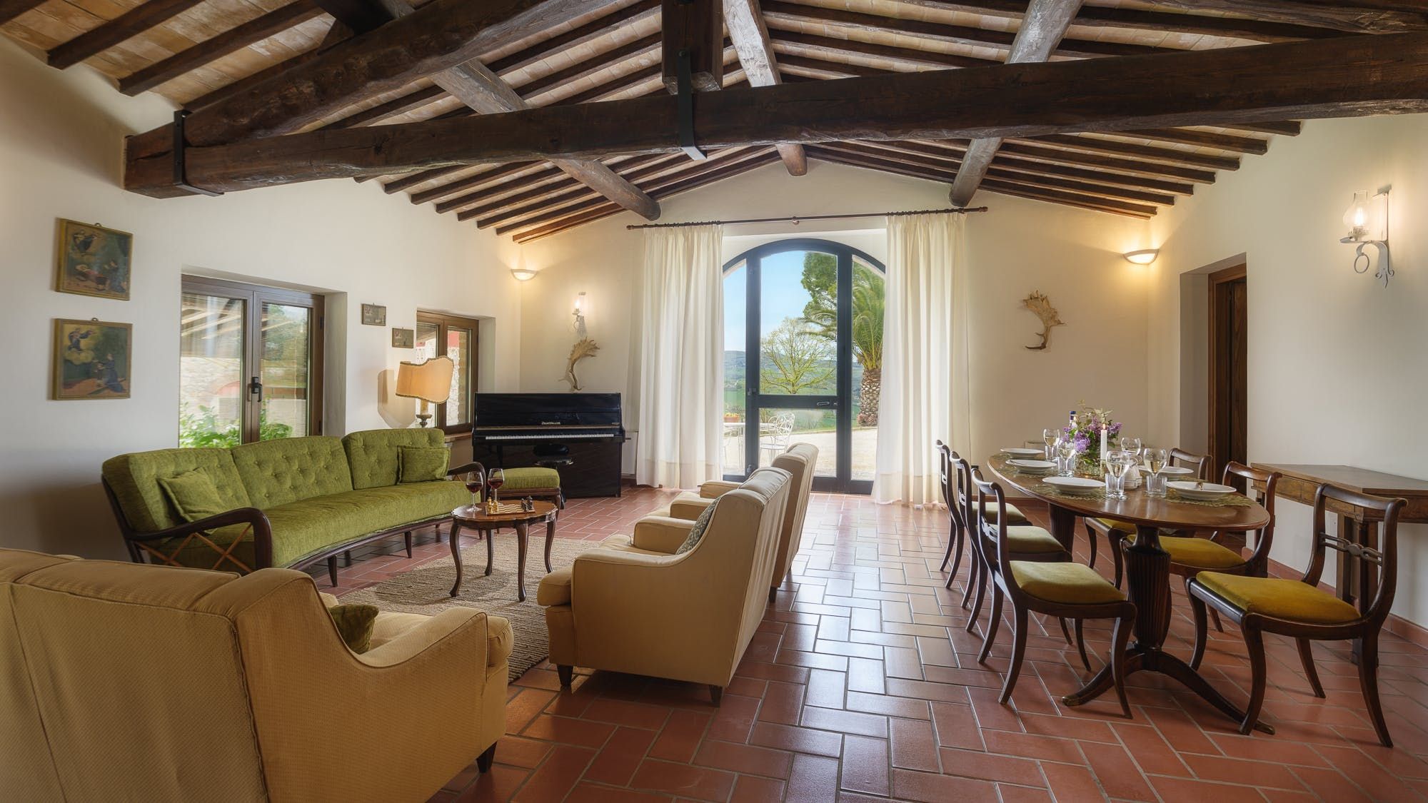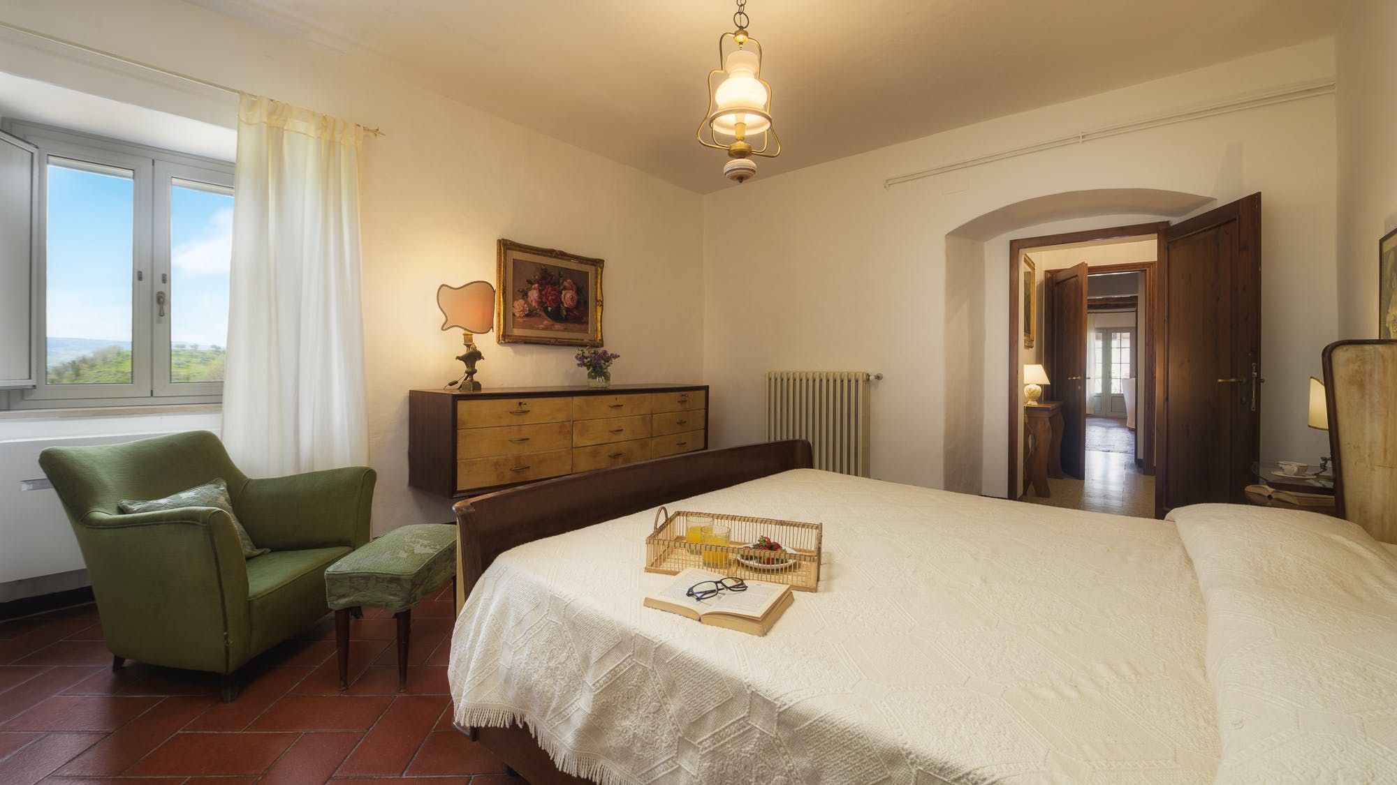 The home is split between the main villa and a separate annexe, and large groups will find myriad sitting rooms and lounges to spread out. Smoke-blackened hearths speak of the home’s history and sitting rooms beneath wooden ceilings are home to antique furniture and little libraries of holiday reads. There are two kitchens to choose from – one in the annexe and one in the main villa, and we love the annexe’s living room with its arched window looking out over the undulating Umbrian countryside.