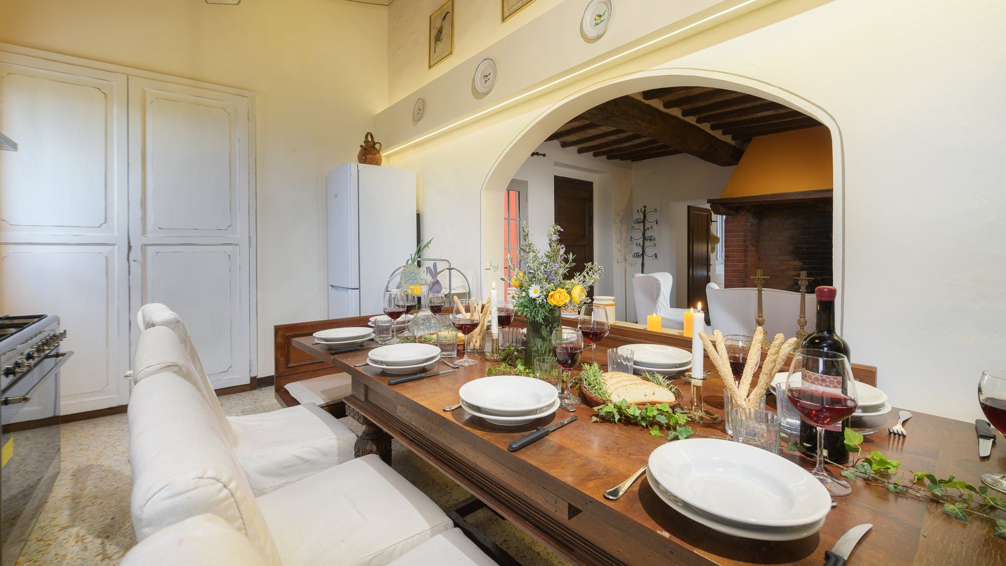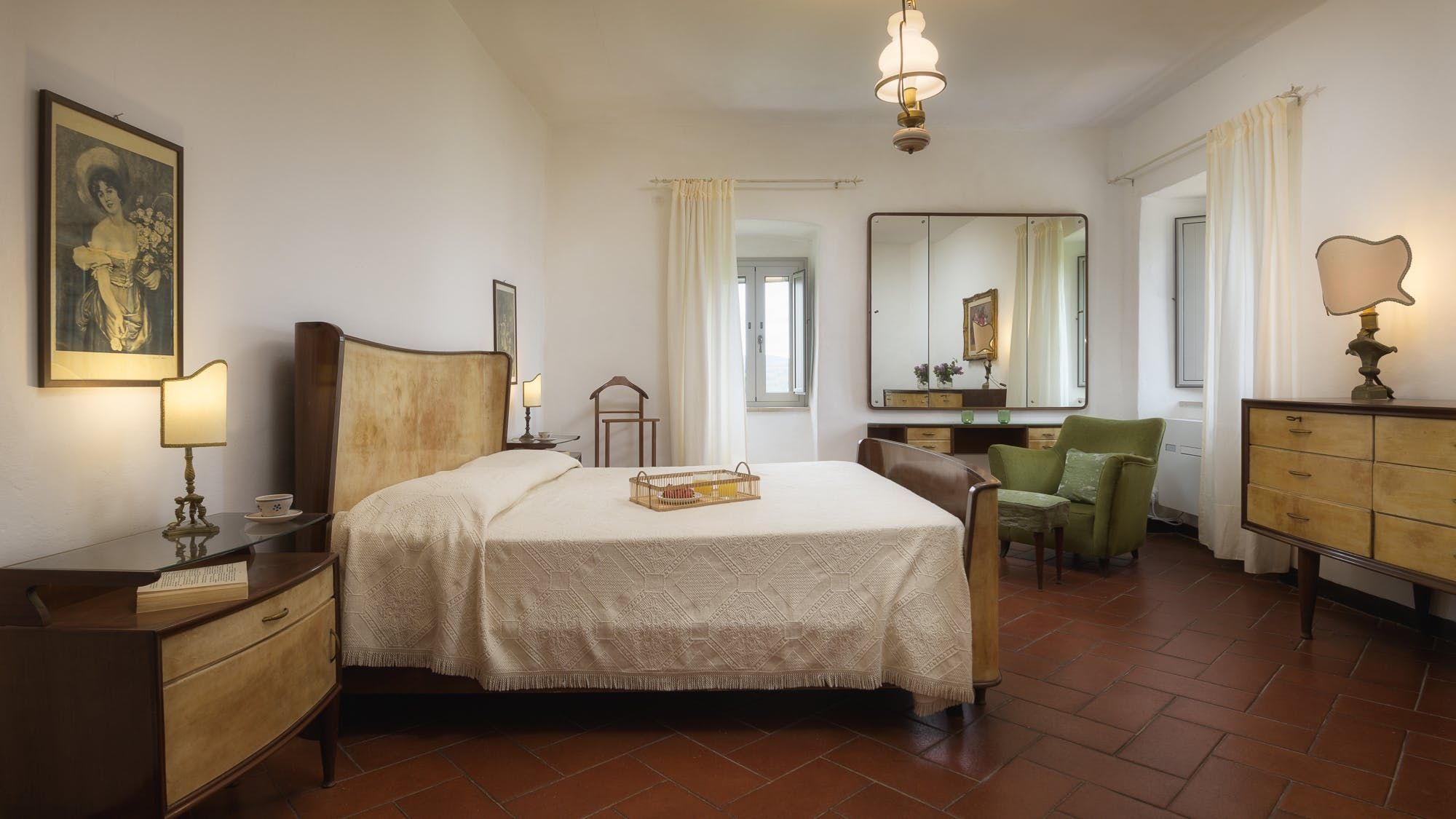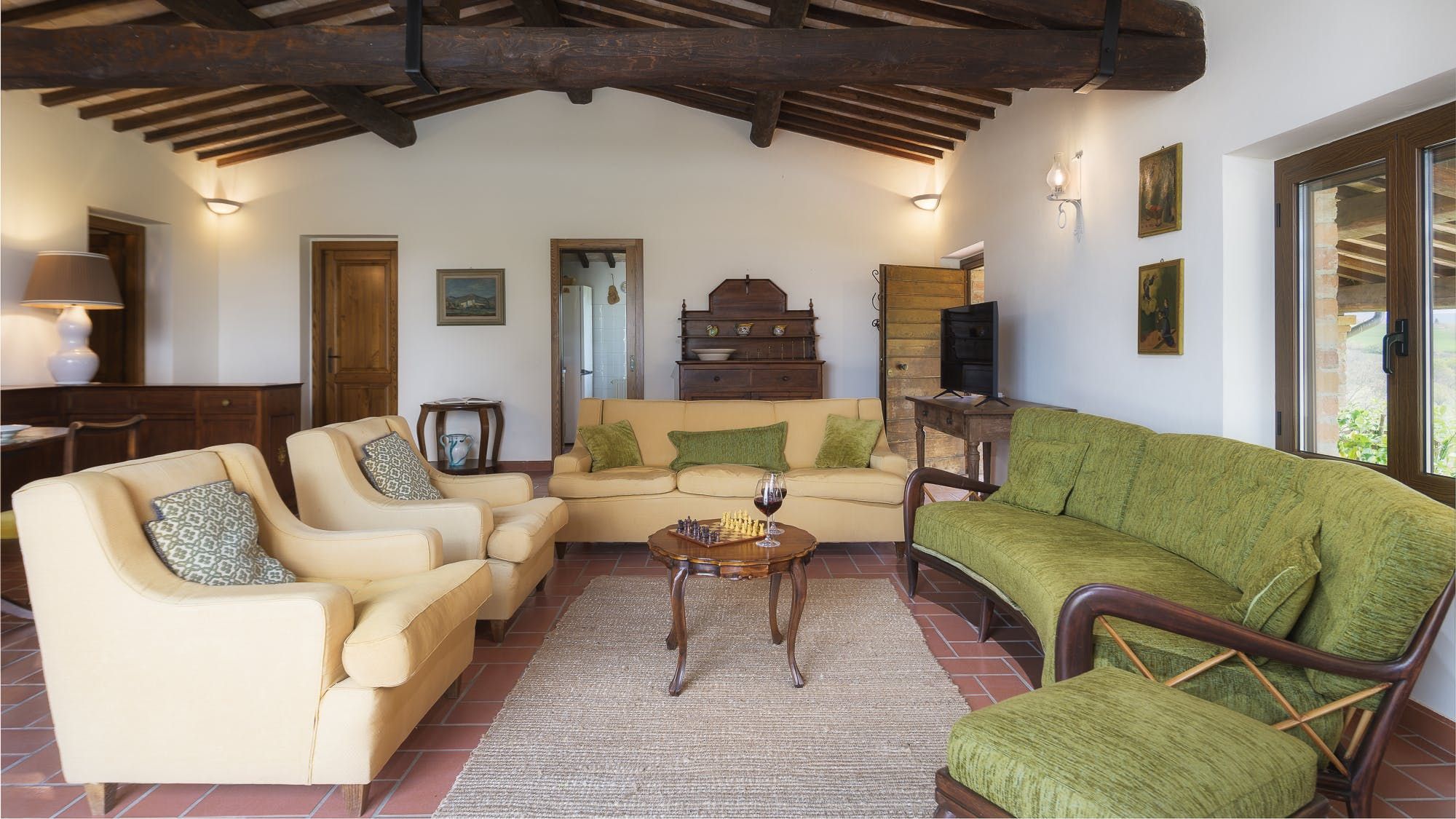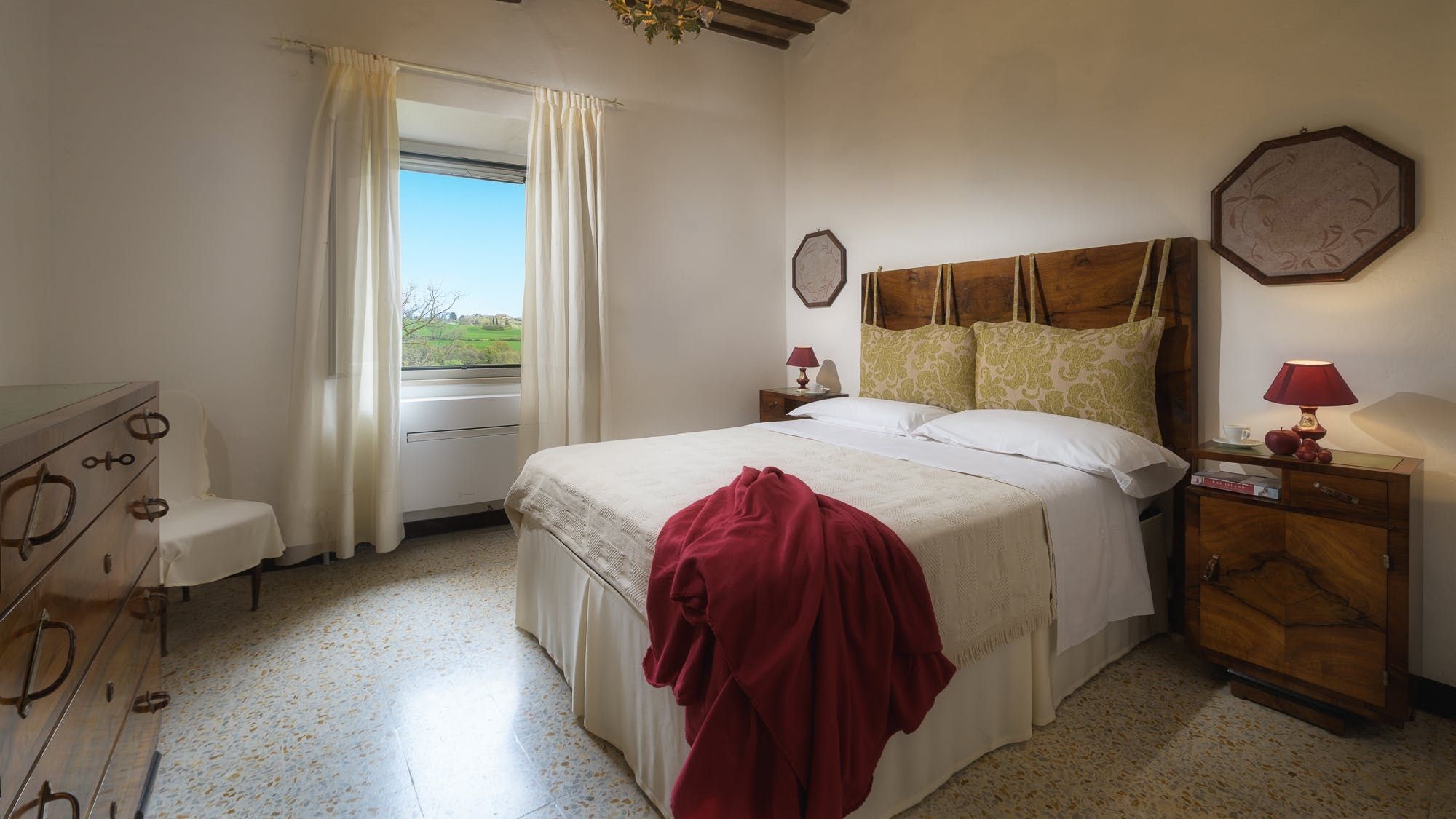 The home is split between the main villa and a separate annexe, and large groups will find myriad sitting rooms and lounges to spread out. Smoke-blackened hearths speak of the home’s history and sitting rooms beneath wooden ceilings are home to antique furniture and little libraries of holiday reads. There are two kitchens to choose from – one in the annexe and one in the main villa, and we love the annexe’s living room with its arched window looking out over the undulating Umbrian countryside.
