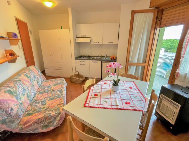 1-room apartment 28 m2. Simple and practical furnishings: living/dining room with 1 double sofabed and 1 x 2 bunk beds, dining table and TV (flat screen). Exit to the terrace. Small kitchenette (3 hot plates, kettle). Shower/bidet/WC. Air-conditioning, forced-air heating, boiler (50 litres).