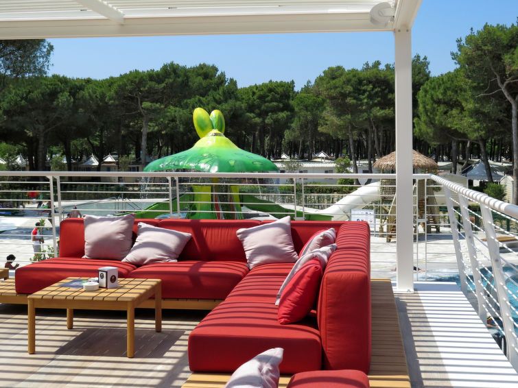 "Baia Classic", 3-room mobile home 22 m2. Practical furnishings: living/dining room with dining table and satellite TV. 1 room with 1 french bed (140 cm). 1 room with 2 beds (70 cm). Kitchenette (4 gas rings, freezer). Shower/WC. Air-conditioning, forced-air heating. Terrace roofed.