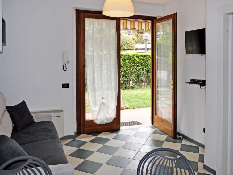 2-room apartment 40 m2, on the ground floor. Modern furnishings: living/sleeping room with 1 sofabed, dining table and satellite TV. Exit to the terrace. 1 double bedroom. Open kitchen (3 gas rings, electric coffee machine). Shower/bidet/WC. Gas heating, air-conditioning (extra). Small garden, south facing position.