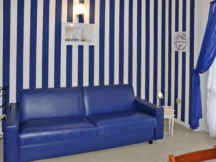 1-room apartment 40 m2, on the ground floor. Modern furnishings: living/sleeping room with 1 bed, 1 double sofabed, 1 pull-out bed, dining table and satellite TV. Exit to the terrace. Open kitchen (oven, 4 gas rings). Shower/bidet/WC. Gas heating (extra), air-conditioning (extra).