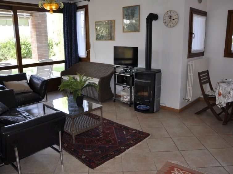 5-room terraced house 130 m2 on 3 levels. Practical furnishings: living/dining room with satellite TV. Exit to the terrace. Kitchen (oven, dishwasher, 4 gas rings, microwave). Sep. WC. On the lower ground floor: living room with open-hearth fireplace (only for decoration). 1 double bedroom.