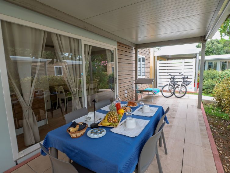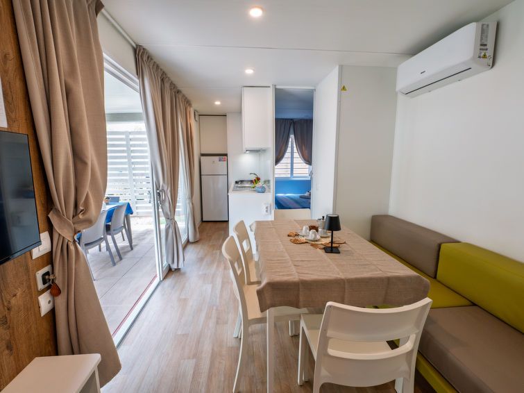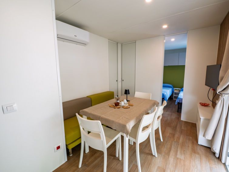4-room mobile home 34 m2. Bright, modern furnishings: living/dining room with satellite TV. Exit to the terrace. 1 double bedroom with separate WC. 2 rooms, each room with 2 beds (70 cm, length 190 cm). Kitchenette (dishwasher, Gas stove, 4 gas rings, microwave, freezer) with satellite TV.