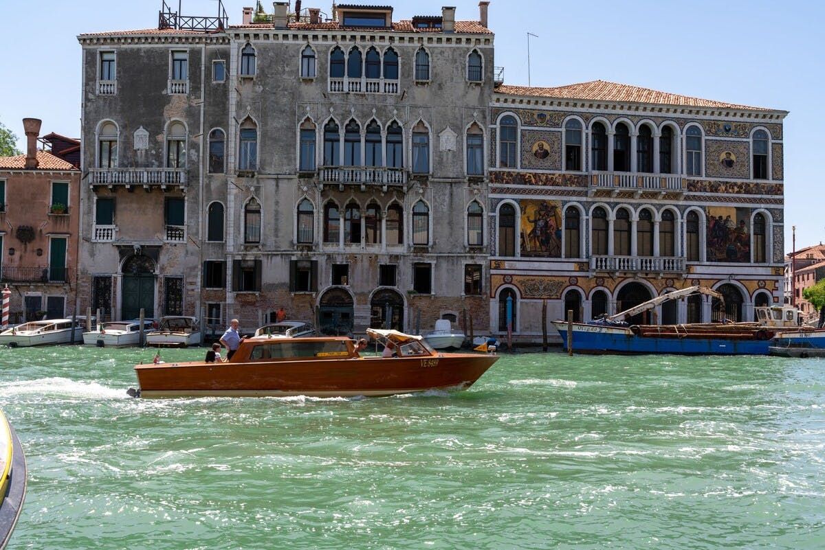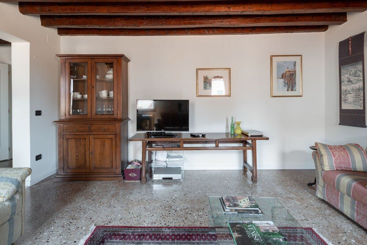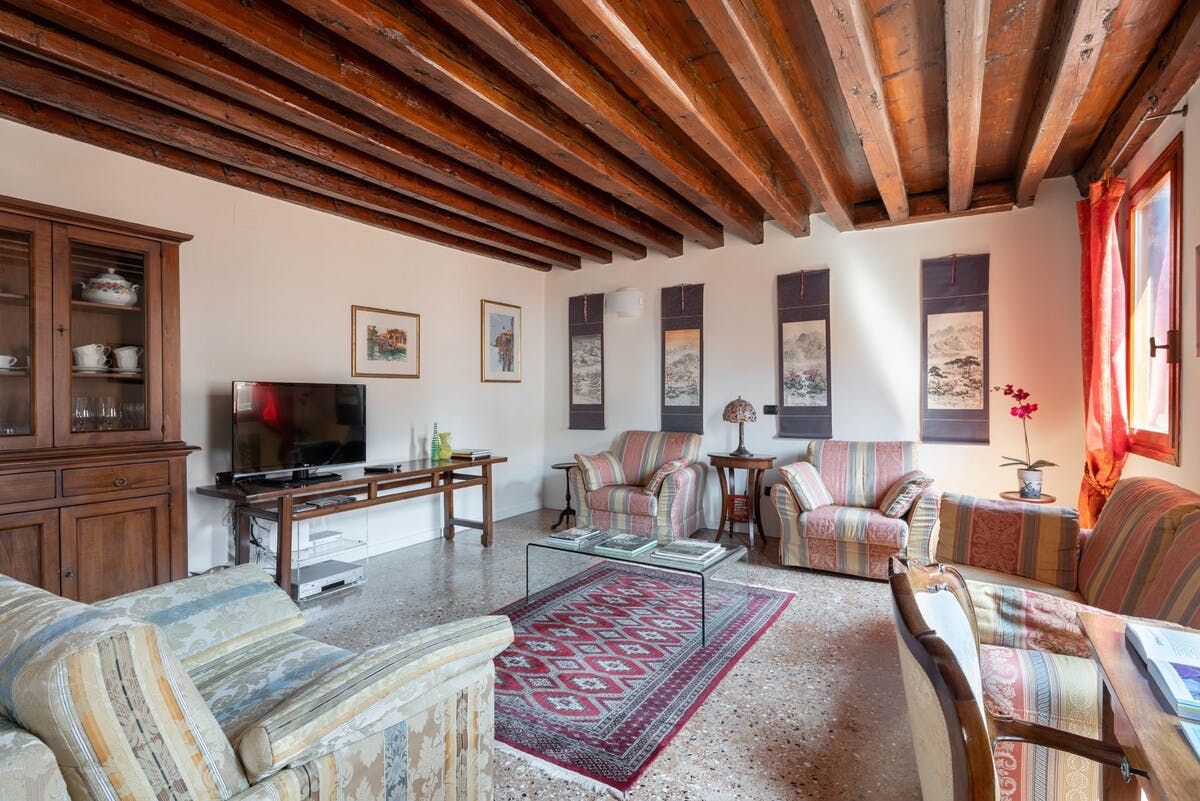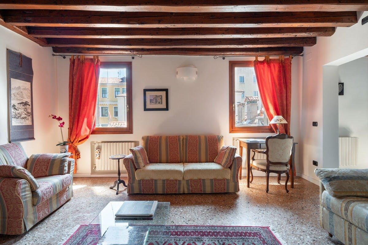 The apartment is a grand family home, with traditional touches like the wood-beamed ceilings. It’s on the fourth floor, and from the windows you can see a pretty skyscape of Venetian rooftops all the way to the Grand Canal. Even more amazingly for Venice, this building has an elevator so those four floors are no trouble at all.