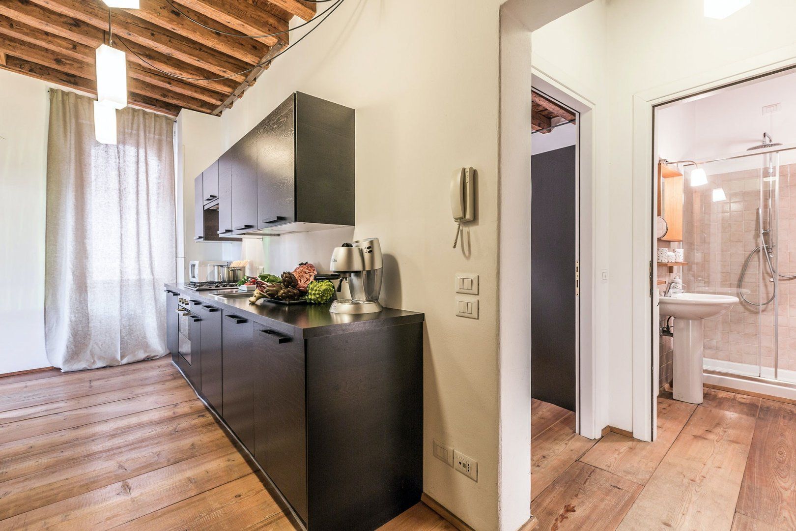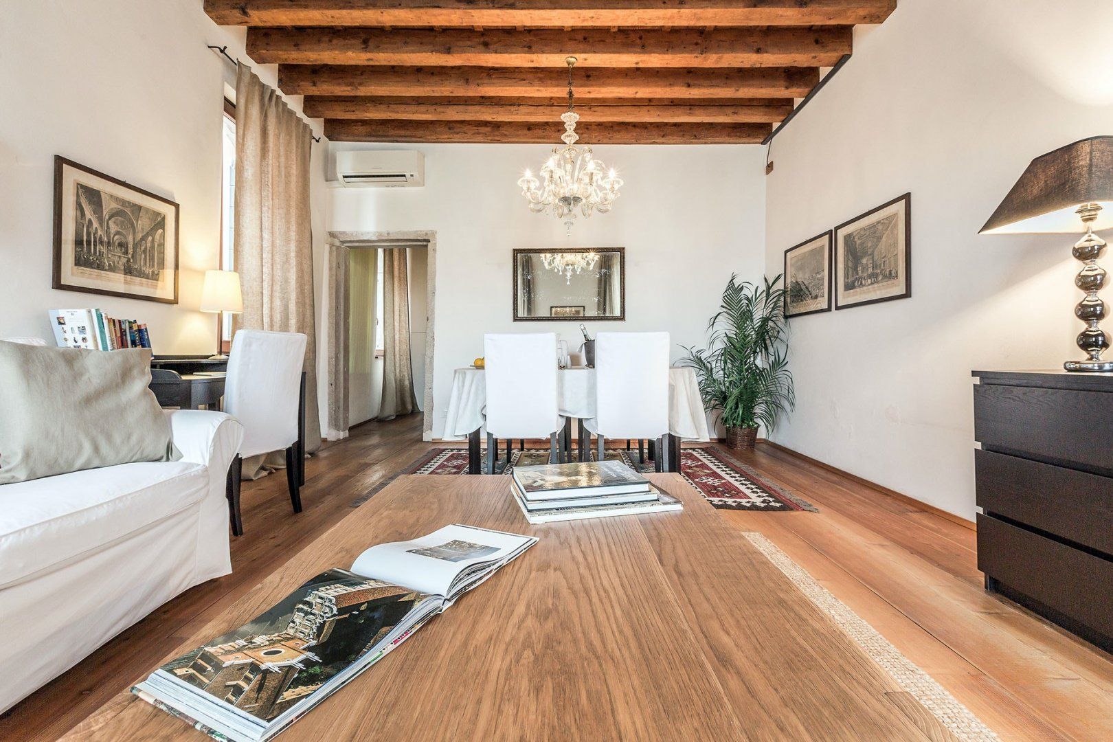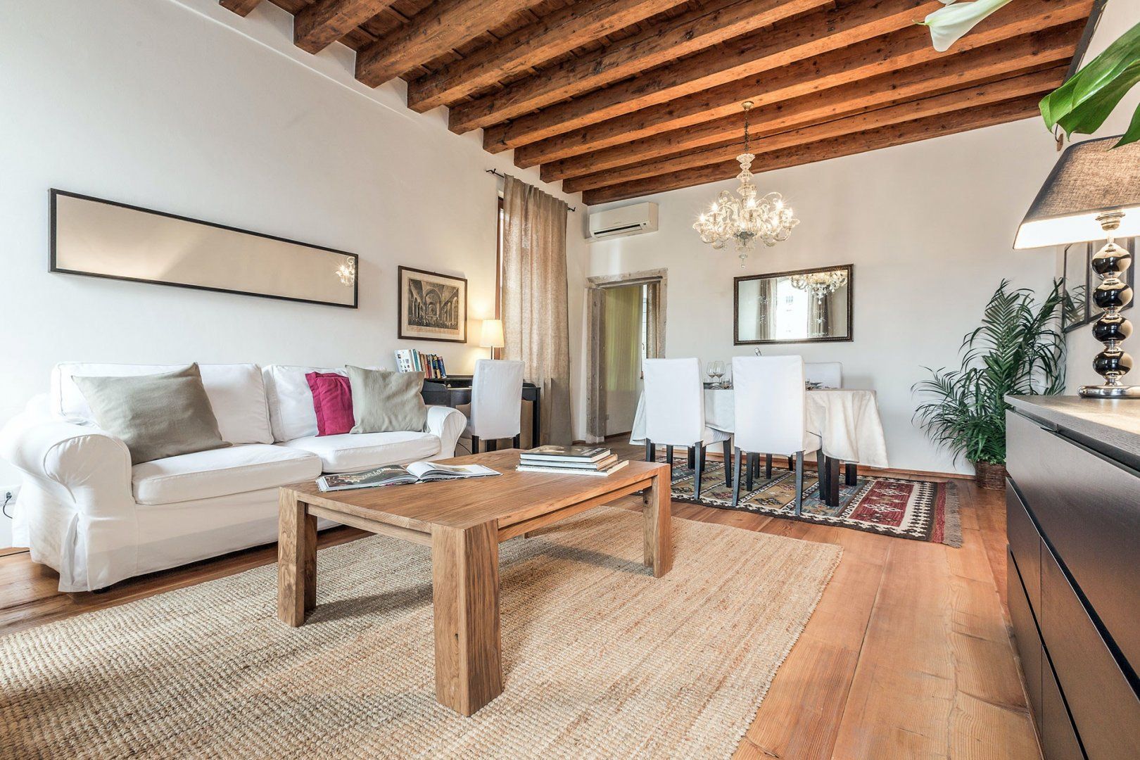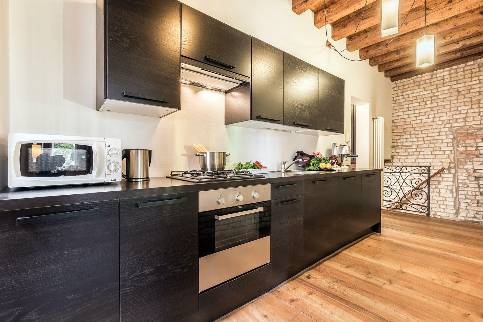 Incredible canal views and a sophisticated interior combine in this seventeenth-century building to create a luxury pad you'll relish returning to. We love the exposed brickwork and wooden beams above, and the lighting helps create a romantic atmosphere. The bed can also be split in two, making it perfect for two friends looking to explore too. You can grab fresh ingredients at the nearby Rialto Market to impress your companion in the large kitchen, and there is an array of restaurants practically at your doorstep.