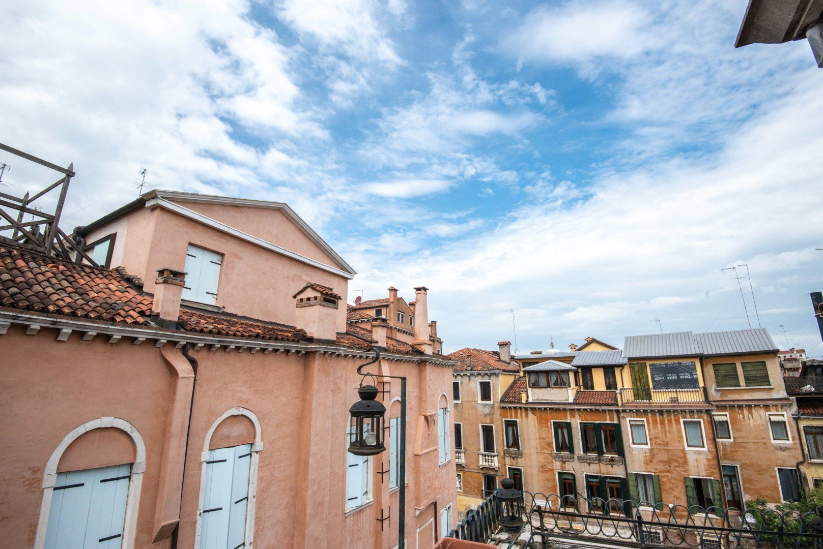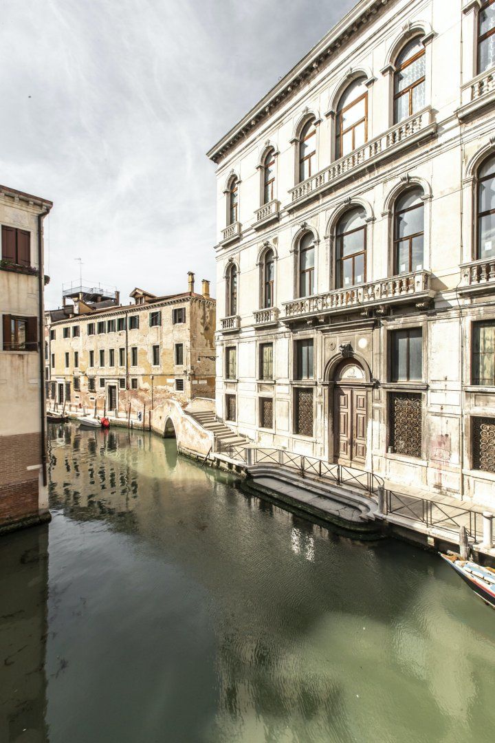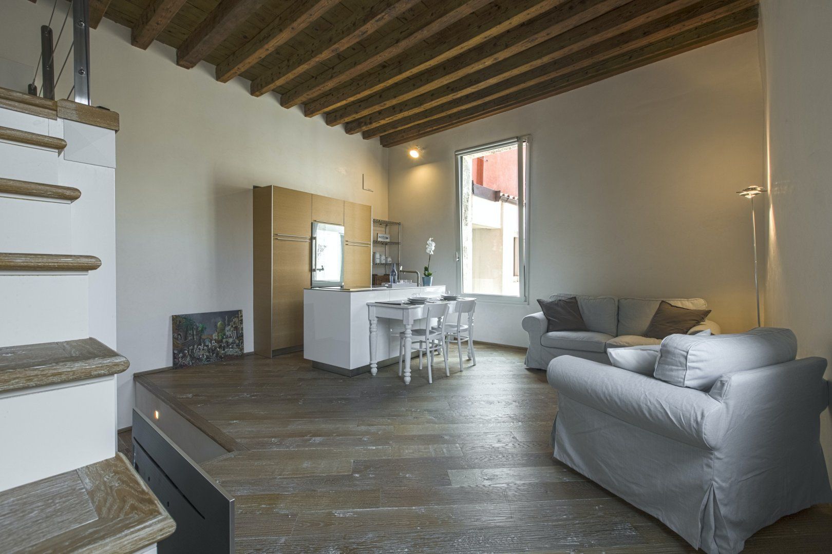 The interior is a triumph of form and function, with stylish contemporary furnishings sitting in an open living space beneath an original exposed beam ceiling. Two large windows ensure plenty of natural light and views over the terracotta-tiled roofs of the Dorsoduro neighbourhood. After a day exploring the city, return home for a well-deserved night's sleep on the mezzanine level.