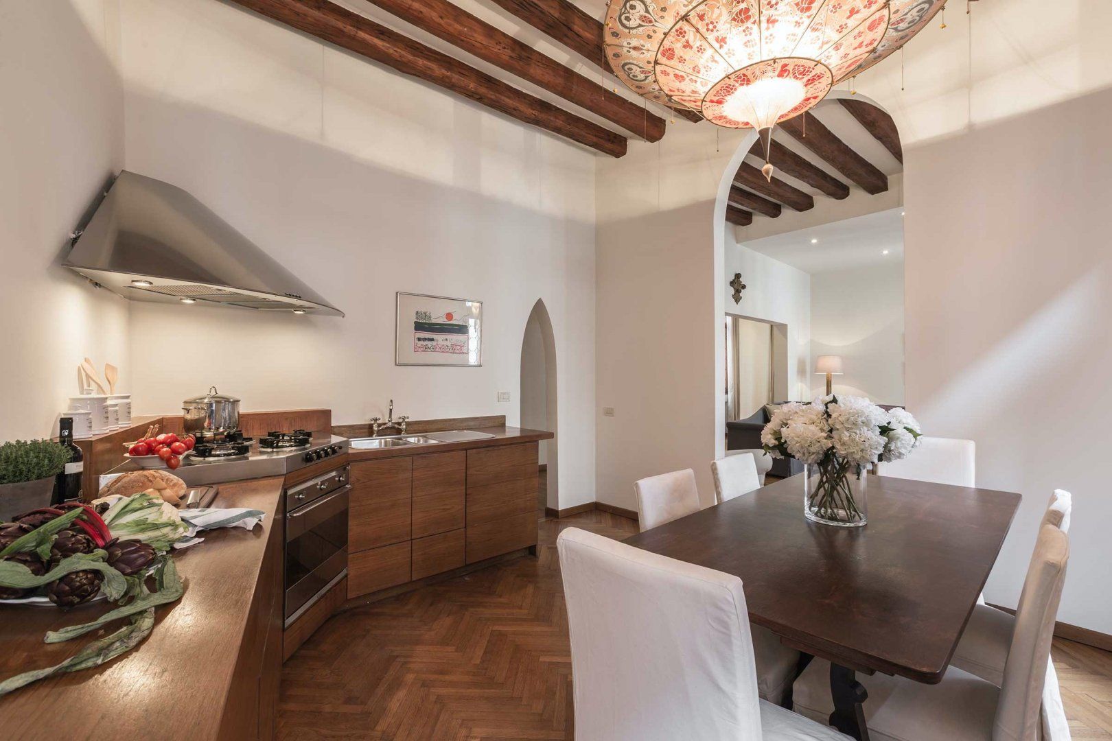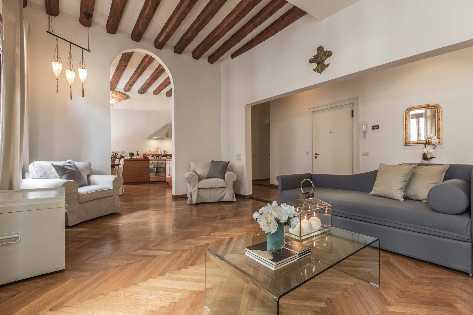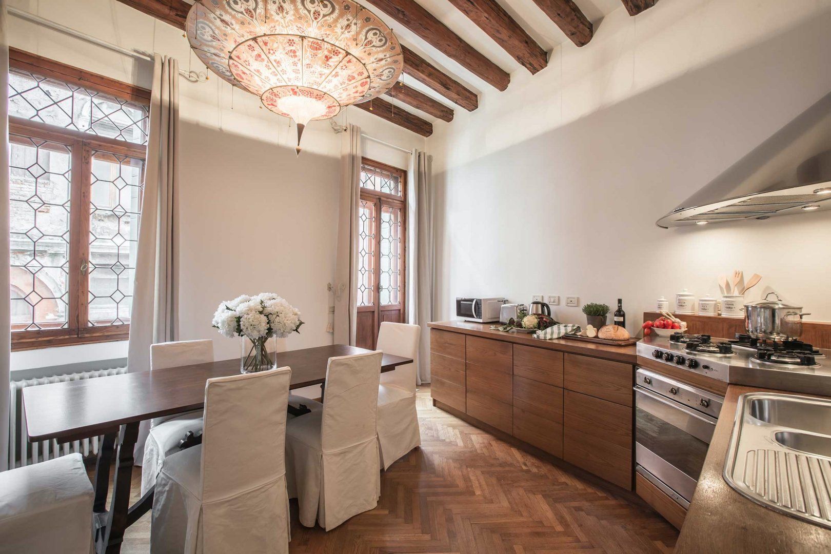 This chic Venetian apartment is tucked away on a quiet street close to the bustling Piazza San Marco. It's located on the second floor of a historic building – so may not be suitable for individuals with reduced mobility. The space is an excellent base for a couple or small group of friends wanting to explore the winding streets of this romantic city with ease. Although the kitchen is quite small, it has all the expected appliances and even a balcony with great canal views. We love the location of this property – the nearest supermarket is less than one minute away on foot and the Rialto Bridge is a four-minute stroll from the home.