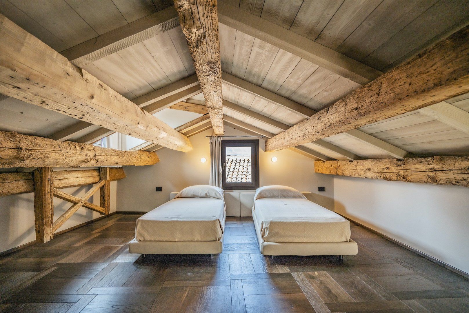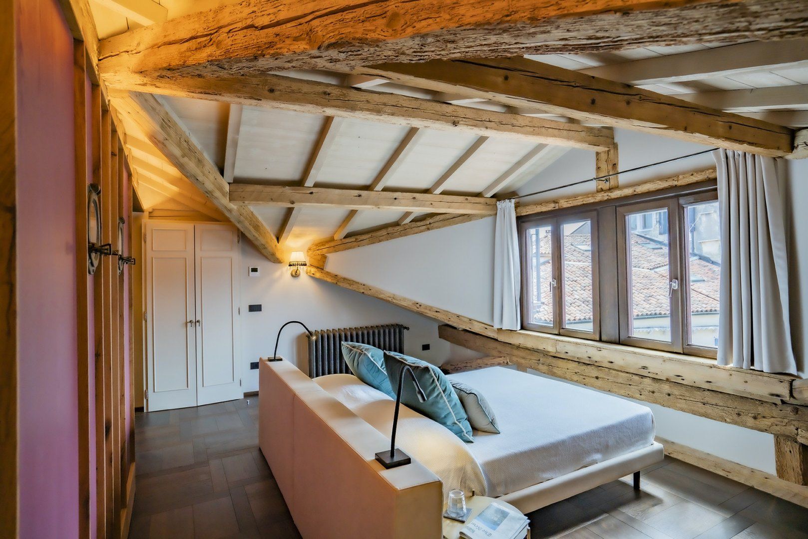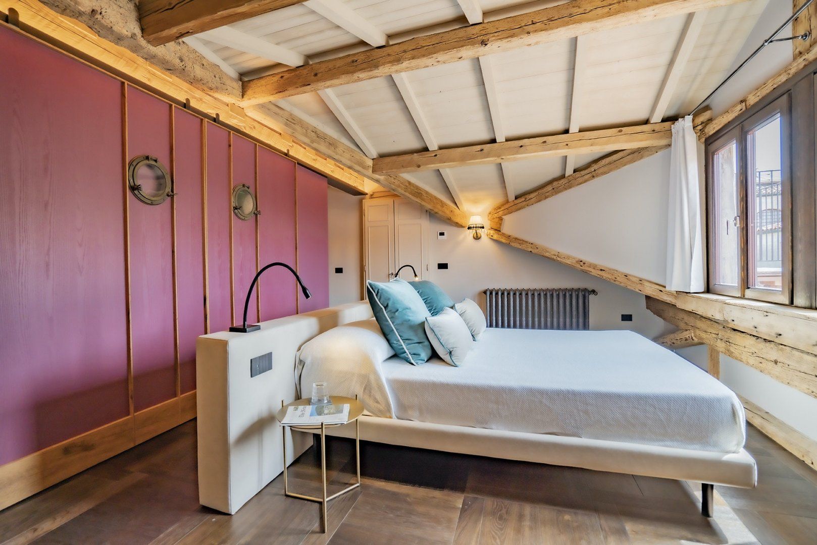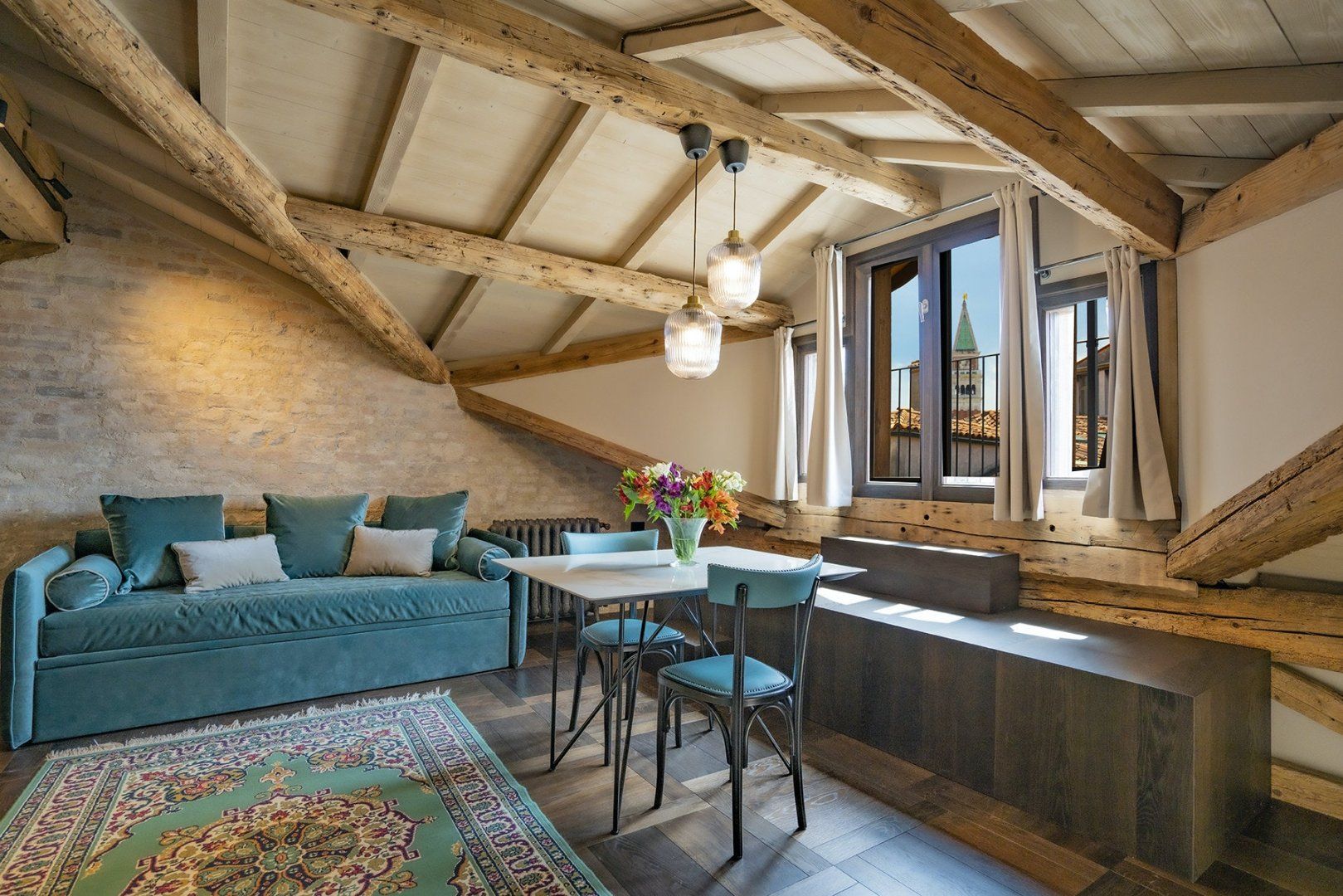 Romantic, chic, and so central you're knocking shoulders with St Mark's Basilica. This home couldn't be more perfect for exploring Venice. The ancient apartment has retained the building's traditional wooden beams and exposed brick, a taste of true Venetian charm. The old and the new blend seamlessly with sleek marble walls, plush furnishings, and luxurious chromotherapy showers.