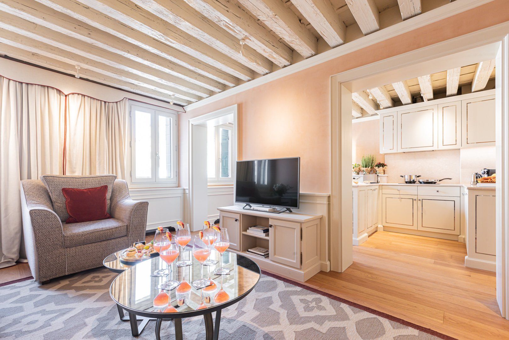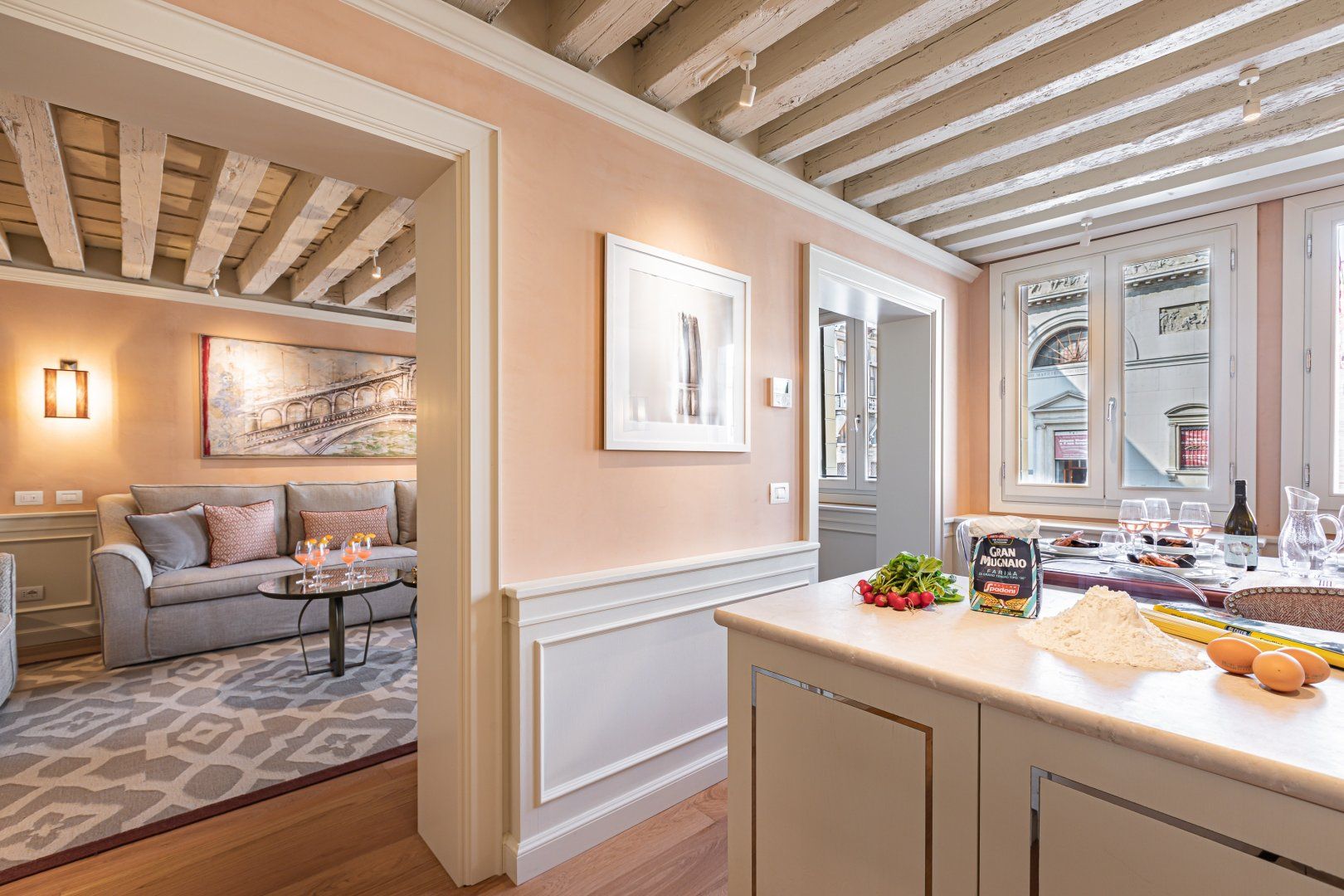 Step inside, and you'll be enchanted by the traditional touches throughout the home, from the wooden ceiling beams to the lavish, vintage-inspired beds. The kitchen is well-equipped with all the utensils you could need to practice your favourite Italian dishes – and, once you're finished cooking, you can serve up your culinary creations at the chic dining table. There's also a desk where you can catch up on work, along with a comfy sofa that invites you to flop down with a glass of wine after a busy day.