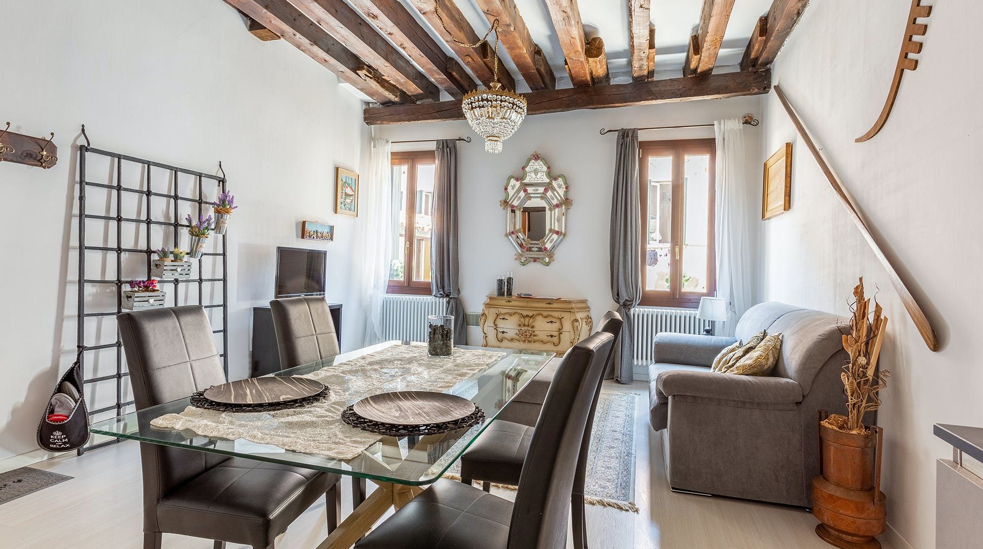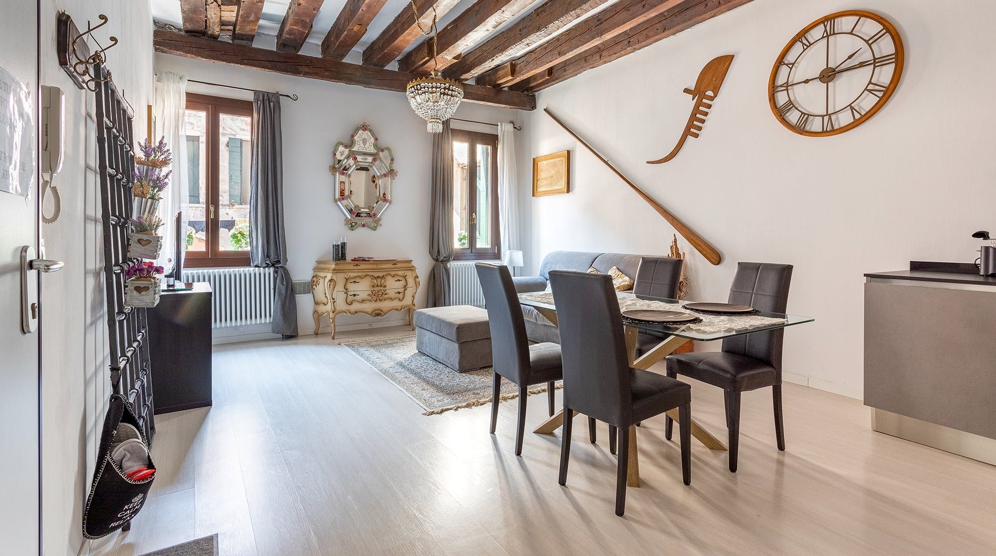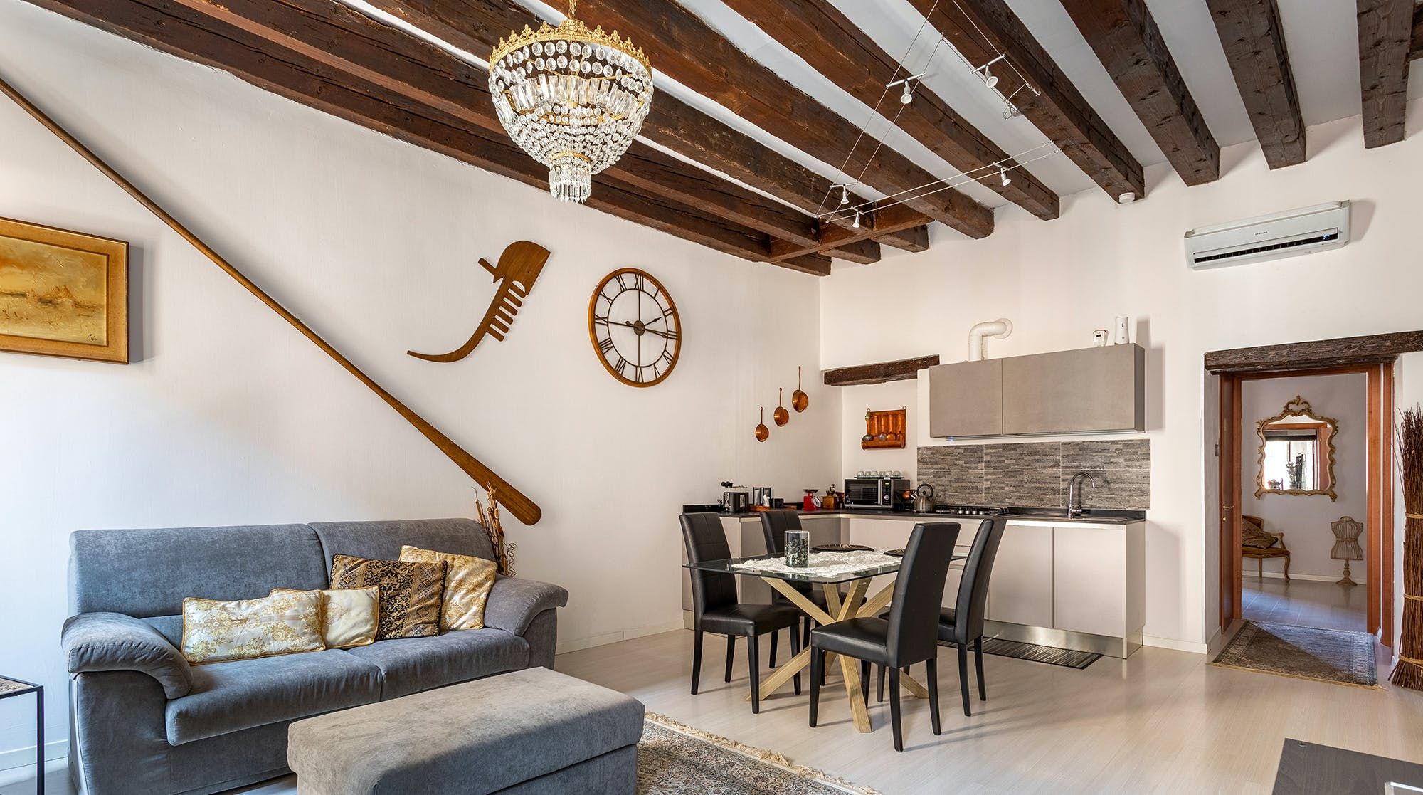 The apartment is calm and quiet, with antique features like the wood-beamed ceilings to remind you of the history of the building, and the city beyond the windows. Antique styling adds to the refined feel of the home – you’ll live like the grand old families of Venice used to.