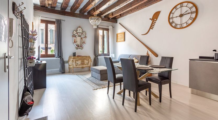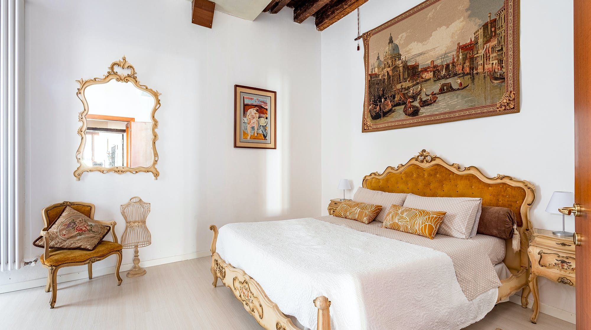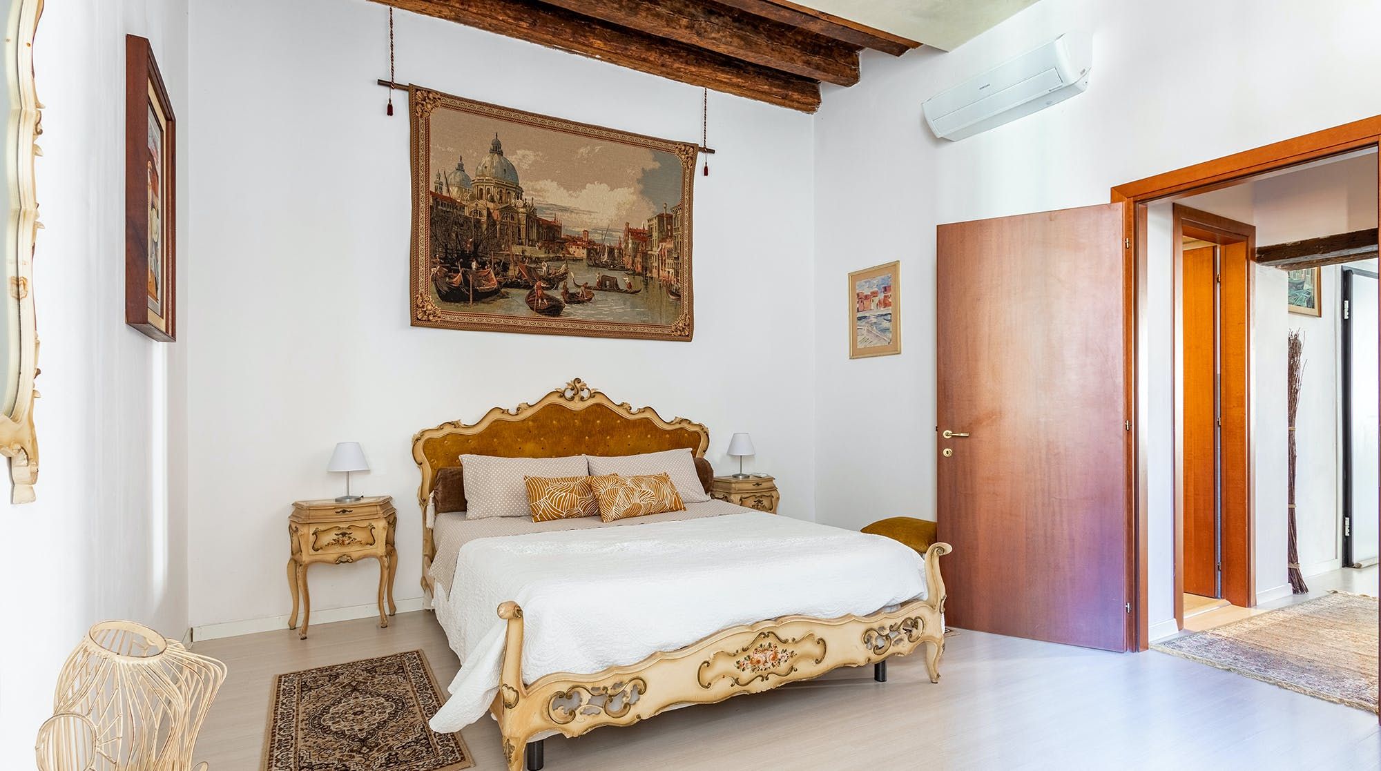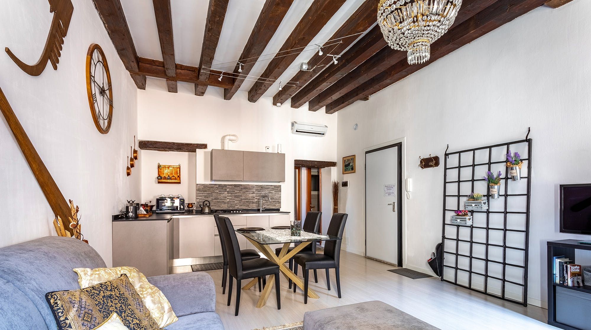 The apartment is calm and quiet, with antique features like the wood-beamed ceilings to remind you of the history of the building, and the city beyond the windows. Antique styling adds to the refined feel of the home – you’ll live like the grand old families of Venice used to.