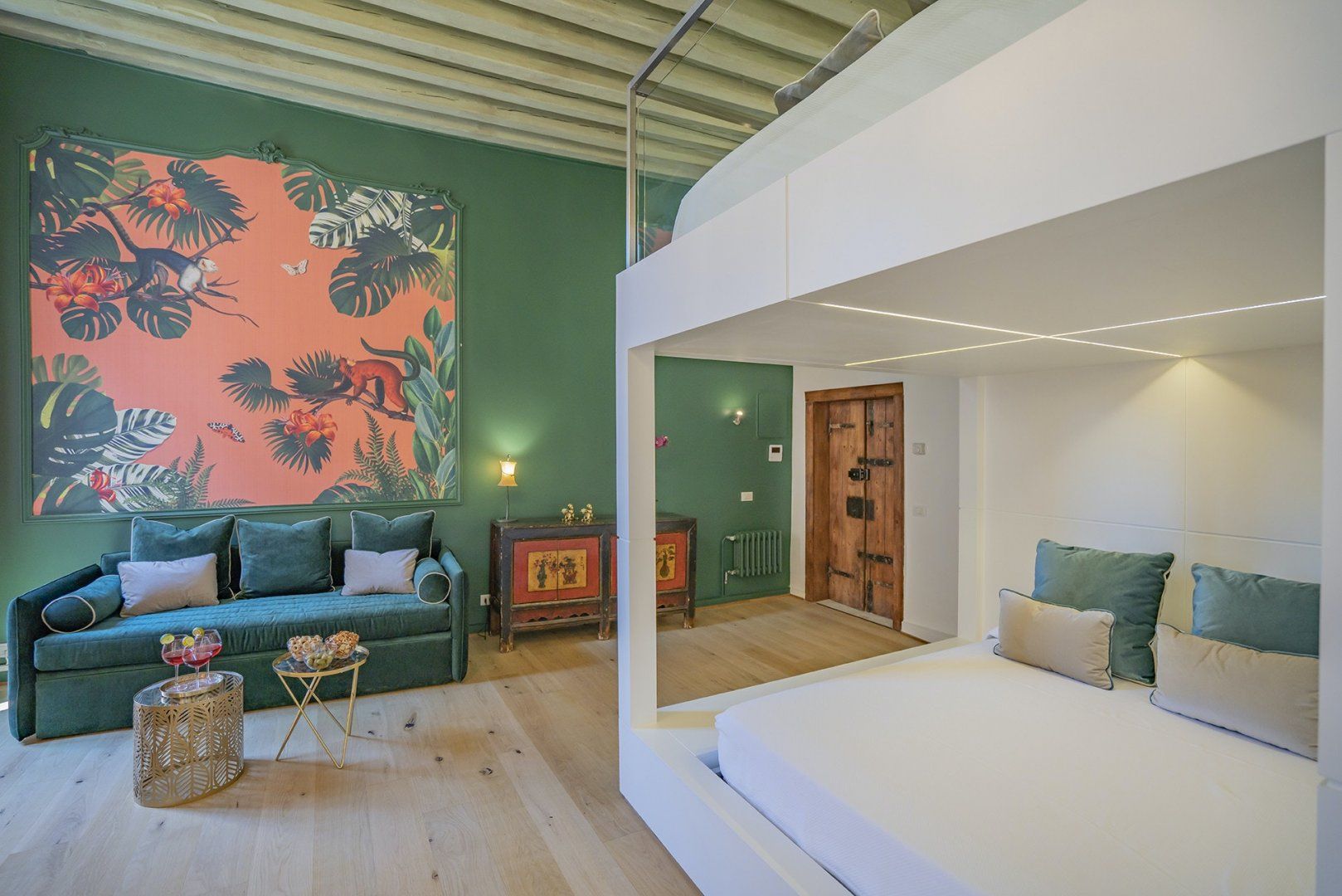 From the Murano glass chandelier to the Rococo-style gilt mirror and huge red-draped windows, this space is full of bold, characterful design and thoughtful details that make it feel as swish as it does comfortable. We love the vibrant jade coloured feature wall with its monkey and montsera illustrations, while the cleverly designed sleeping arrangement over two levels adds to the eye-catching splendour in the main room.