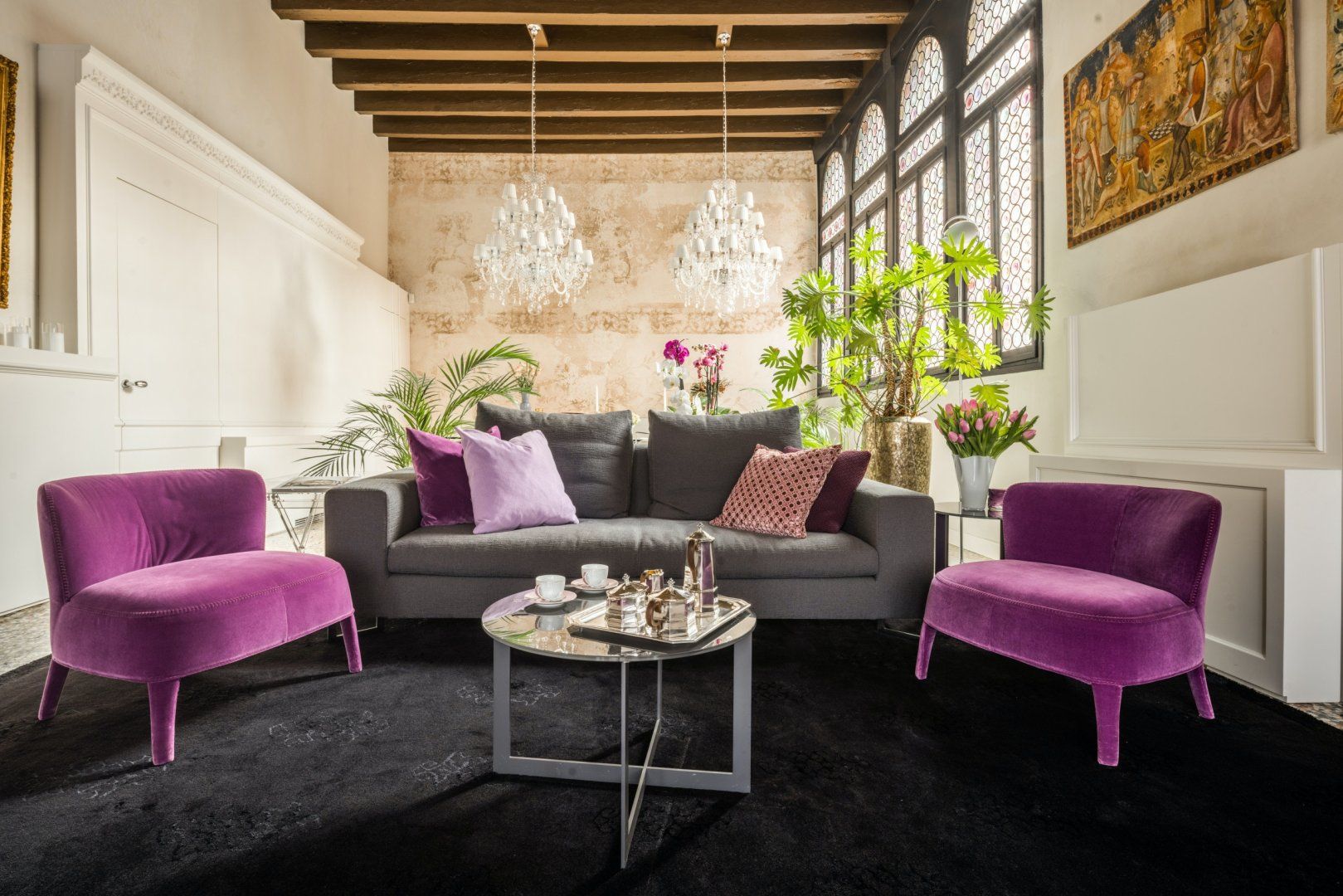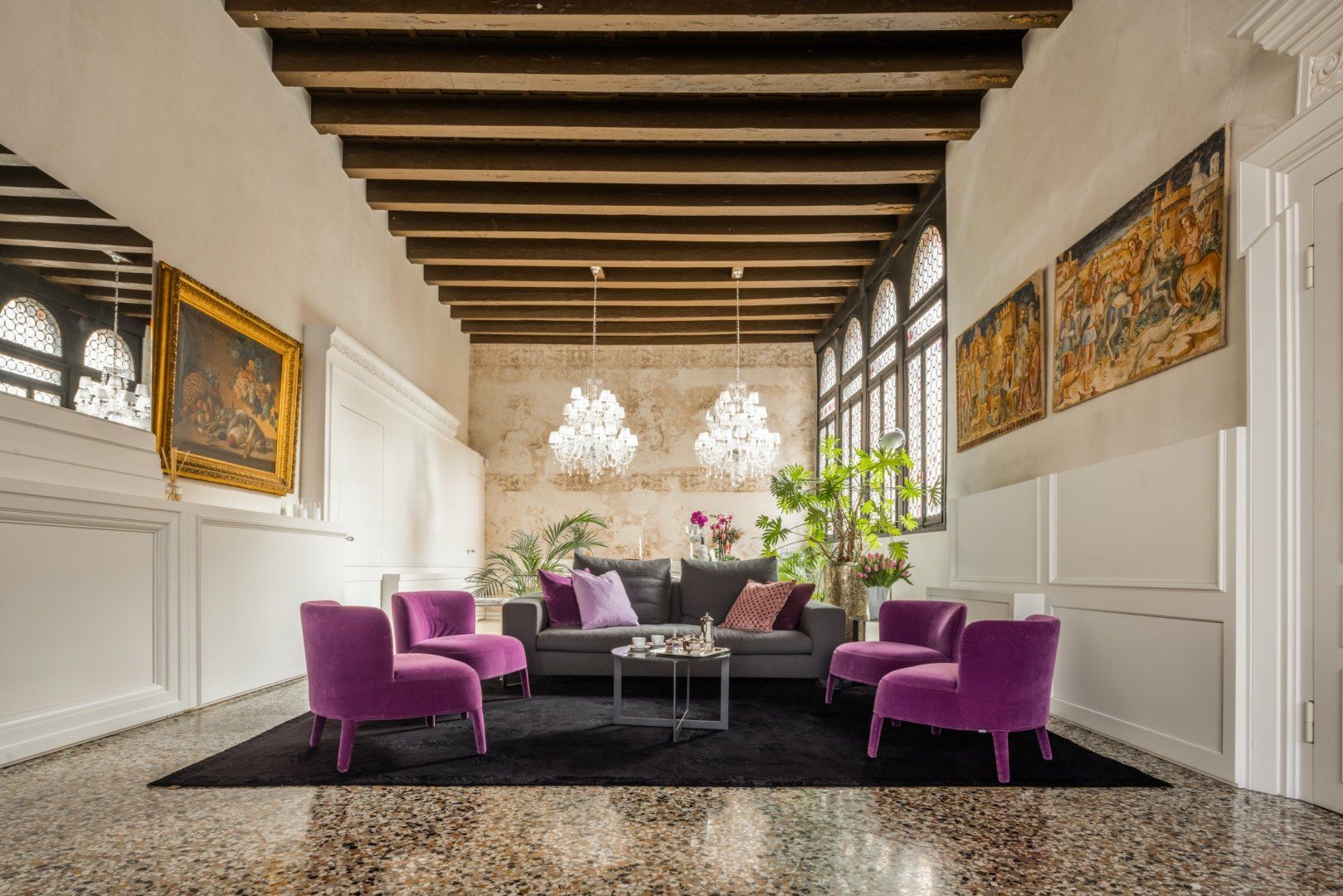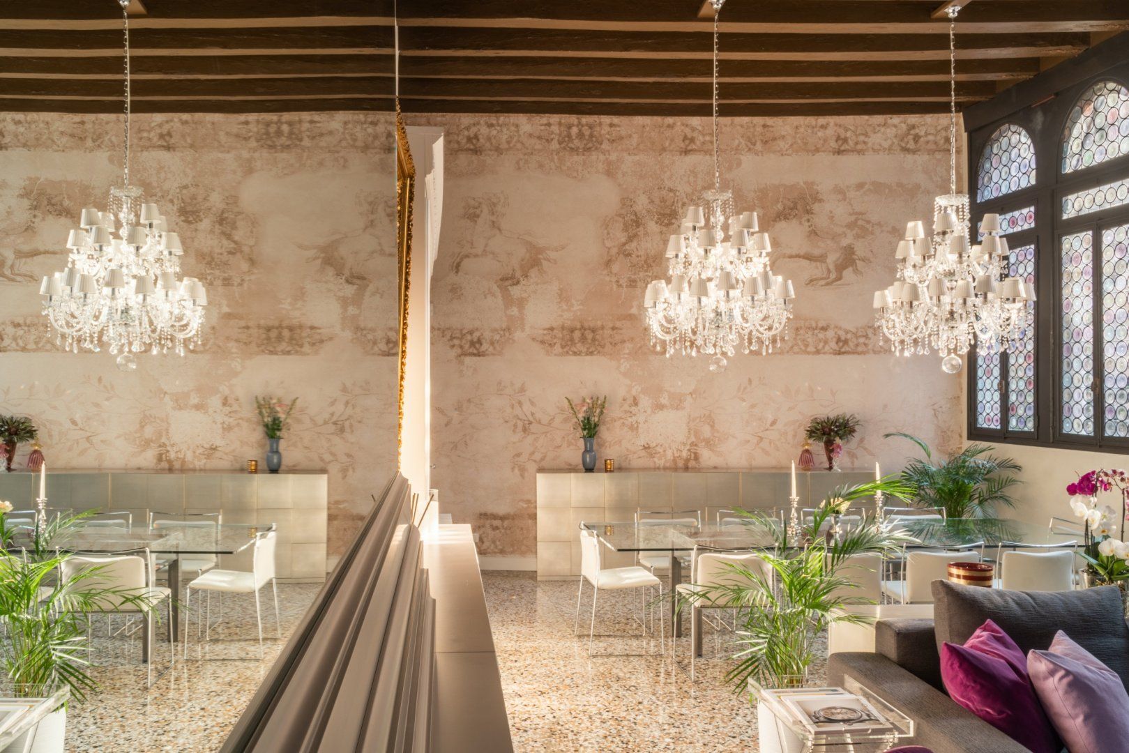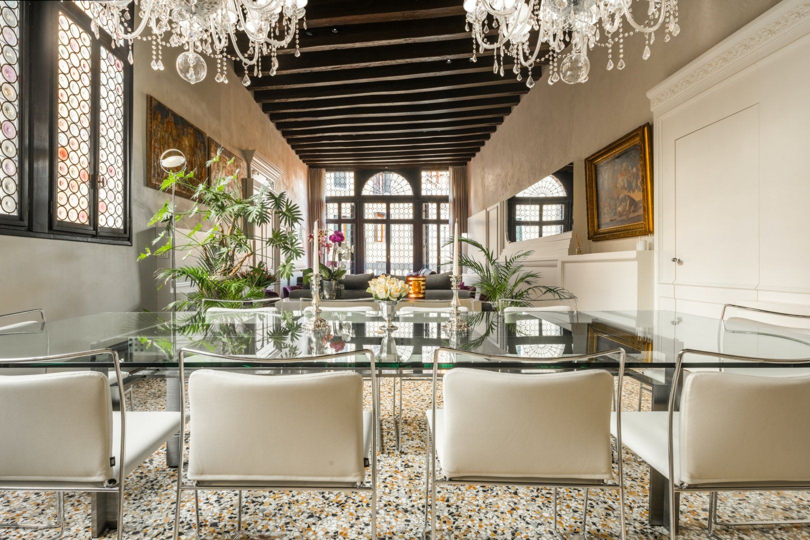 The interior sees a harmonious marriage of state-of-the-art features – including a stainless steel chef's kitchen and contemporary furniture – combined with original features, such as stunning floor-to-ceiling lead windows, preserved fresco remains and exposed beams lining the soaring ceilings.