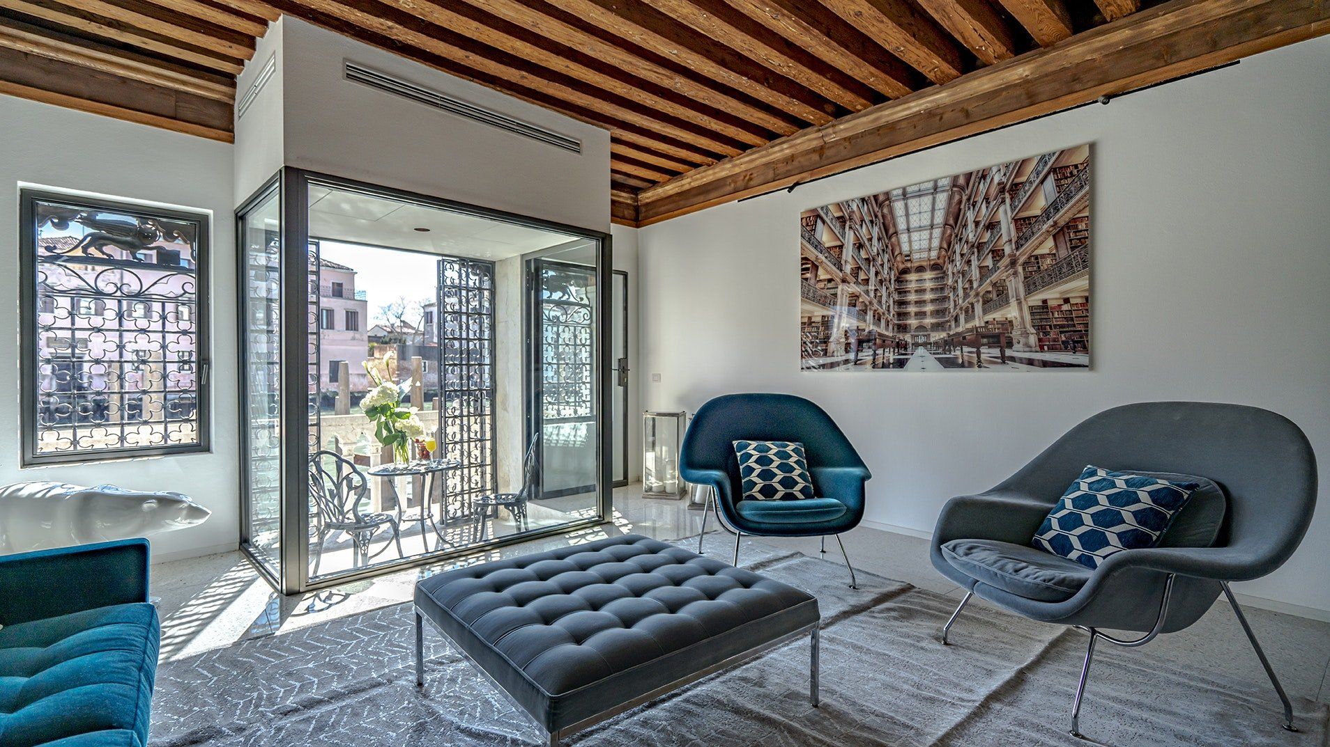 Your living space offers comfortable sofas with a view out to the Canal below. Plus, the partially-covered south-facing terrace features a bistro table where you can sip your morning espresso or enjoy an authentic gelato overlooking the glittering waters of the Grand Canal, and admiring the vista which extends from Ferrovia, the Scalzi and the Church of San Geremia to the right, across to the Fondaco Dei Turchi – Venice’s Natural History Museum – and to the Rialto to the left.