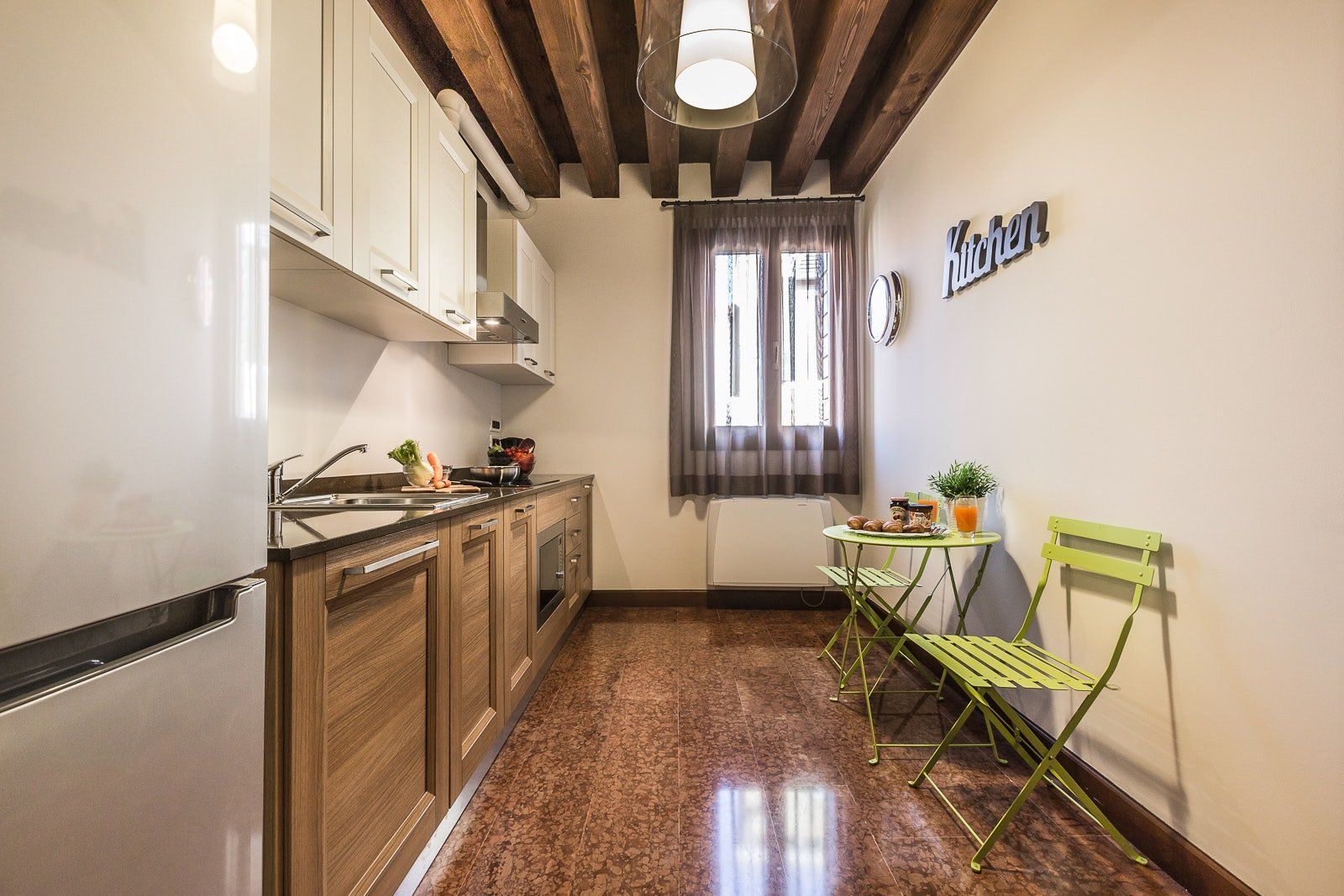 A former monastery for one of the oldest churches in Venice, this building is now home to a batch of cosy and characterful apartments. Head up to the first floor and you'll find this flat, where knotted wood beams, traditional Venetian terrazzo floors and vintage antiques all work together to create a charming place to rest your head. After a long day, sprawl out on the L-shaped sofa with a glass of Italy's finest wine before rustling up pasta or other nibbles in the small kitchen. Come bedtime, unwind with a soak under the lavish rainfall shower, then retire to the comfortable bedrooms for some well-deserved shut-eye.