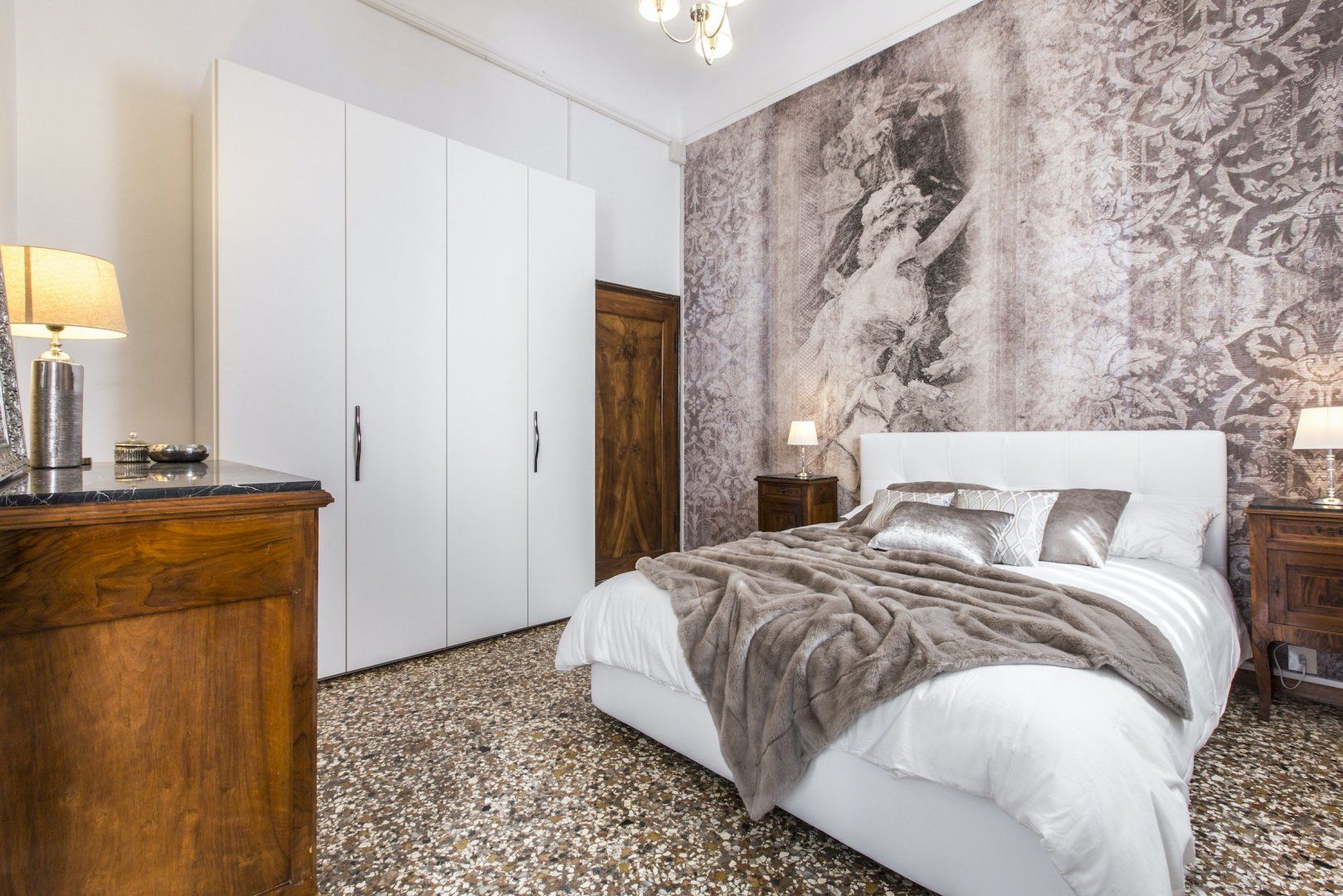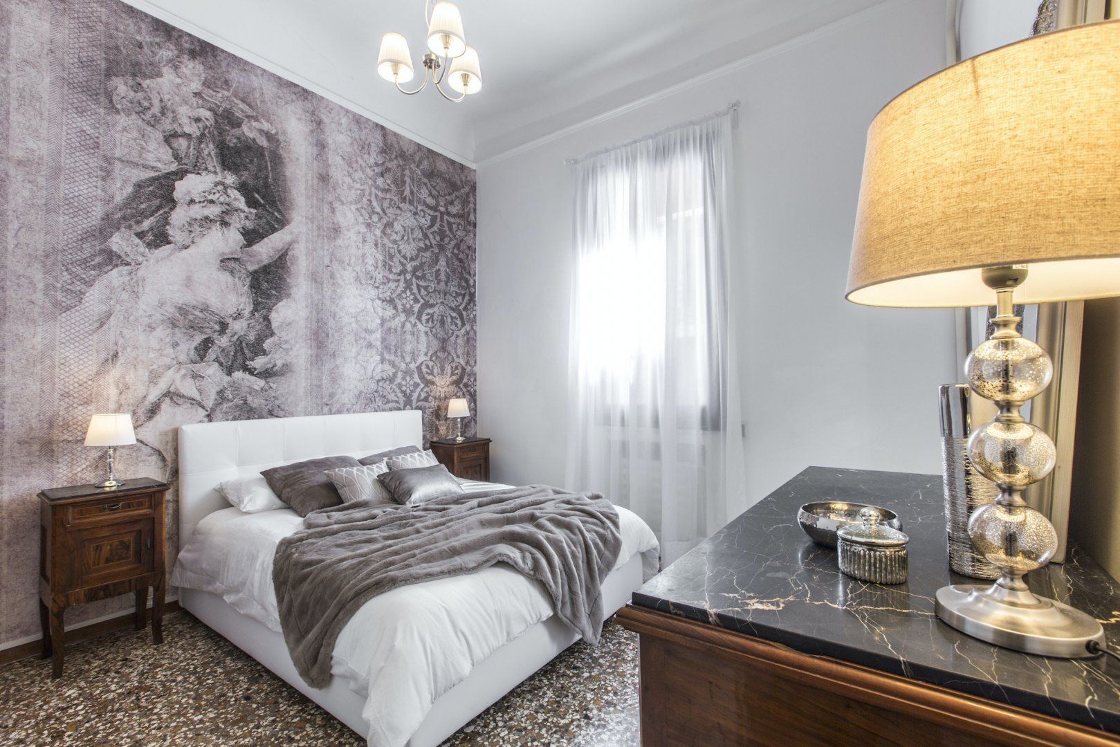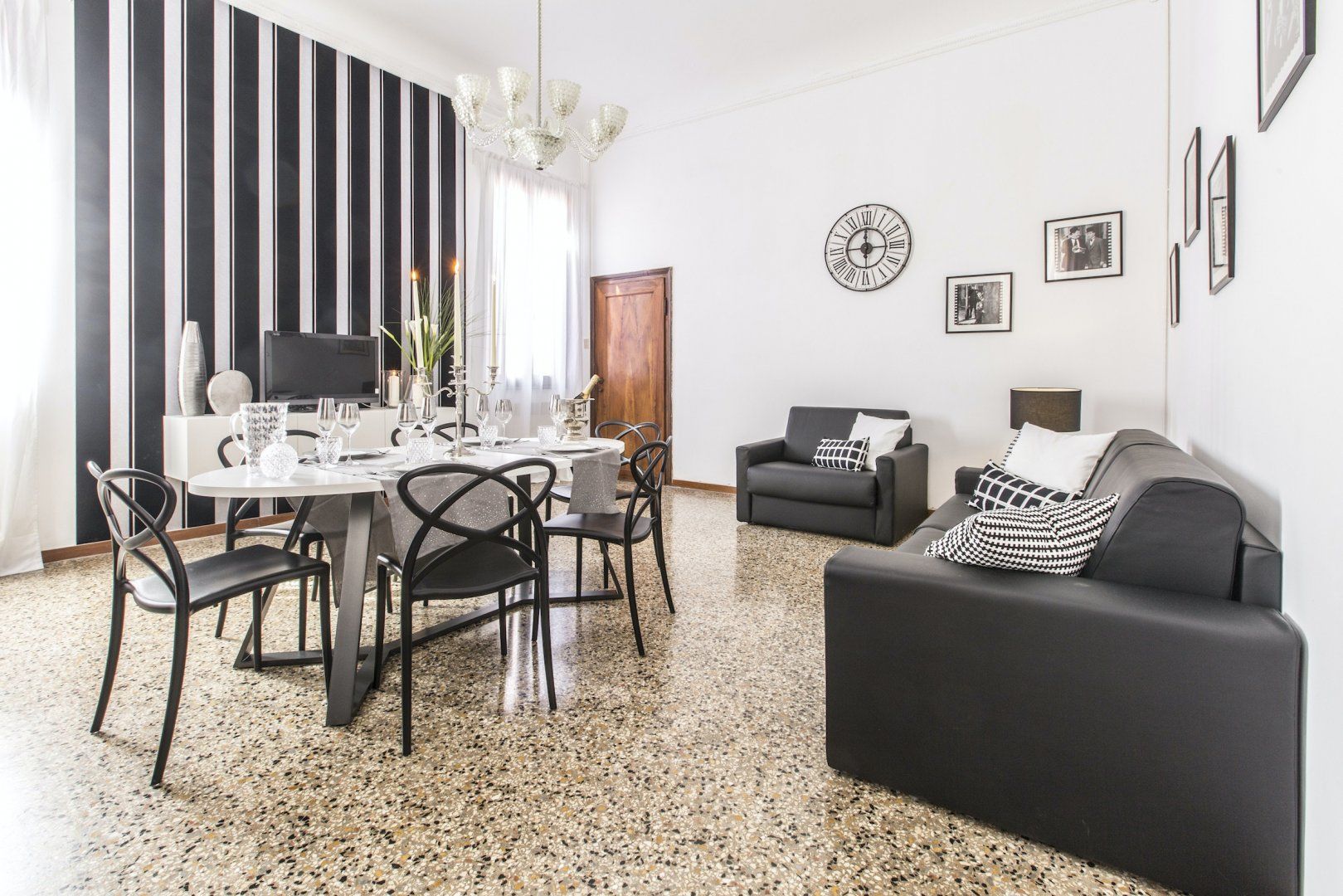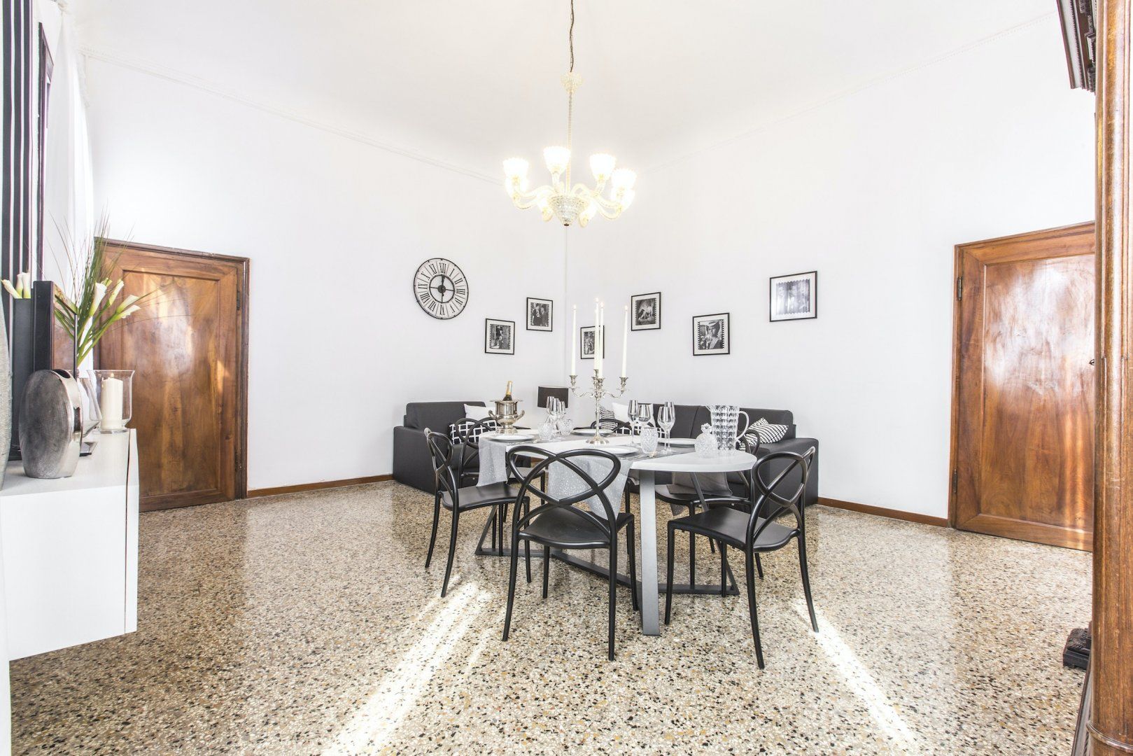 We simply love the cool monochrome palette, and think it contrasts wonderfully with the accents of the original dark wood features and the traditional marble flooring which give the space character. We're already imagining ourselves sipping Aperol Spritz in the grand living spaces before heading out to sample the fayre in some of the nearby eateries. Or, for something more low-key, perhaps enjoying a homecooked meal filled with rich Italian flavours in the elegant dining area.