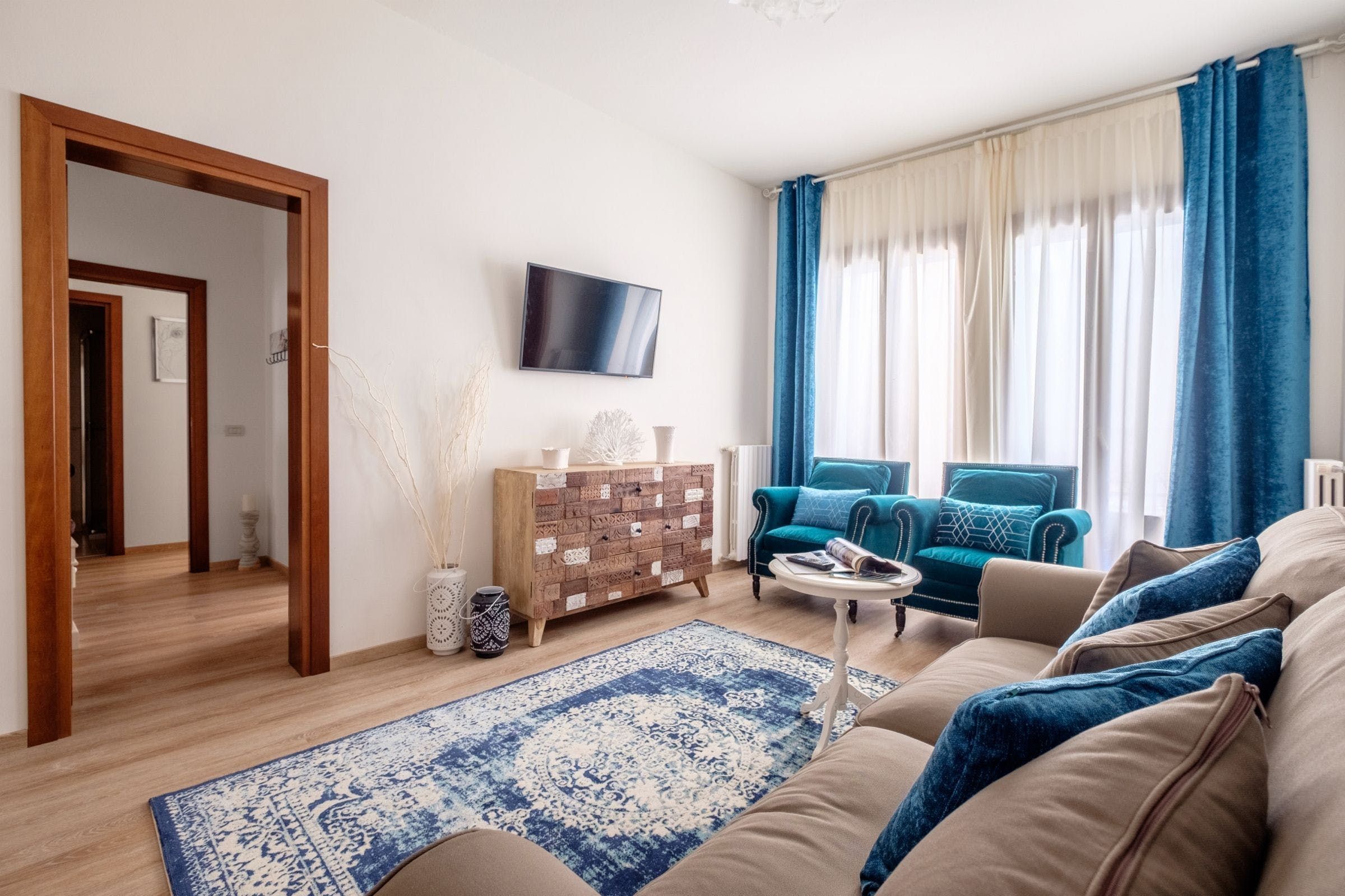 This sophisticated home offers more modern interiors than its ancient neighbouring buildings. We love the sophisticated colour scheme in the bright living space, where greys and blues feel reminiscent of the main feature of the city – its canals. Kick back on one of the rich, teal velvet armchairs with your morning coffee, and open the windows to hear the sounds of the city waking below. Or you could perch at the balconette to feel even more like you're living the Venetian lifestyle.