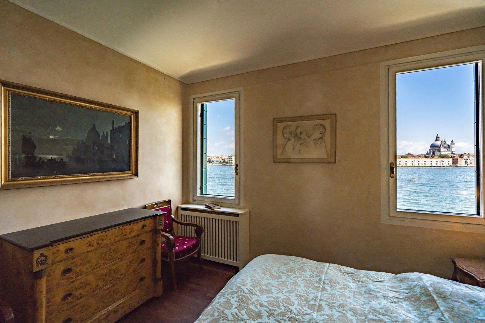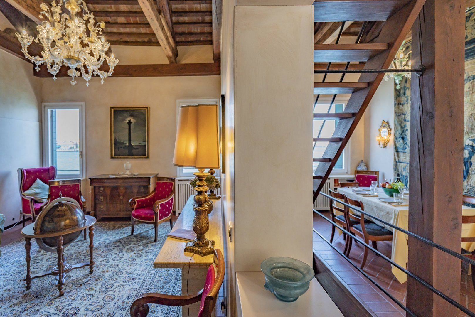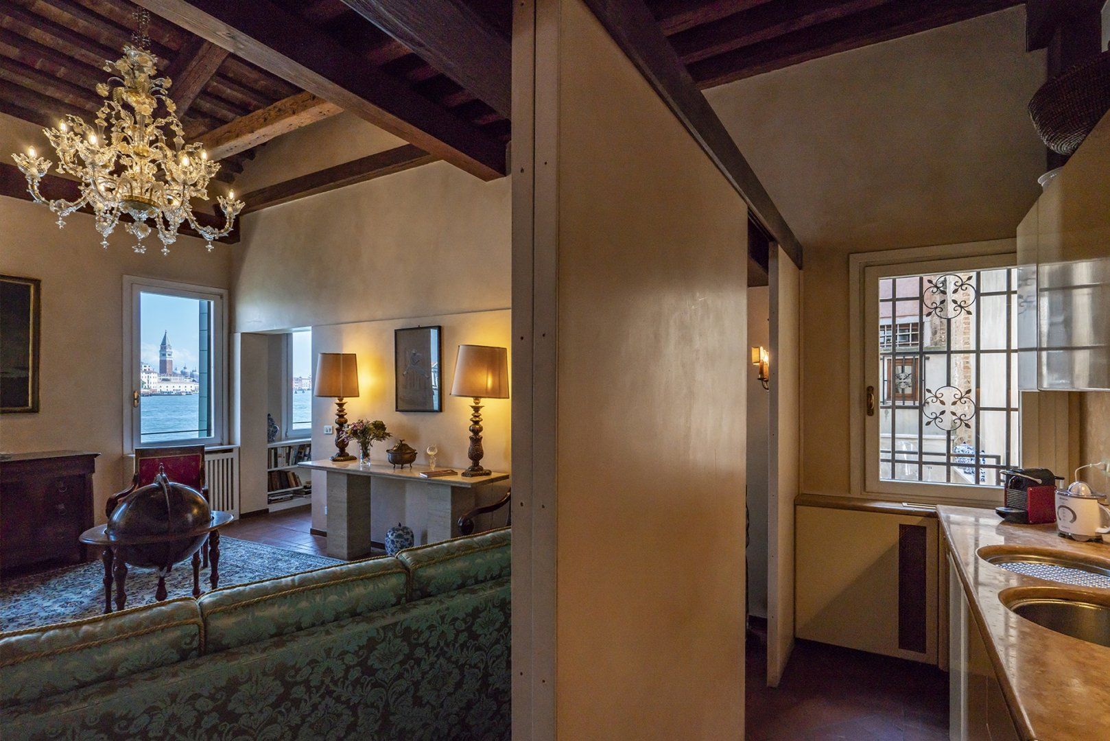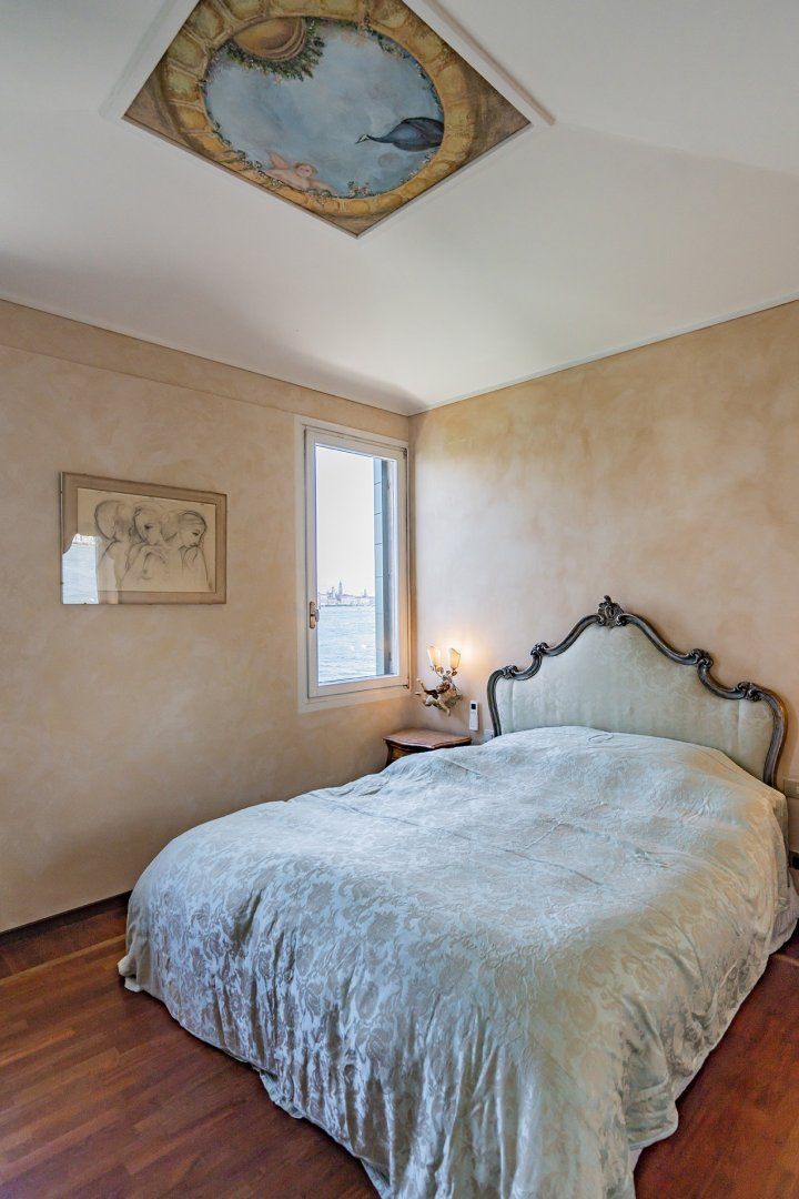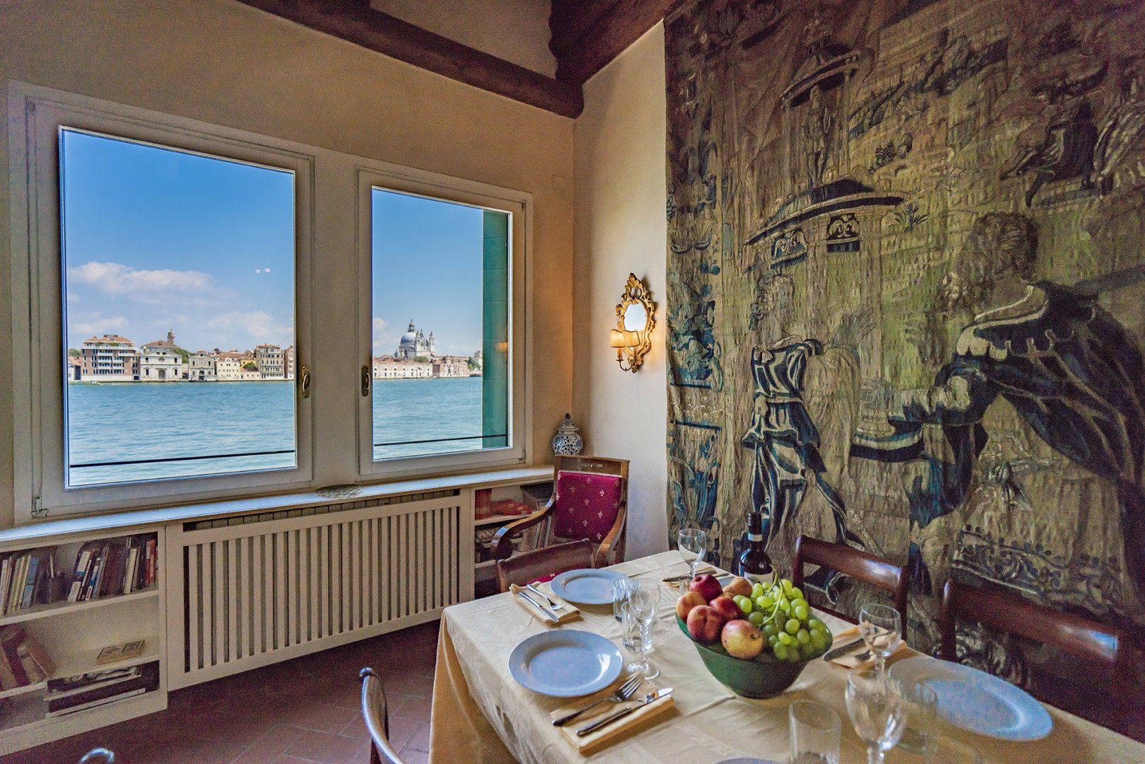 You’ll find ceiling frescoes and tapestries, in addition to a stunning Murano chandelier in the living room. Every nook and cranny has a curio to admire, or artwork to behold. From the glass writing desk, you can see the lagoon below – just imagine how many stories this home has inspired over the years.