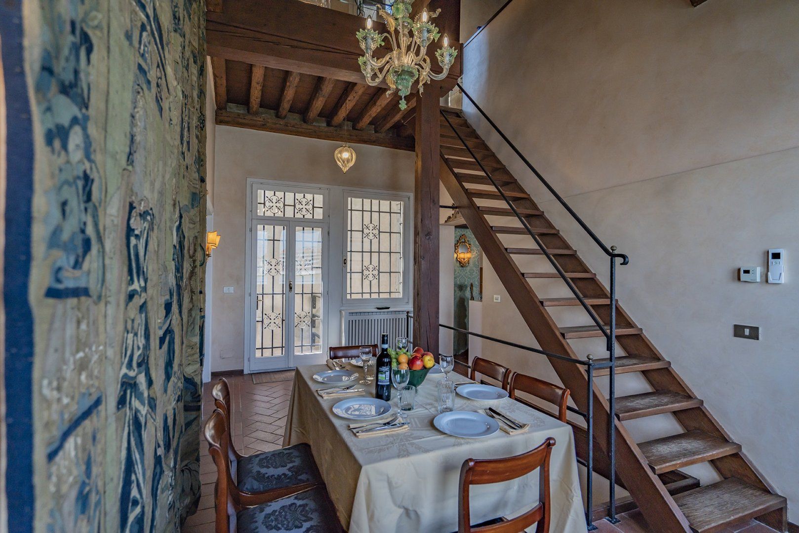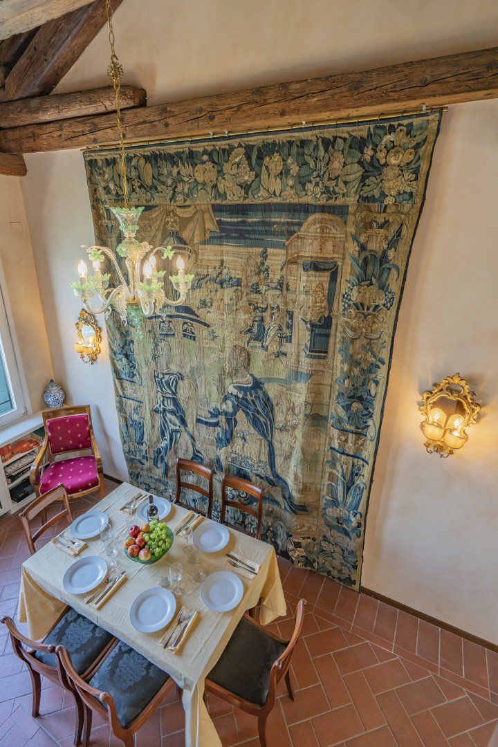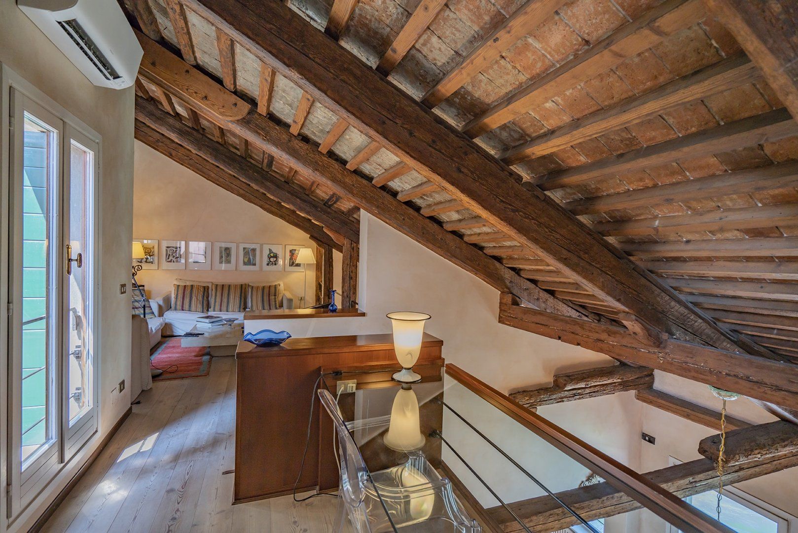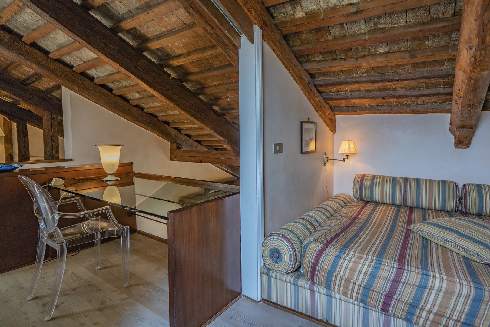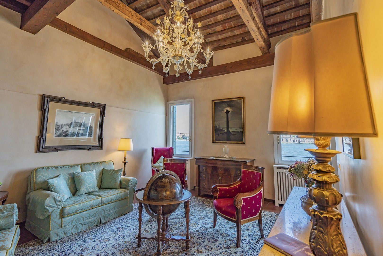 You’ll find ceiling frescoes and tapestries, in addition to a stunning Murano chandelier in the living room. Every nook and cranny has a curio to admire, or artwork to behold. From the glass writing desk, you can see the lagoon below – just imagine how many stories this home has inspired over the years.