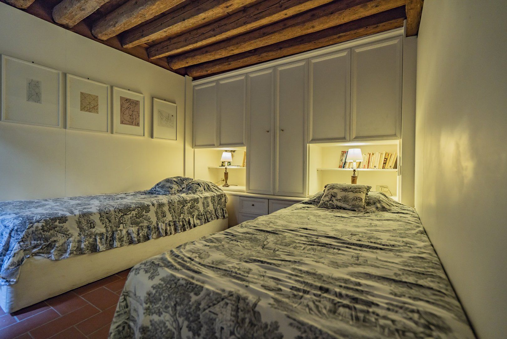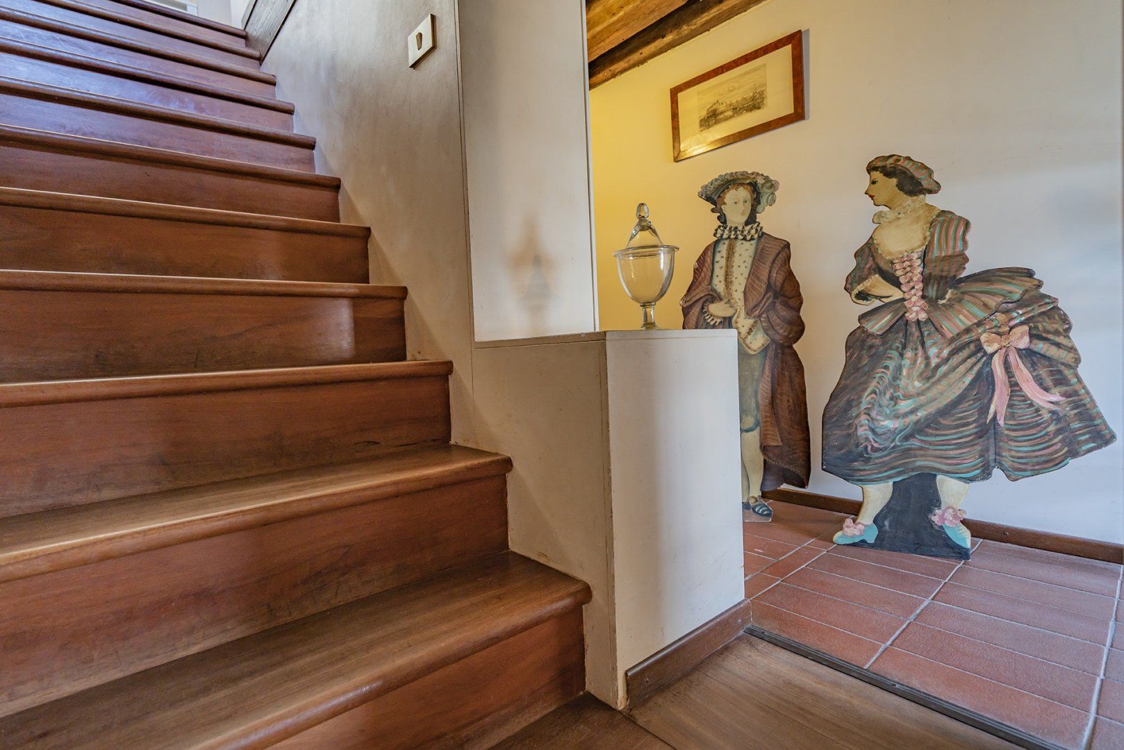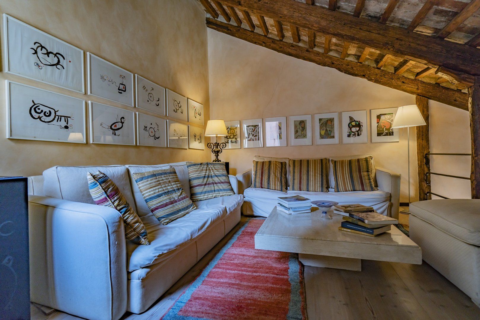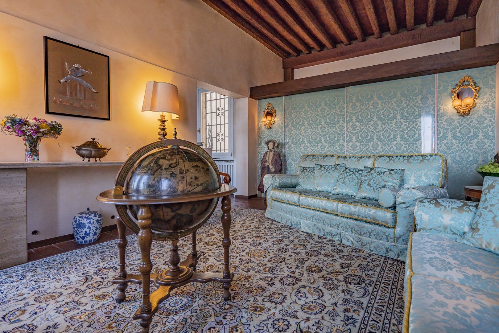 You’ll find ceiling frescoes and tapestries, in addition to a stunning Murano chandelier in the living room. Every nook and cranny has a curio to admire, or artwork to behold. From the glass writing desk, you can see the lagoon below – just imagine how many stories this home has inspired over the years.