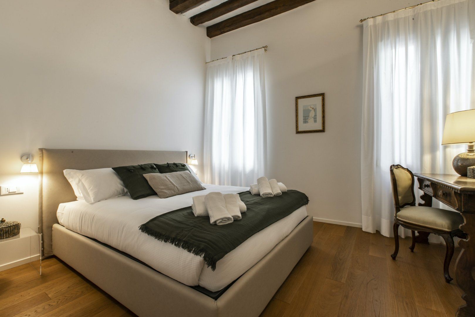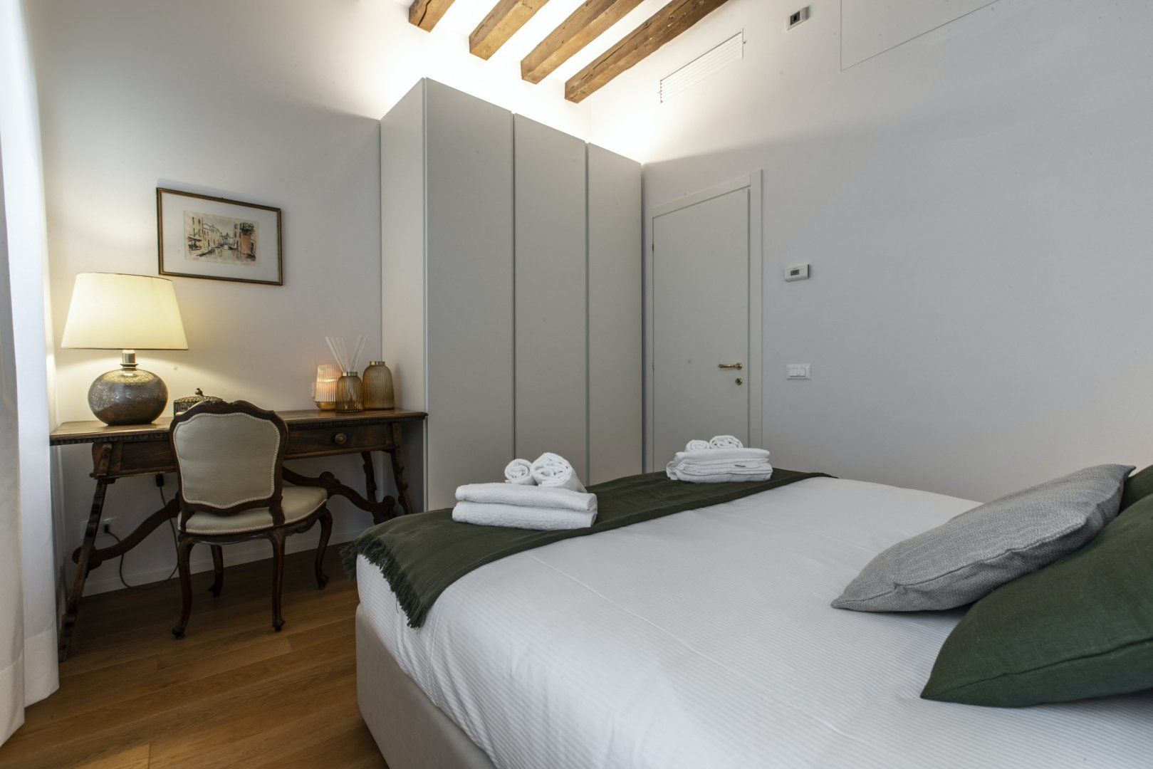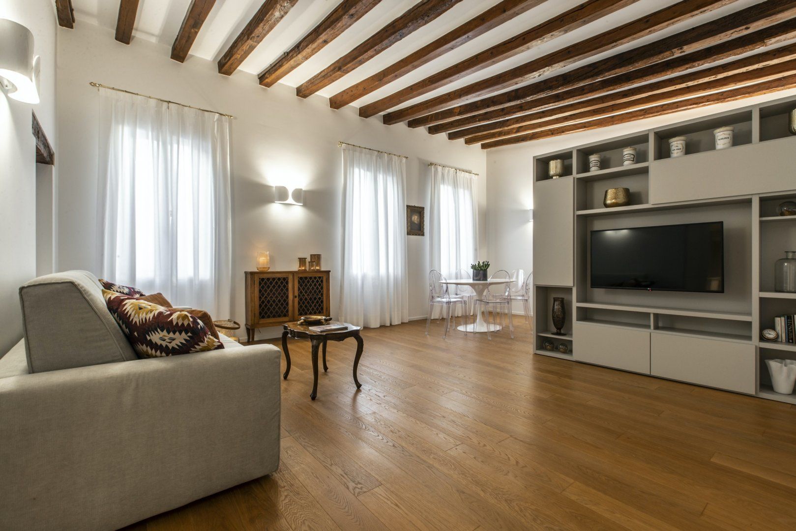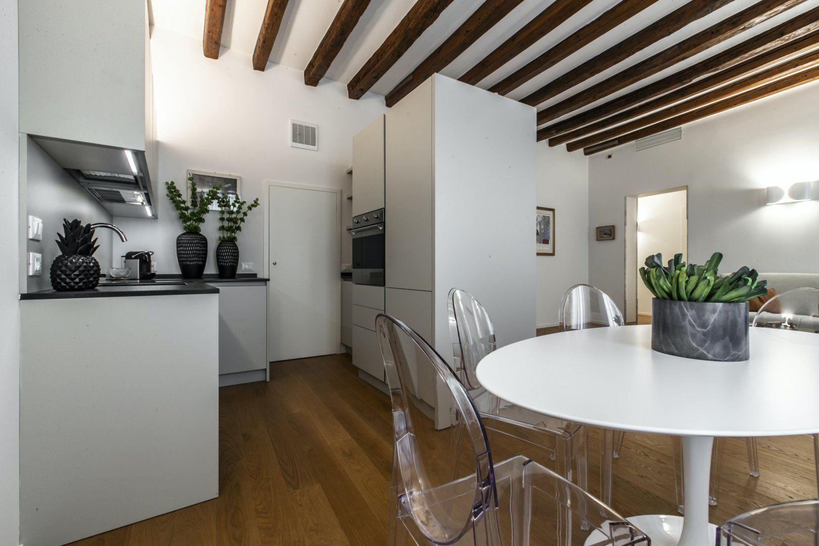 Inside a historic building near Piazza San Marco, this apartment combines modern living with original features seamlessly. The wooden ceiling beams and mix of vintage and contemporary furniture create a cosy space, but the best thing about this home lies just outside. Open the window and you can watch the gondolas sail along Venice's world-famous canals, so location-wise it’s ideal if you’re keen on staying in a central spot. There’s a full kitchen here, giving you the option to cook with the amazing ingredients you can buy from the city's incredible array of shops.