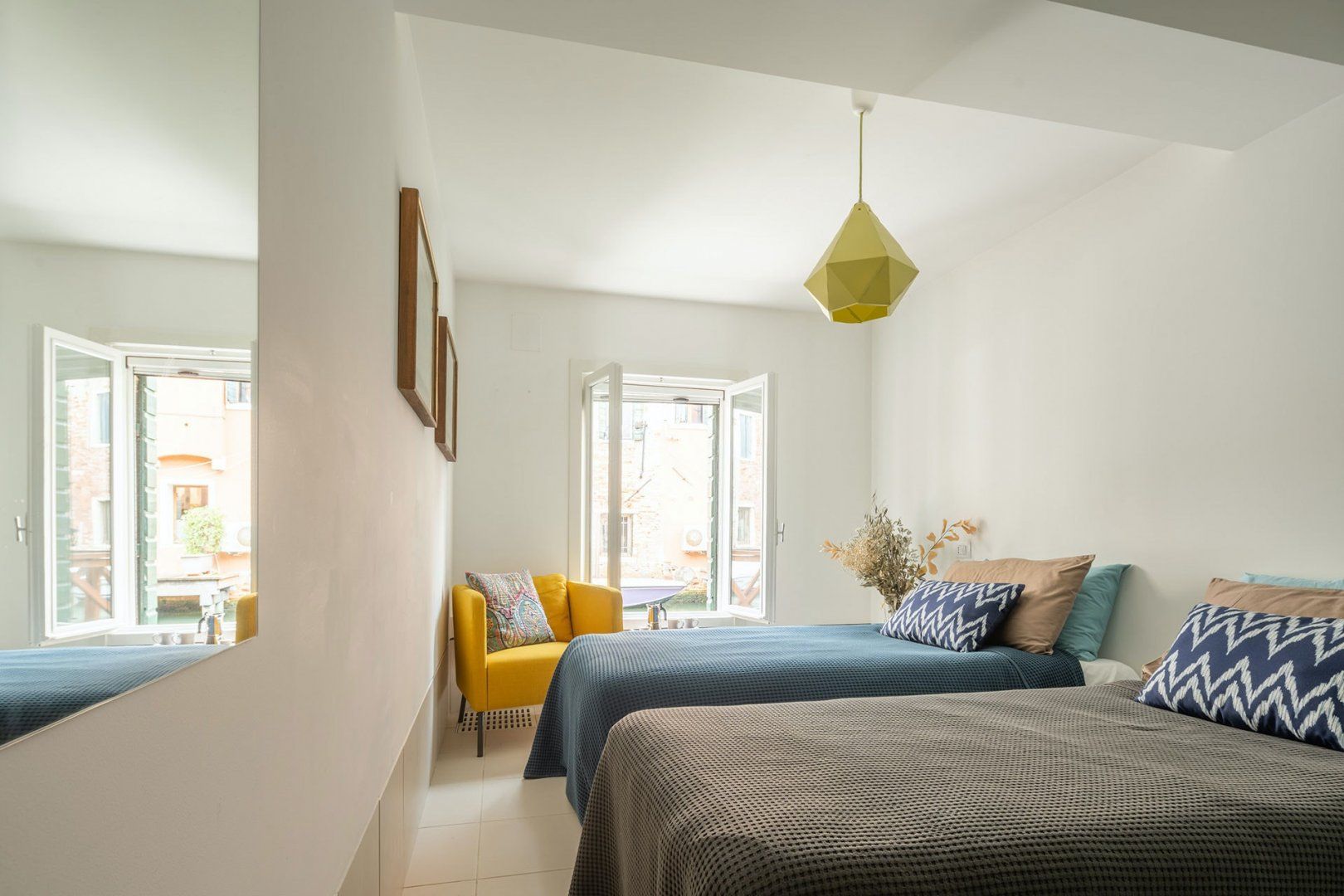 On the border between Santa Croce and San Polo, this stylish apartment offers the ultimate Venice experience. Every window offers views of the canal, and the home can be easily reached via water taxi, making it a convenient option for exploring the city. The interiors are colourful and contemporary, featuring a fully-equipped kitchen if you prefer to eat at home. The highlight here, however, is the little wooden terrace. Directly on the water, it’s a great spot for a couple to spend their evenings.