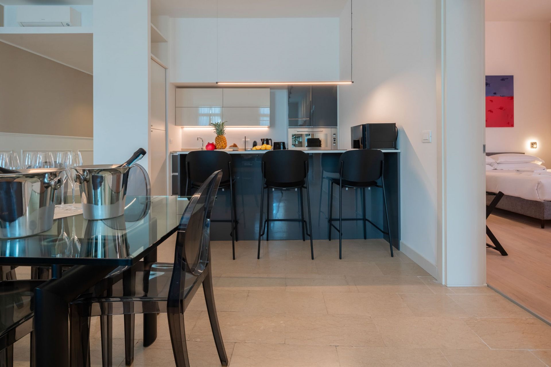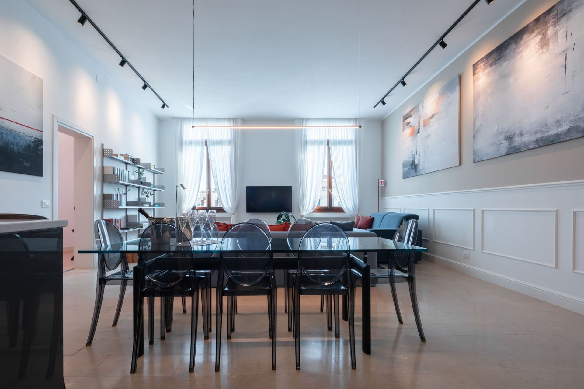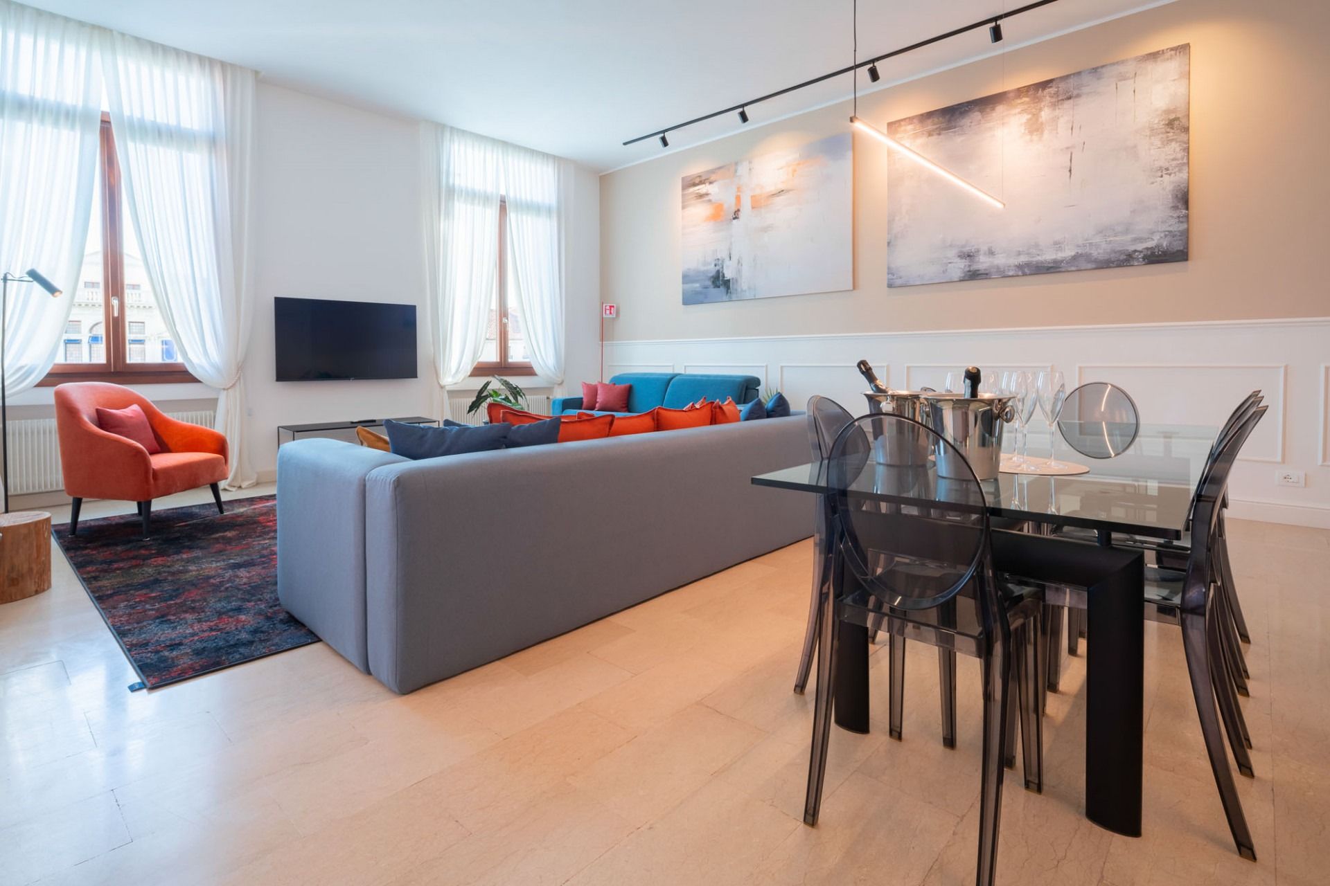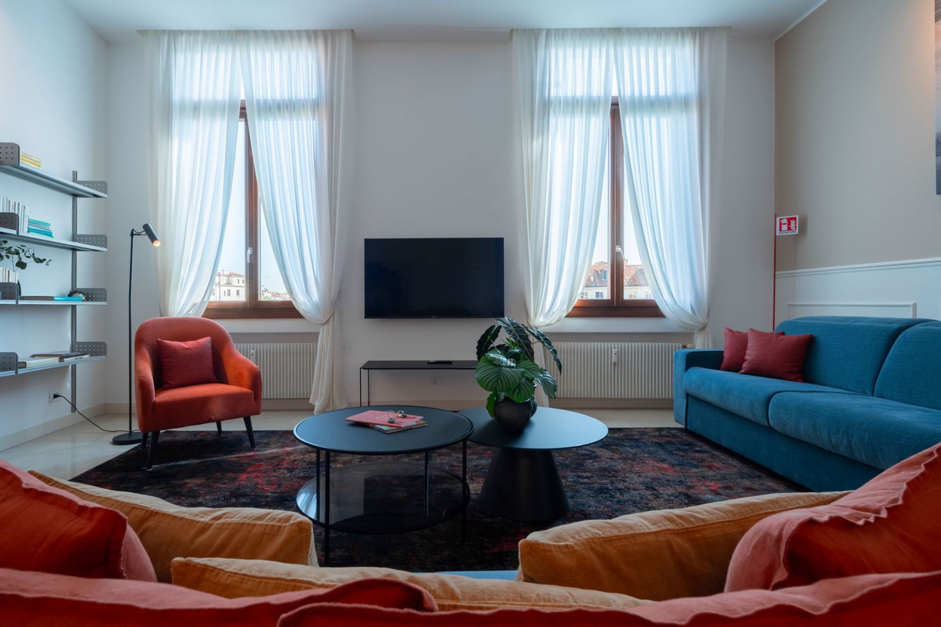 This modern Venetian apartment sits right on the canal with views of turquoise waters and passing gondolas. Housed in an old Venetian apartment building, it's got high ceilings and tall windows for the best glimpses of the surroundings. The open kitchen makes it easy to gather over hearty breakfasts before a day of exploring. When you're ready to venture out, step out the door and into a gondola to visit landmarks like the Basilica, before winding down the day in a local waterside trattoria.