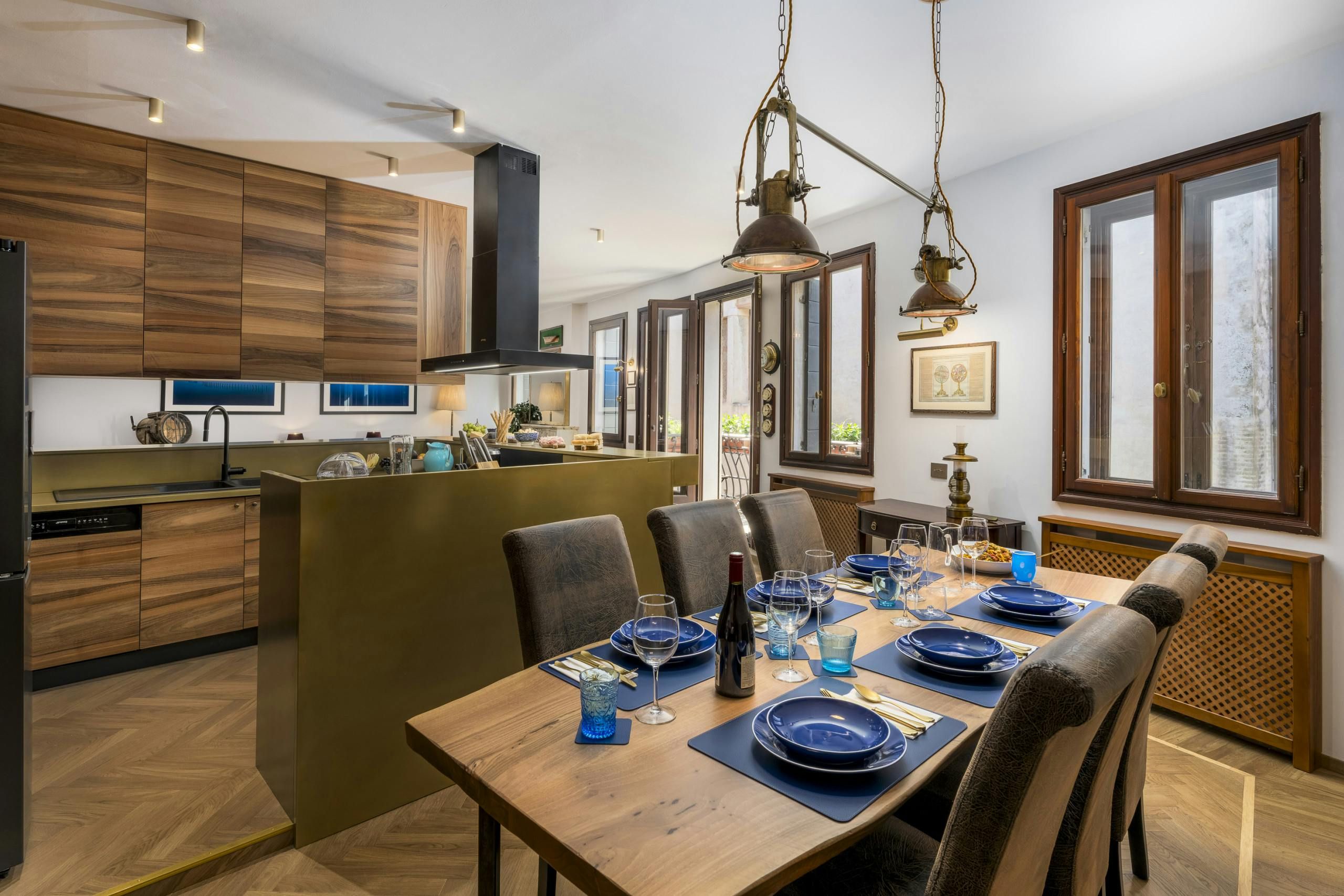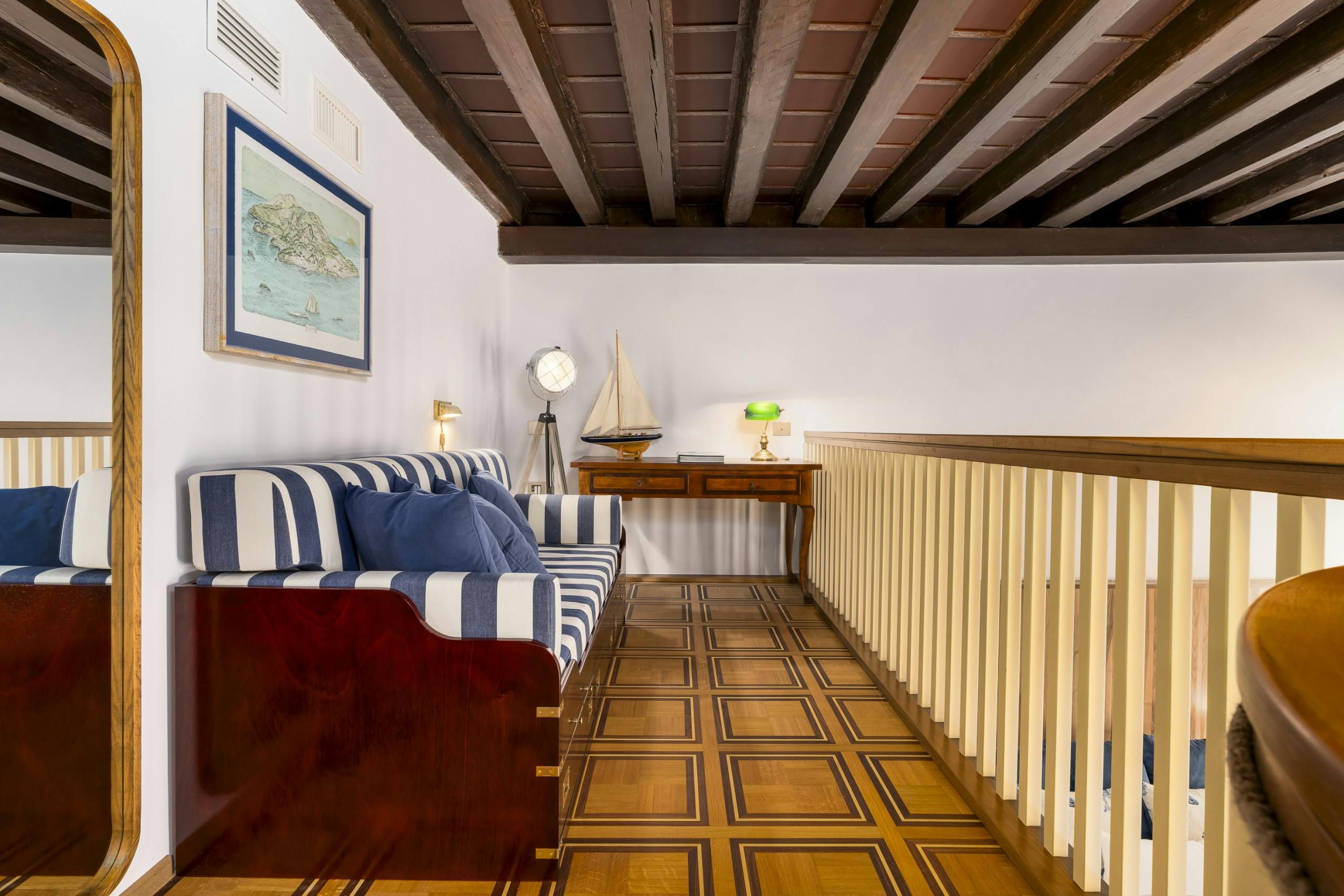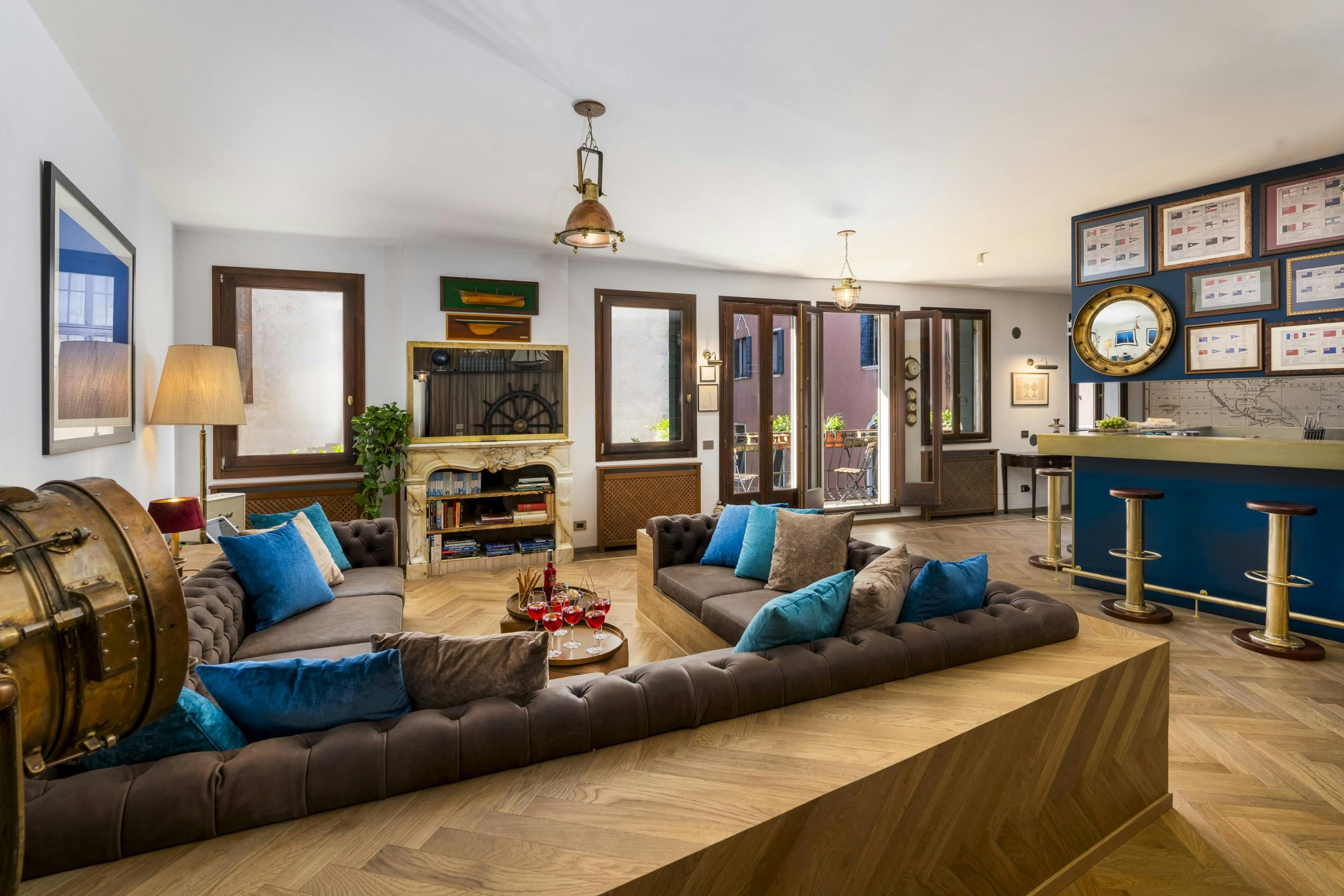This stunning home is a unique find. It’s owned by a husband and wife who double as a professional superyacht captain and chef, and has been designed with traditional yacht clubs in mind. Unsurprisingly, there’s an abundance of nautical influences and maritime antiques throughout the home. One of the showstopping features is a wood-beamed hideaway with a bar and pool table, and another is the balcony that looks out over gondolas gliding by. Location-wise, this home couldn’t be any better – Rialto Bridge is less than five minutes away, and you can reach St Mark’s Square in ten minutes.