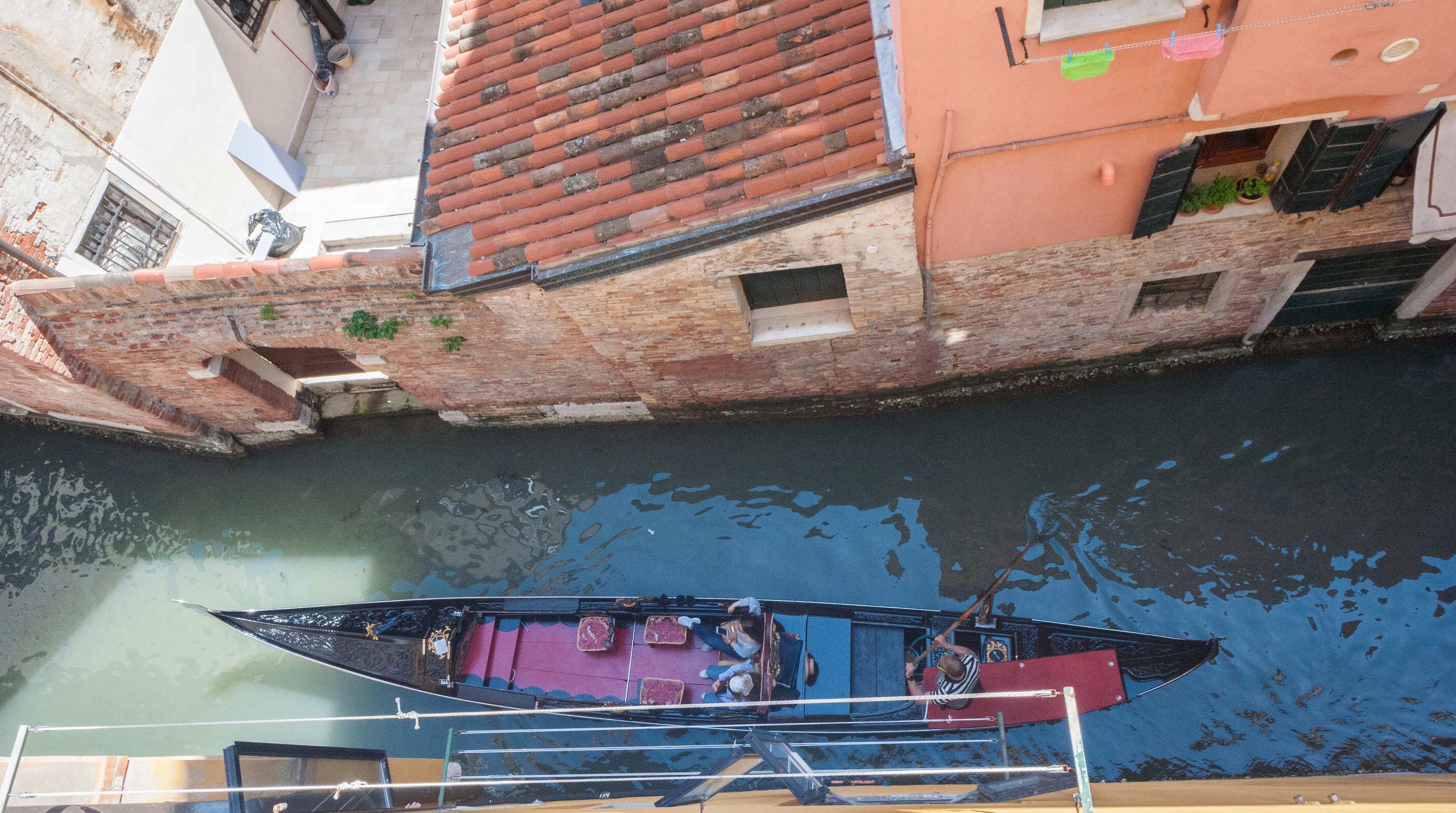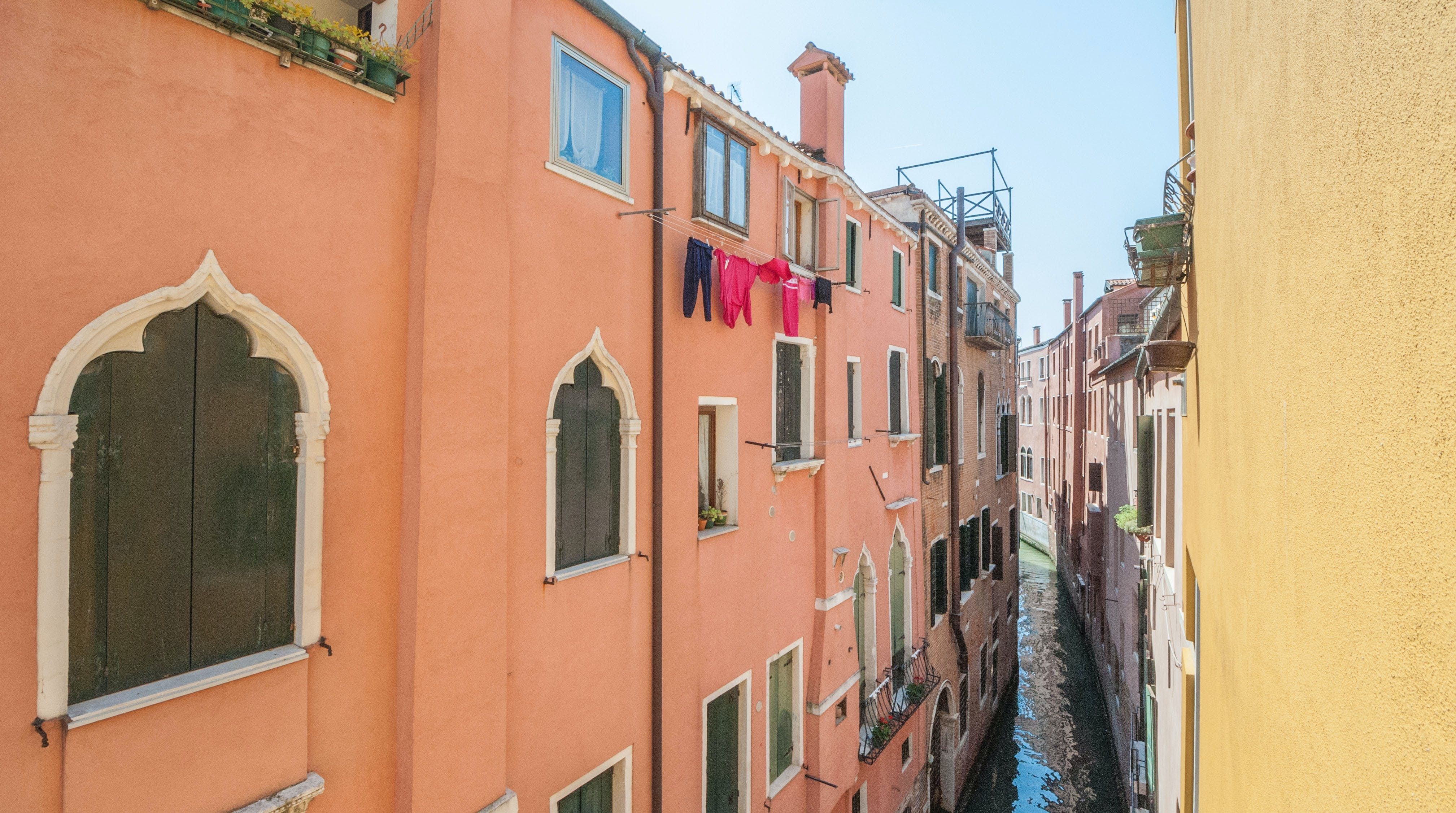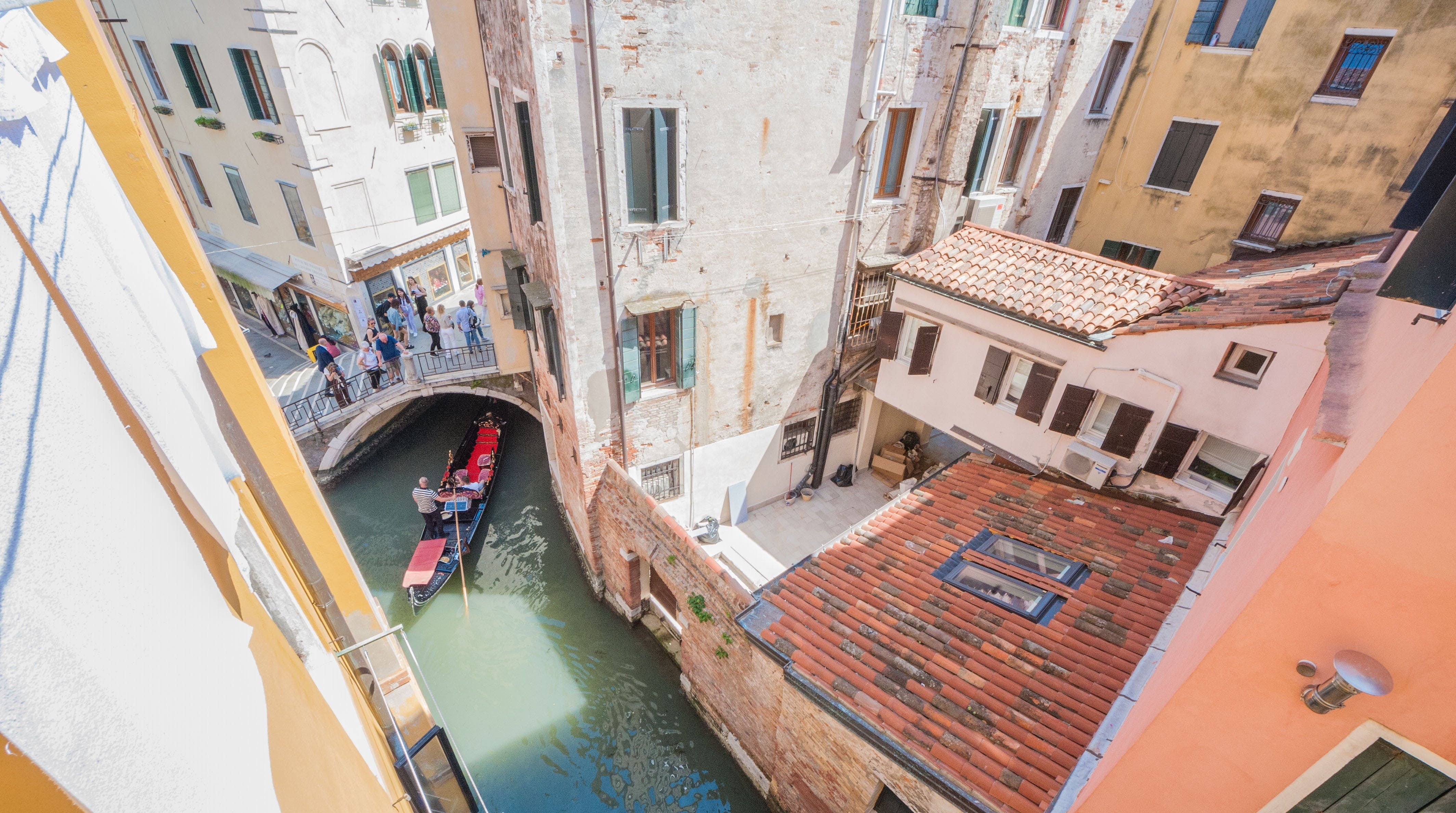 Your third-floor vantage point offers views over a buzzing piazza and imposing clock tower to one side and an elevated vantage point over a canal to the other. Venice is unusual in that there's no car traffic here. Instead, you can open up the windows and take in the many traditional sounds of the city, including church bells, bustling street markets, and gondoliers singing as they cruise by.