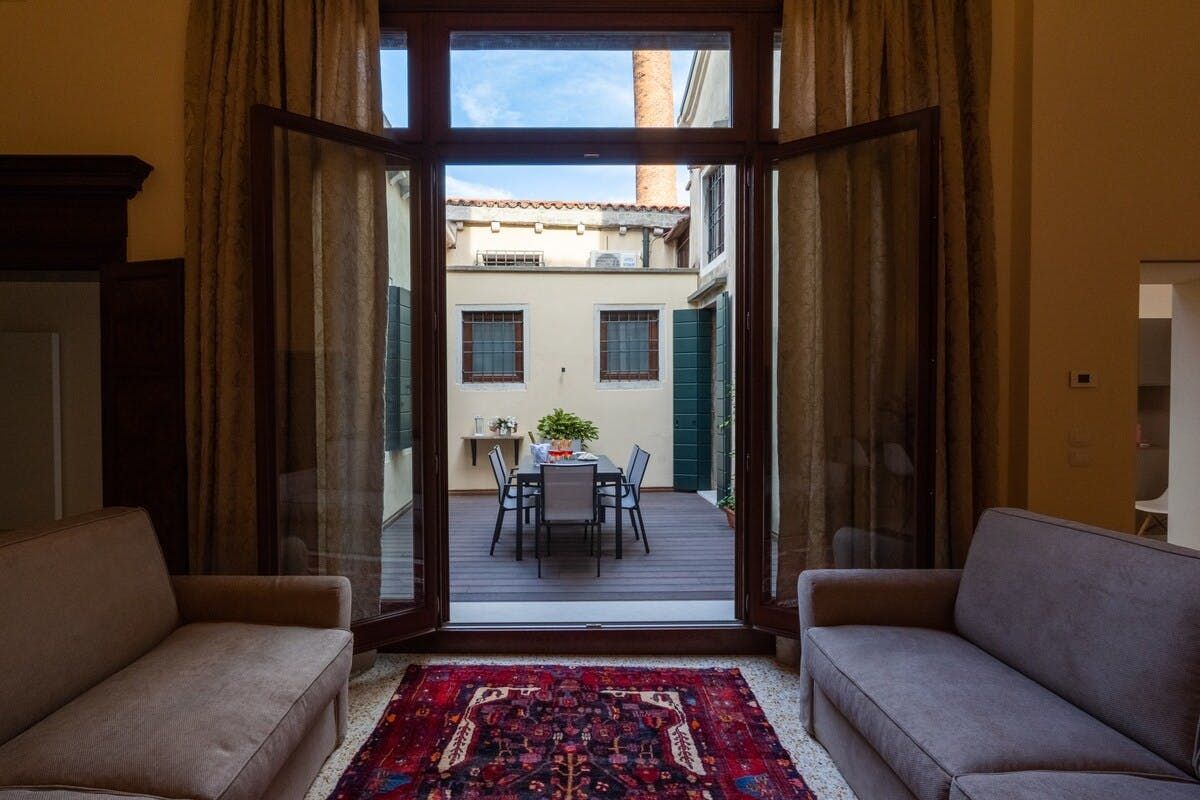 Tucked away down a quiet street in Cannaregio, this sophisticated Venetian apartment is an oasis of calm in the heart of the Serenissima. Boasting a secluded communal courtyard and private terrace – ideal for early evening aperitivos – this elegant homestay is the perfect setting for your next group holiday, offering plenty of space to unwind after a long day of sightseeing. Put your feet up in the cosy living room where simple furniture is brought to life by unique design accents, or settle into the master bedroom and feast on views of the historic Madonna dell'Orto.