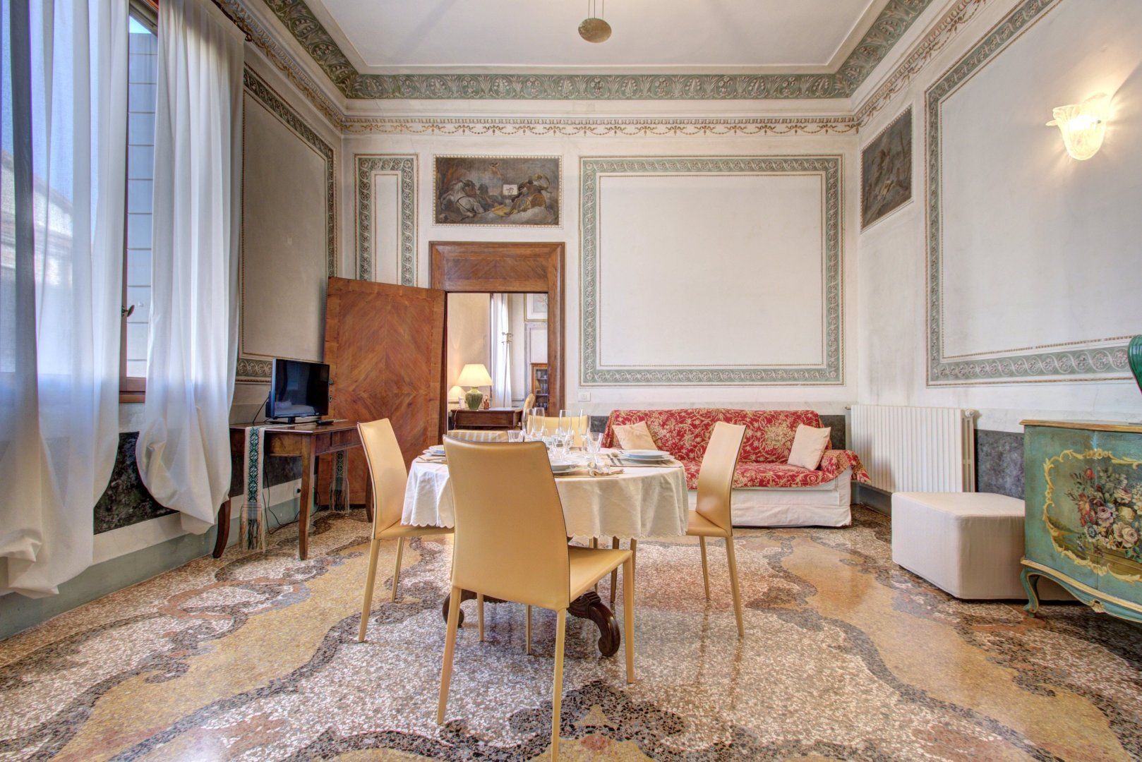 The apartment itself is all frescoed ceilings and shining marble floors. Hand-painted dressers and antique furniture matches the historic surroundings and high ceilings add a sense of opulence. In the master bedroom, a plush tufted headboard feels palatial beneath a painted medieval motif on the wall and the circular fresco on the ceilings could belong in a museum.