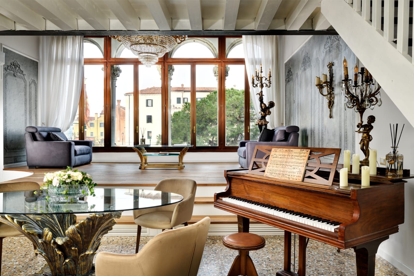This stunning home is housed in a historic palazzo in the heart of Venice, with incredible canal views. The grand living room, with its piano and chandelier, is elegant and refined – it’s the perfect place to sip wine and watch gondoliers pass by. There’s also a fully-equipped kitchen stocked with state-of-the-art appliances, Venetian porcelain dishes, and golden cutlery. A private office makes remote working a breeze. You’ll be close to St Mark’s Square, Rialto Bridge, and vibrant local markets.