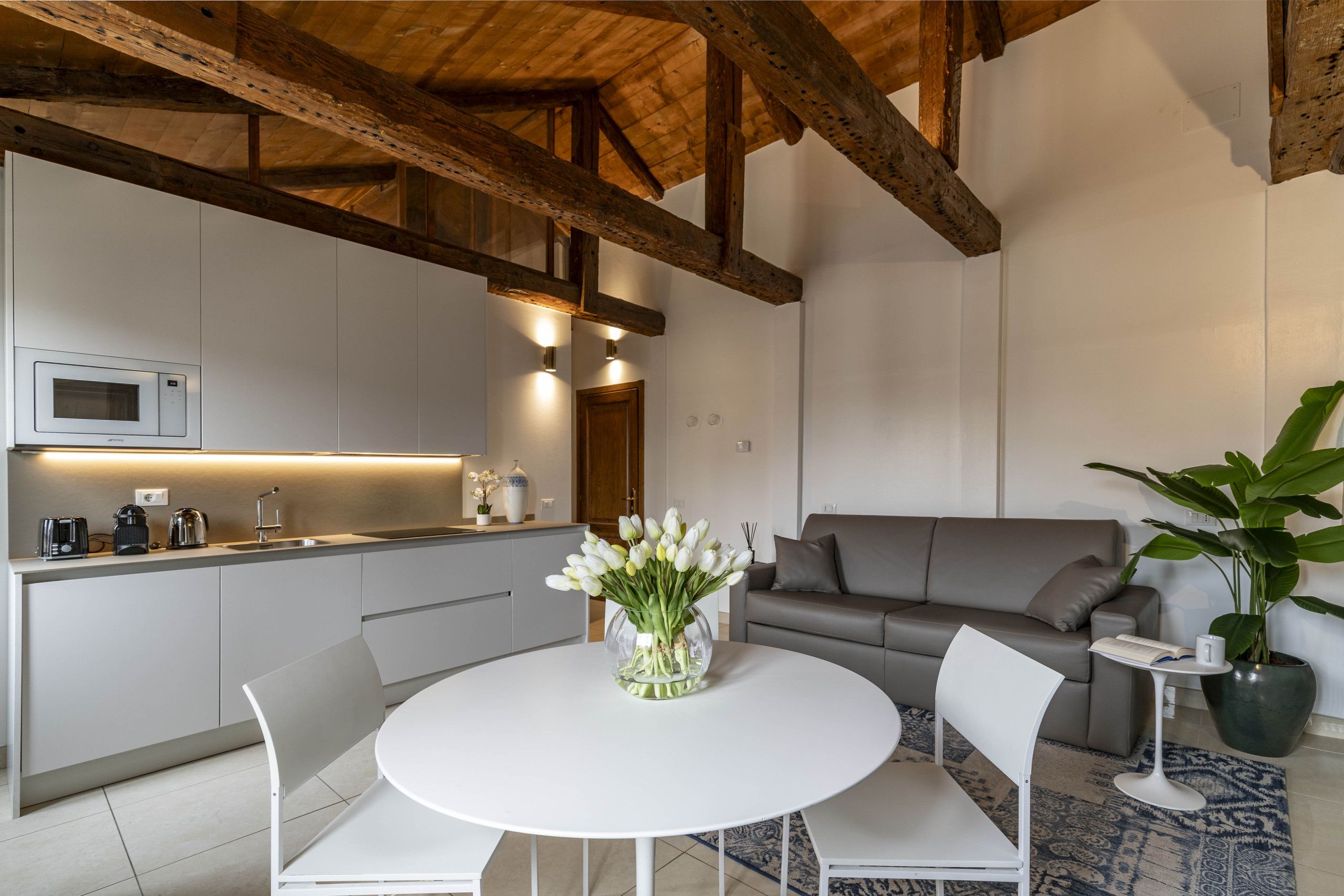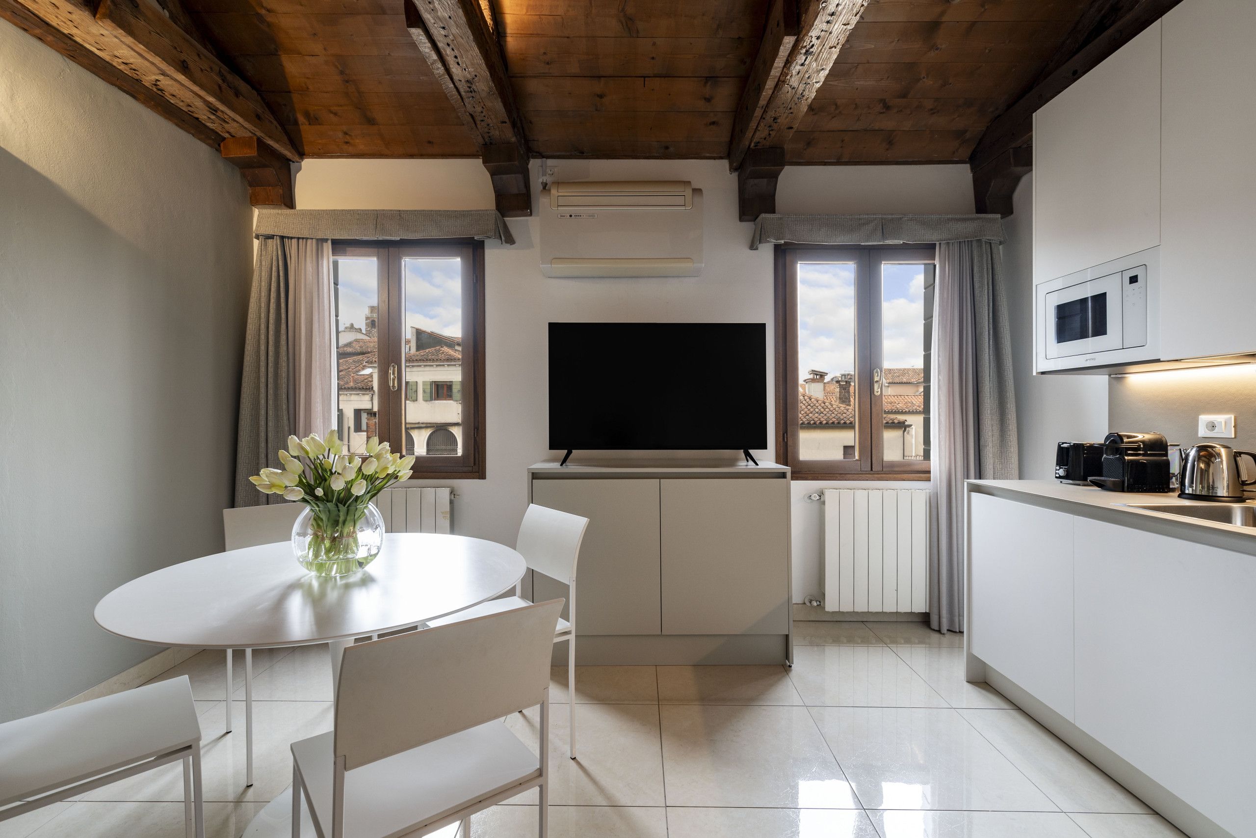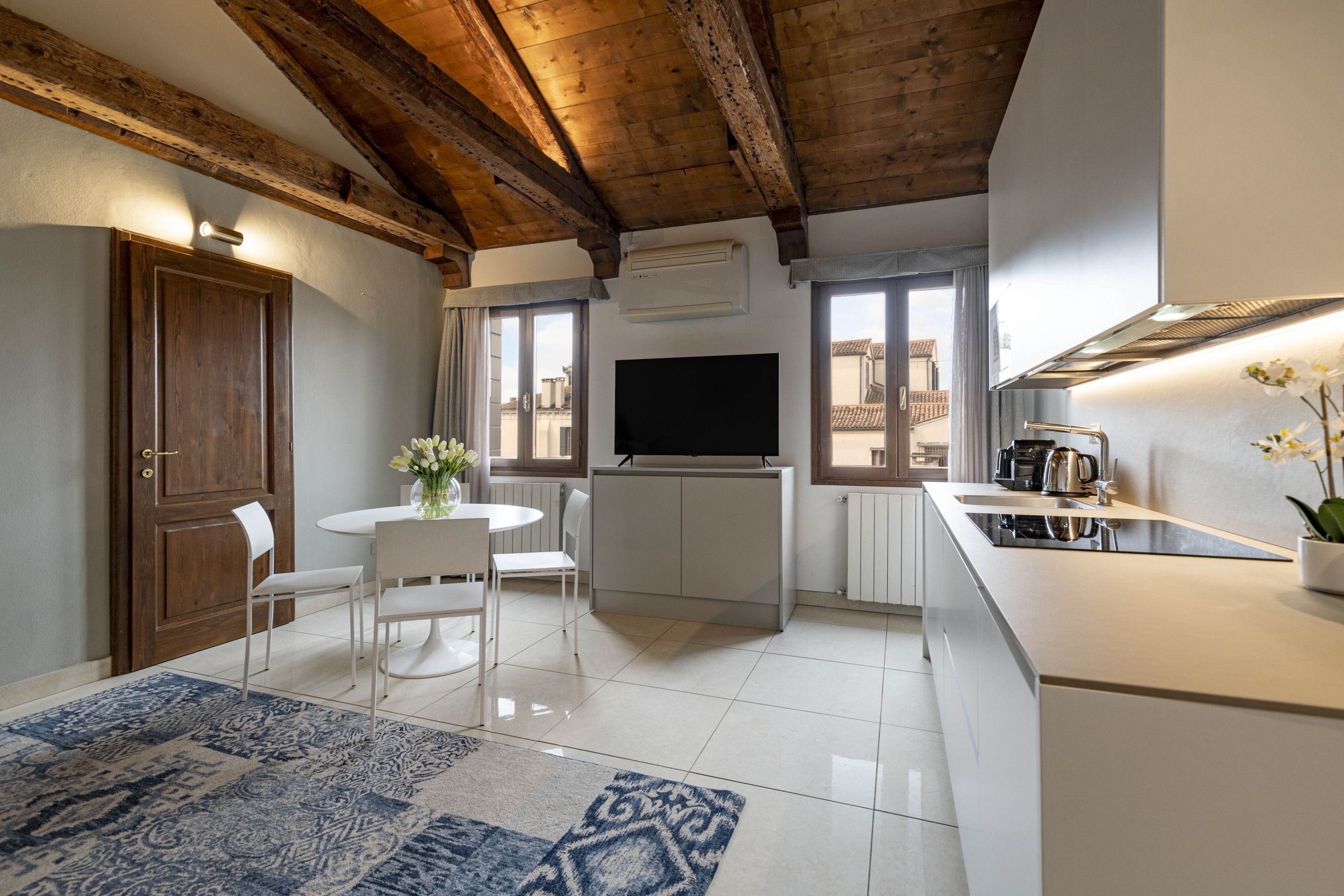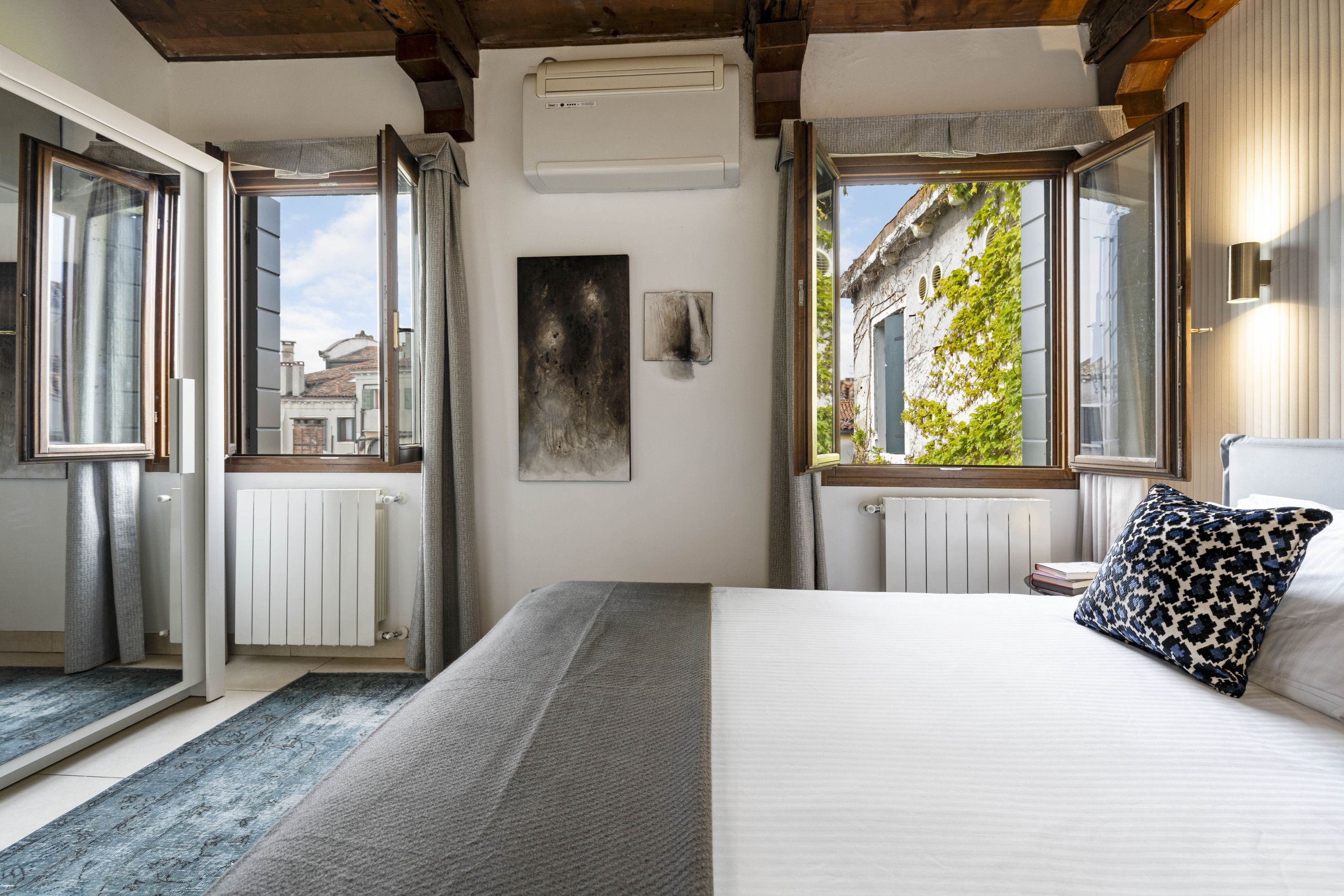 You can live like a local in this area of Venice, just a short walk from the train station and Piazzale Roma. It’s also an easy stroll from the ancient Jewish quarter and the frescoes of Tiepolo of Sant'Alvise and Madonna dell'Orto. Back at this apartment, we love the vaulted beamed ceilings and the views out over the rooftops of Venice. At full capacity, one guest will be sleeping on a sofa bed in the bedroom, so this place might best suit a family.