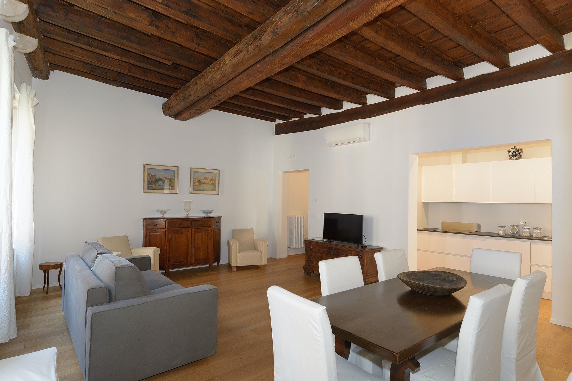 What's a Venetian home without a canal view? This single-floor home in the heart of San Marco allows you to watch the gondolas go past from the living room window, while the garden view in three of the bedrooms offers some serenity. We felt the interior is a little parred back here, but the wooden beams overhead are a nice touch. There is limited seating in the living room, so at capacity, you might be more motivated to take advantage of the proximity to landmarks like the Piazza San Marco. And come dinnertime, you'll find several eateries within 100 yards of your front door.