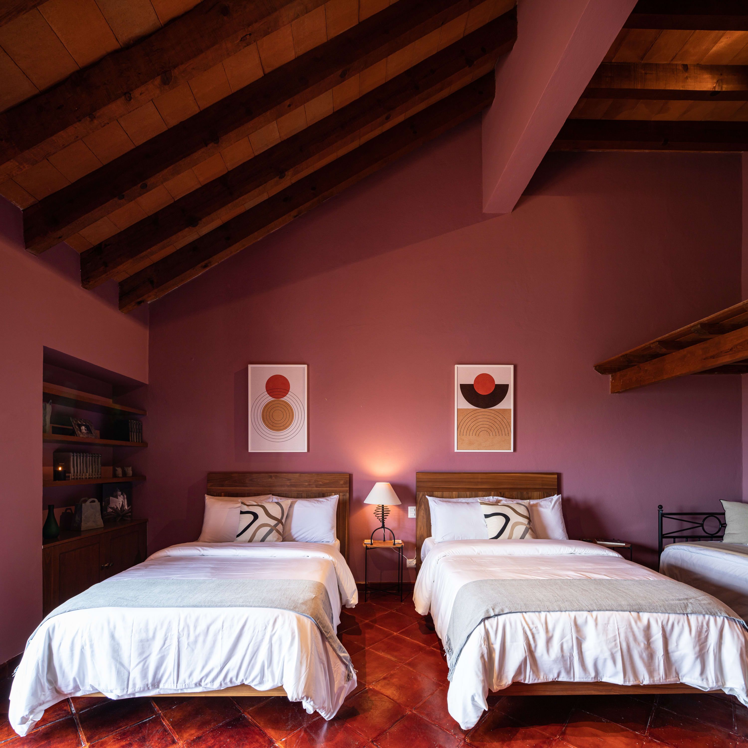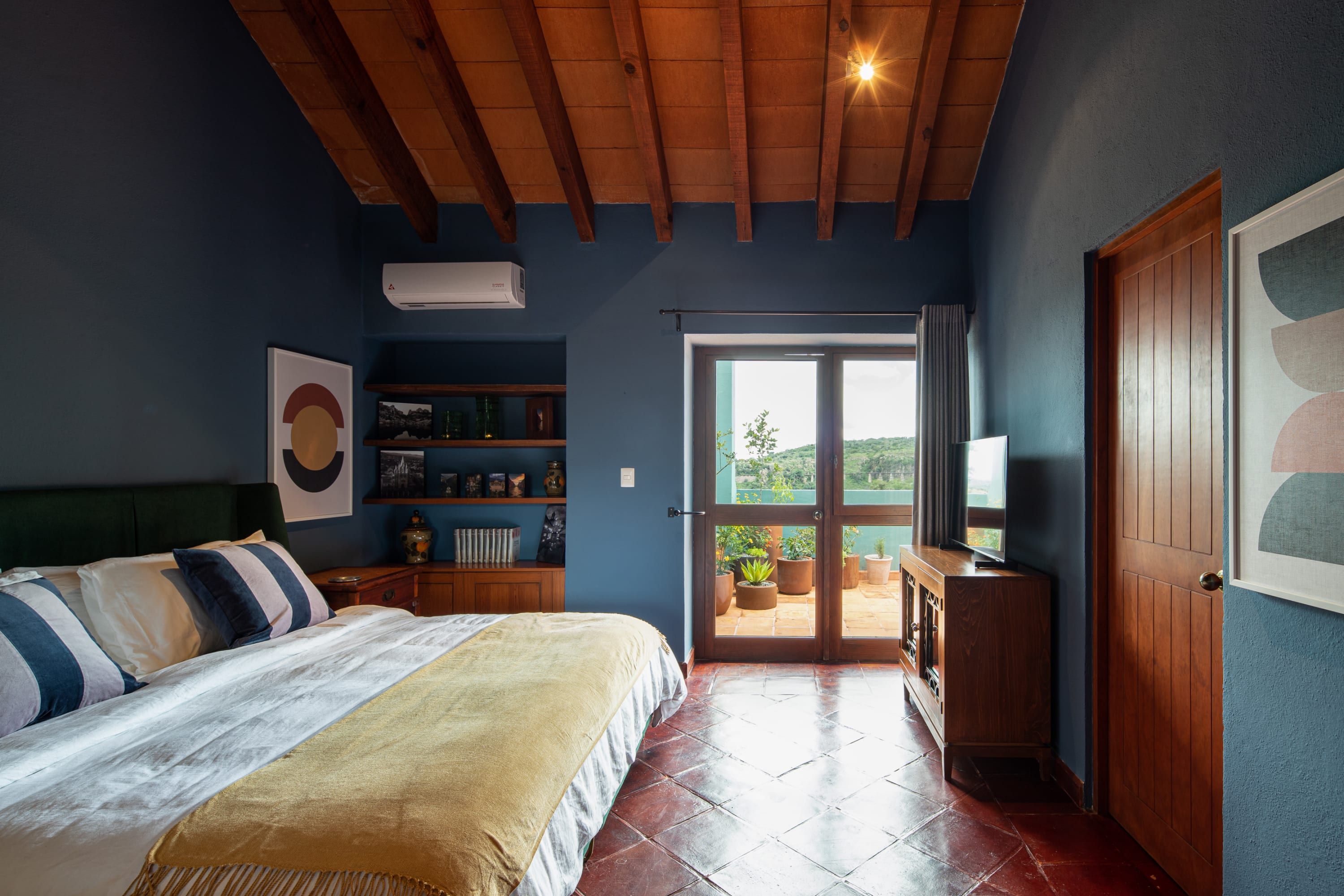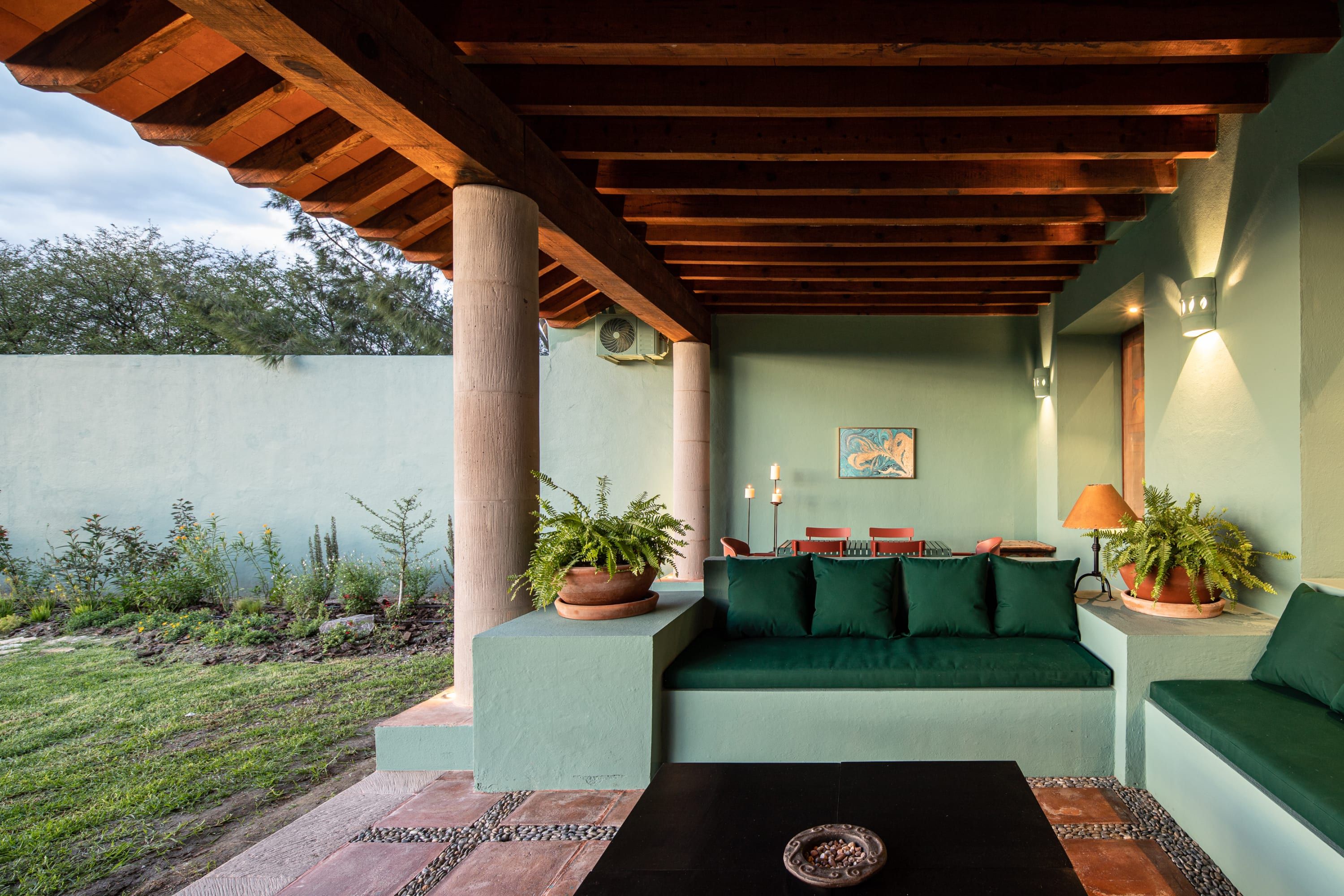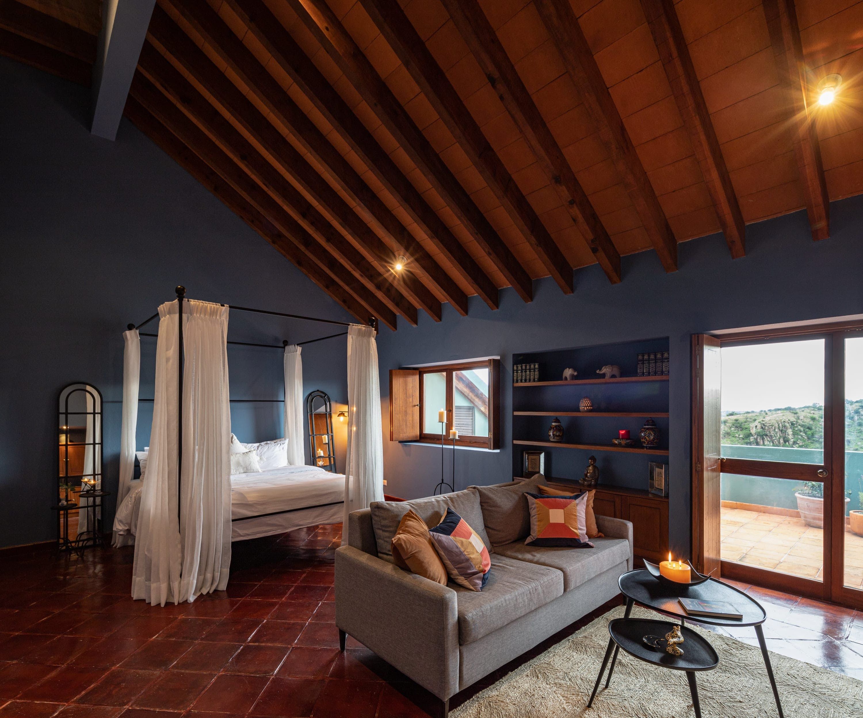 Inside you’ll find another kind of beauty. Unlike the outside view, where everything is wild and lush, the interior focuses on precision and puts every little thing perfectly in its place. It's vibrant and sprawling, with vaulted ceilings, exposed beams, and a striking colour palette. Pair that with brightly lit spaces and beautifully curated art and furnishings, and you have a beautiful space to enjoy your holiday in whichever way best rejuvenates you. For some, it might be reading in the outdoor nook, whereas others might enjoy a glass of wine on the balcony. There’s a massage room, too, and nothing says relaxation quite like a back massage.