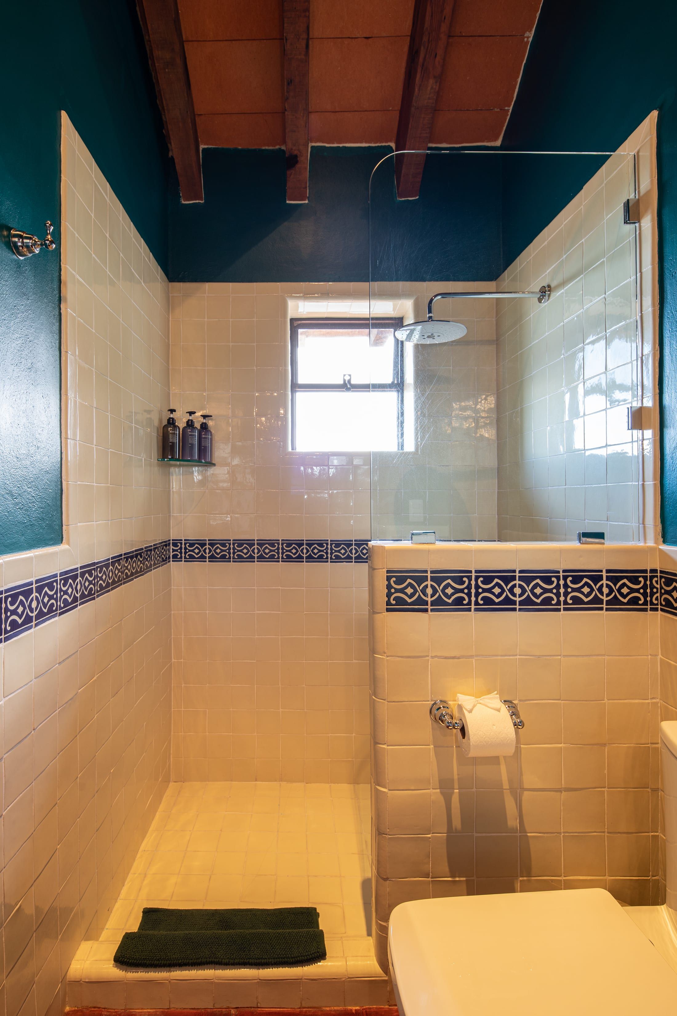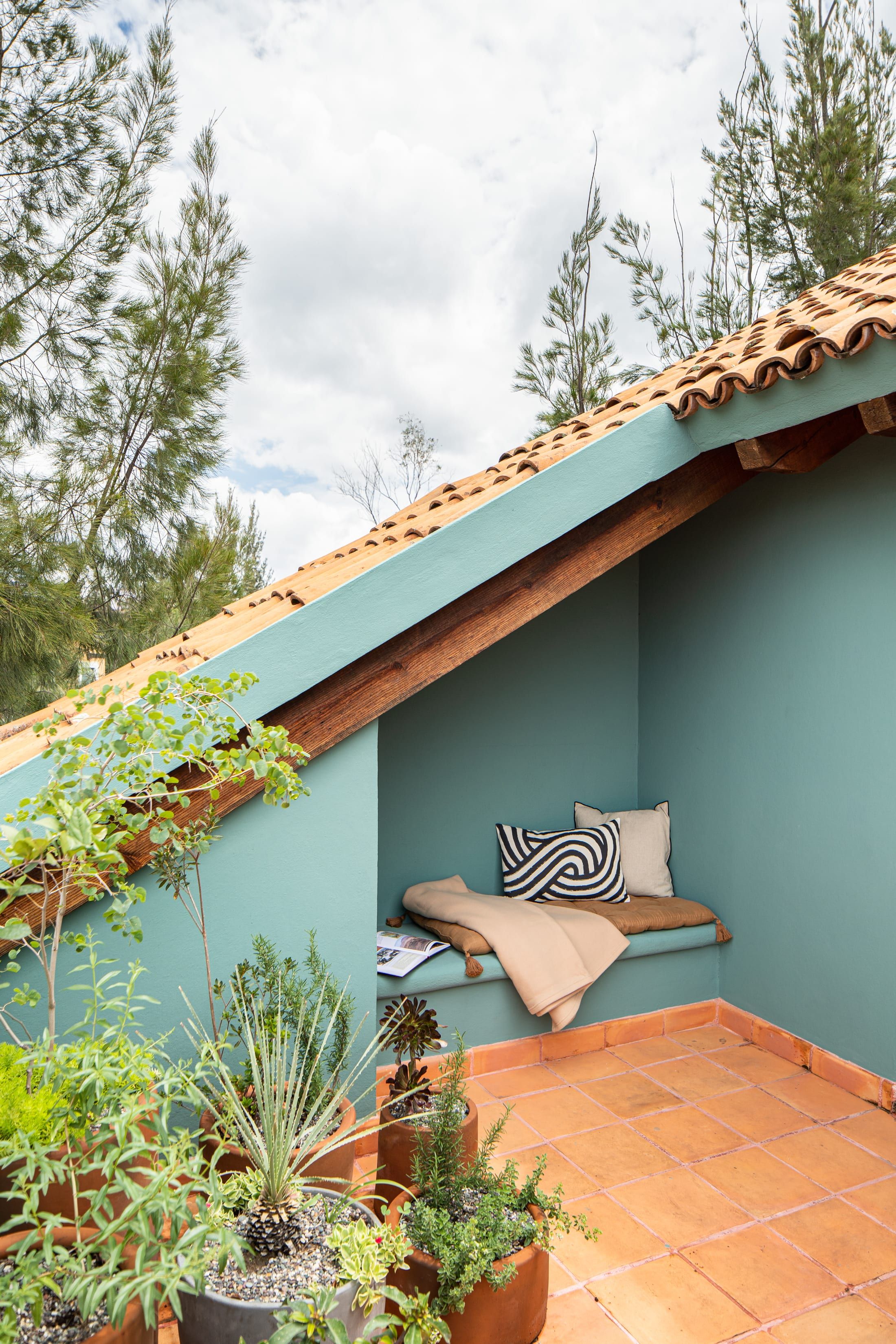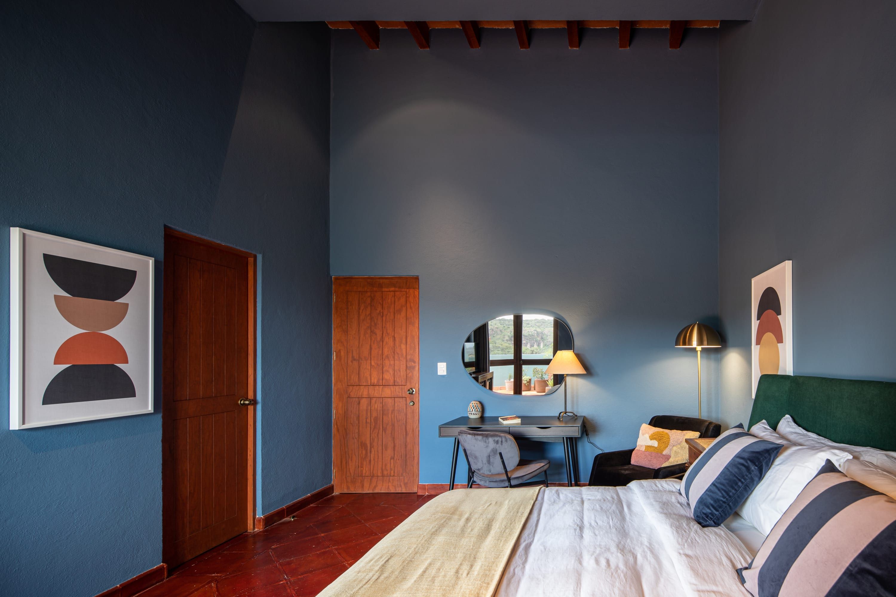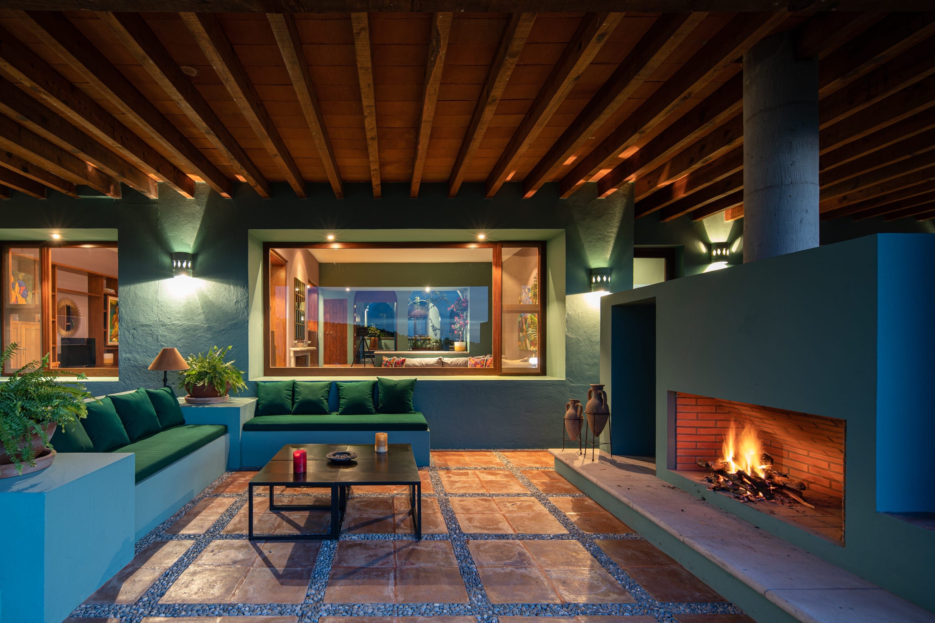 Inside you’ll find another kind of beauty. Unlike the outside view, where everything is wild and lush, the interior focuses on precision and puts every little thing perfectly in its place. It's vibrant and sprawling, with vaulted ceilings, exposed beams, and a striking colour palette. Pair that with brightly lit spaces and beautifully curated art and furnishings, and you have a beautiful space to enjoy your holiday in whichever way best rejuvenates you. For some, it might be reading in the outdoor nook, whereas others might enjoy a glass of wine on the balcony. There’s a massage room, too, and nothing says relaxation quite like a back massage.