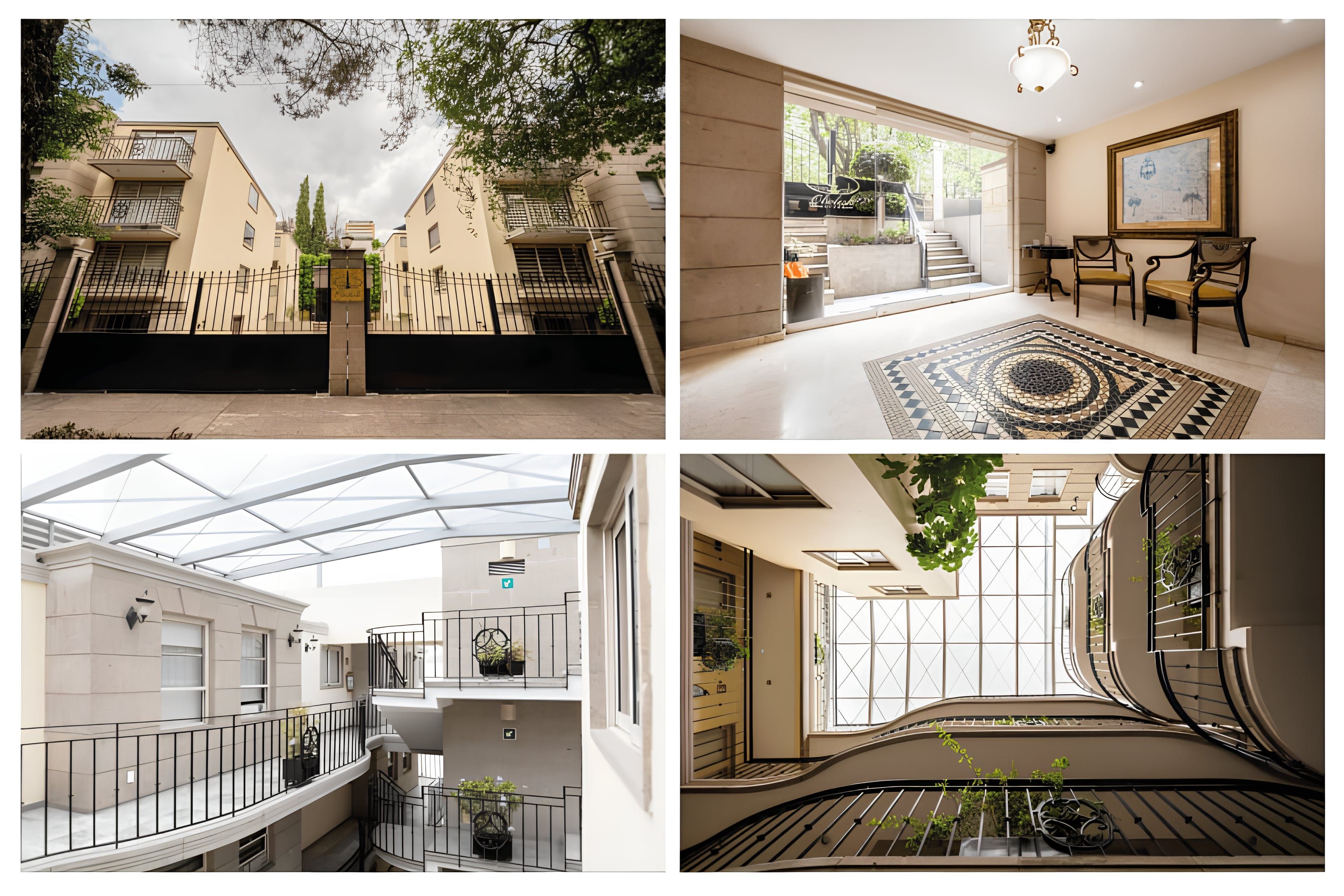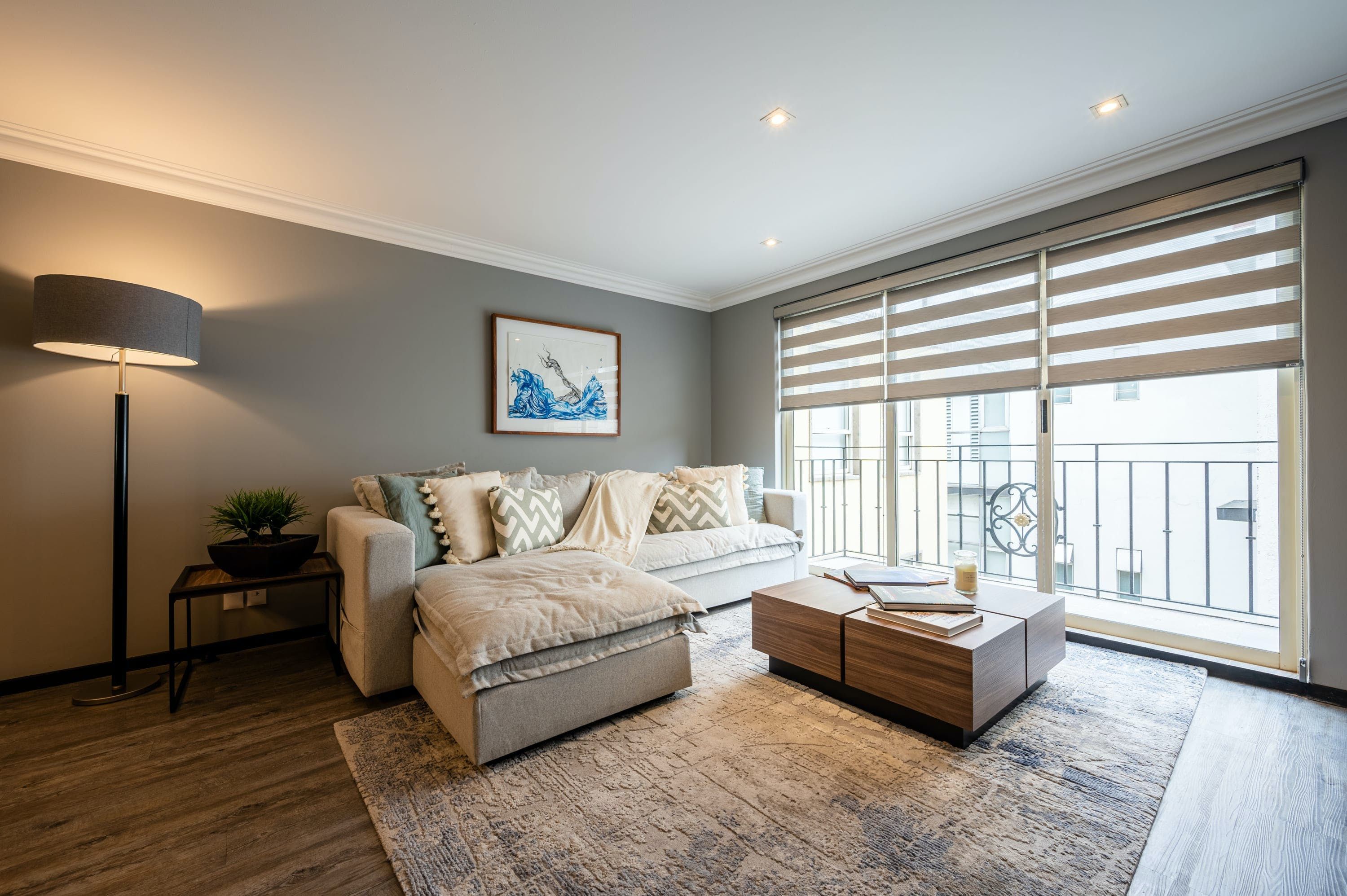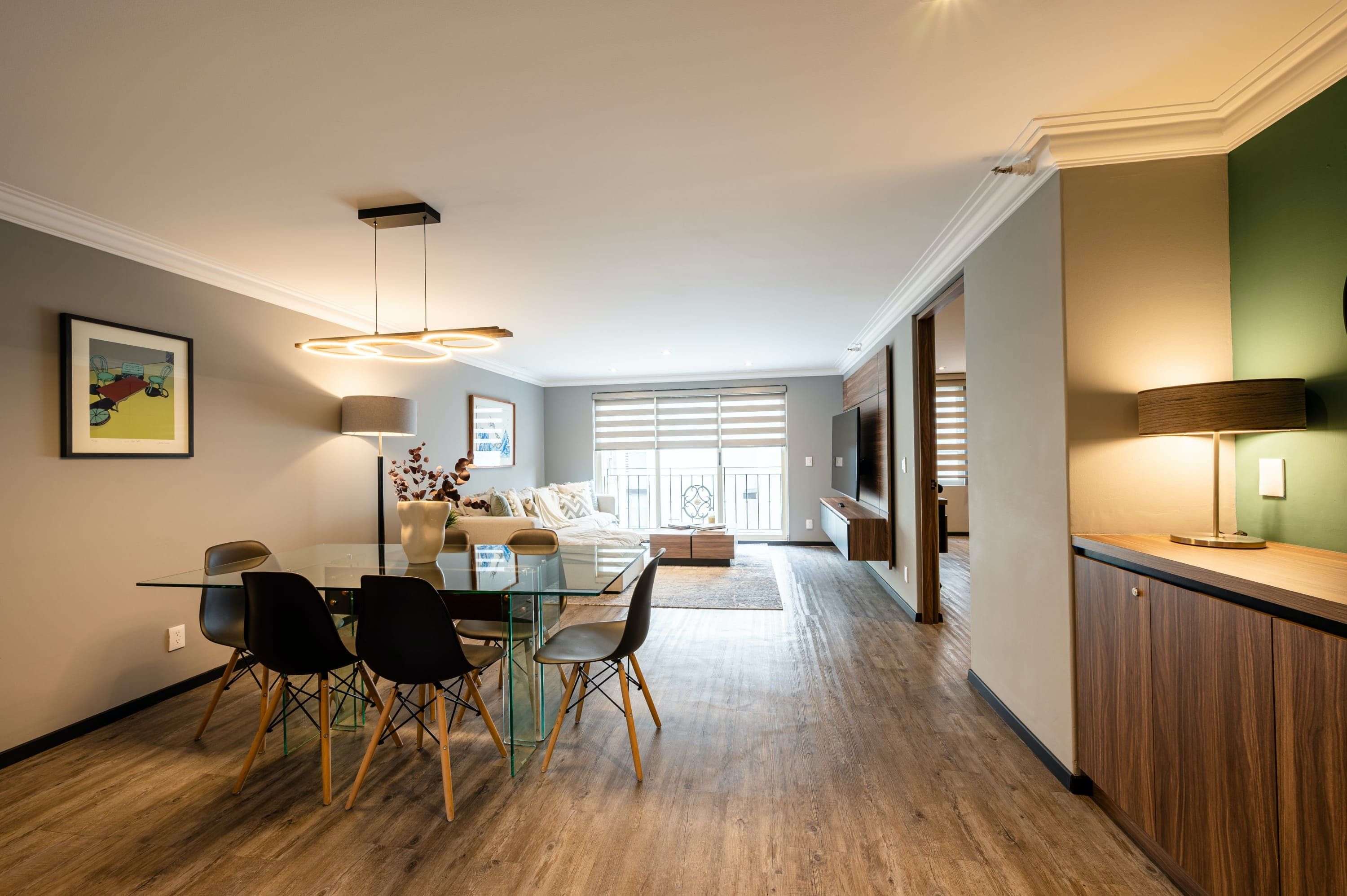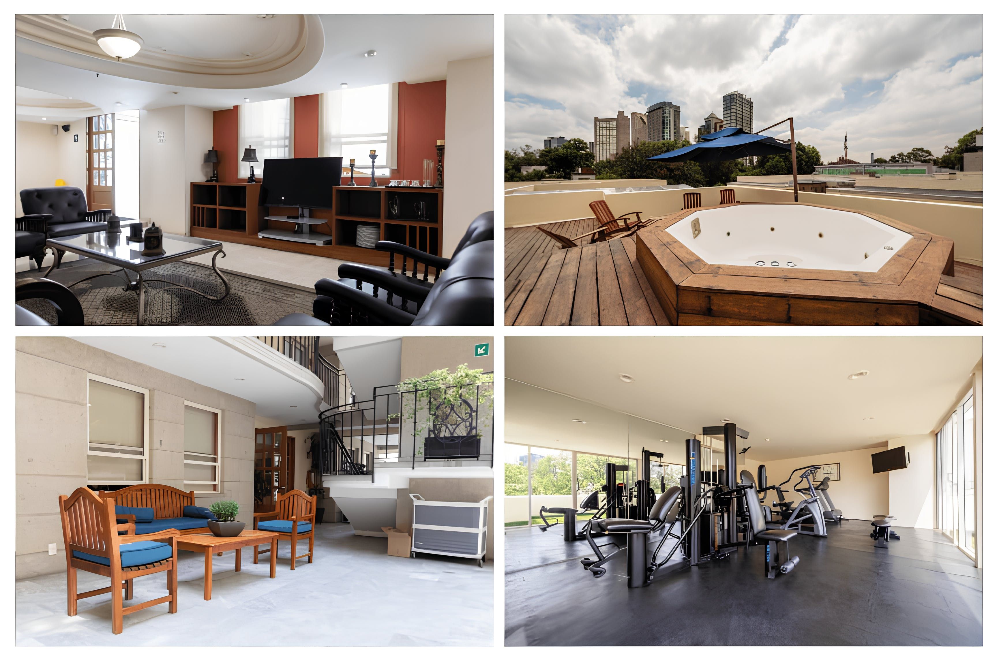 This apartment is located on an exclusive street in Mexico City. Situated between Parque Lincoln and Paseo de la Reforma, you’ll be surrounded by top restaurants and bars. And if you’re interested in culture, there are also museums and galleries nearby. So, that’s the fantastic address, what about the apartment? Well, firstly, we need to mention the communal facilities here – there’s a restaurant, as well as a gym. Another bonus is the secure underground parking. We love the rooftop terrace, too, with its Jacuzzi and stunning views over the city – the perfect place to relax after a busy day. Or you can unwind in this home’s large open-plan living space. This place has all you need for a memorable trip.