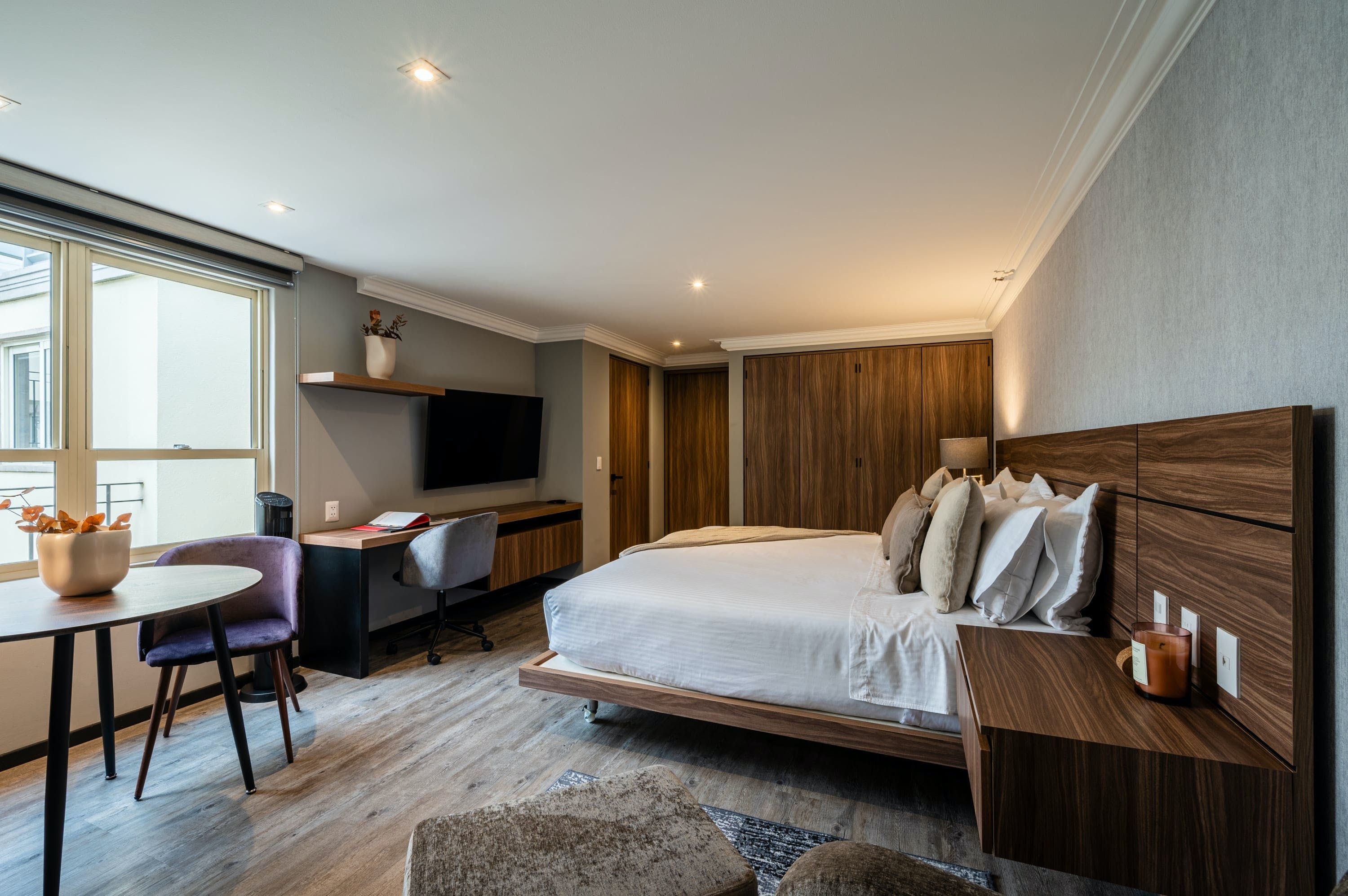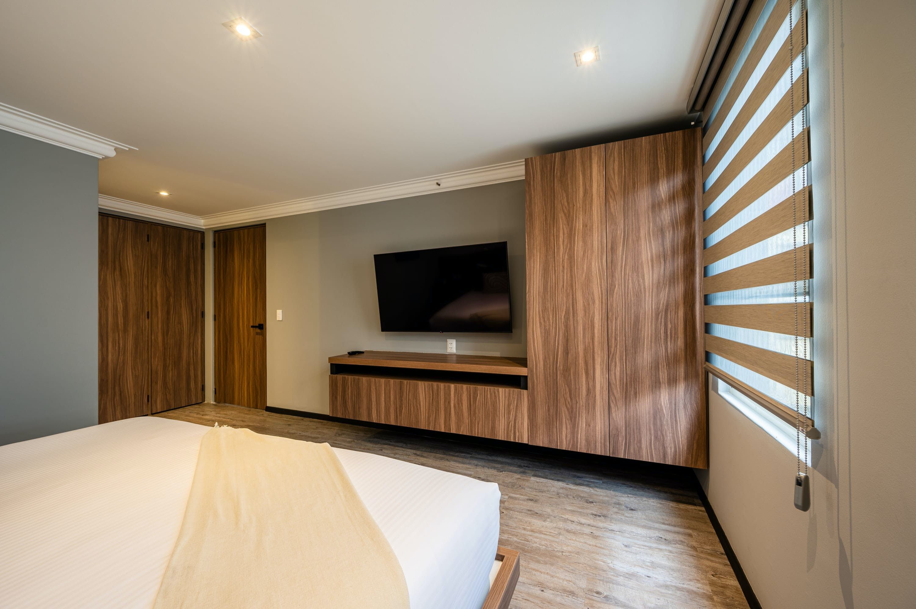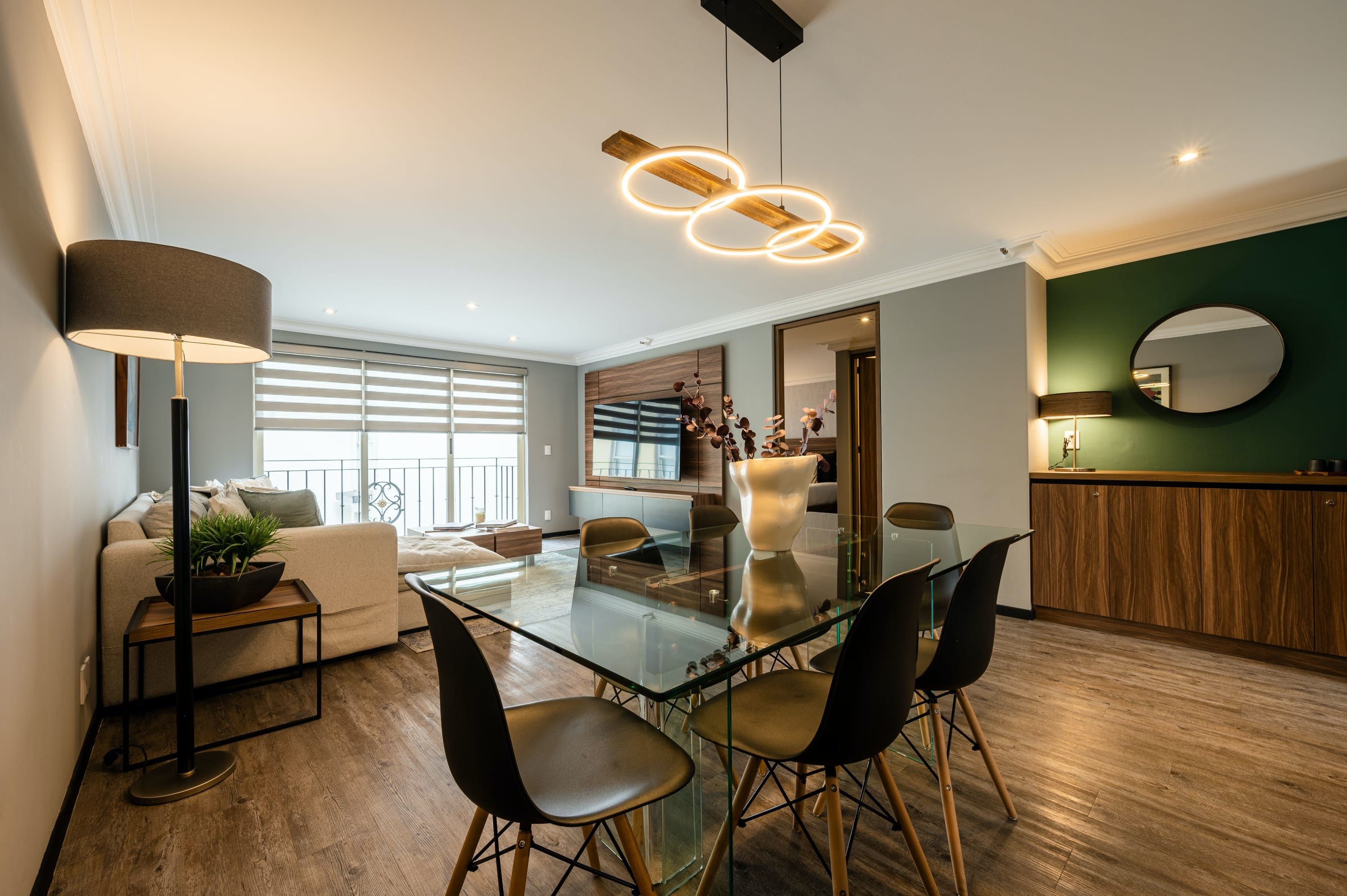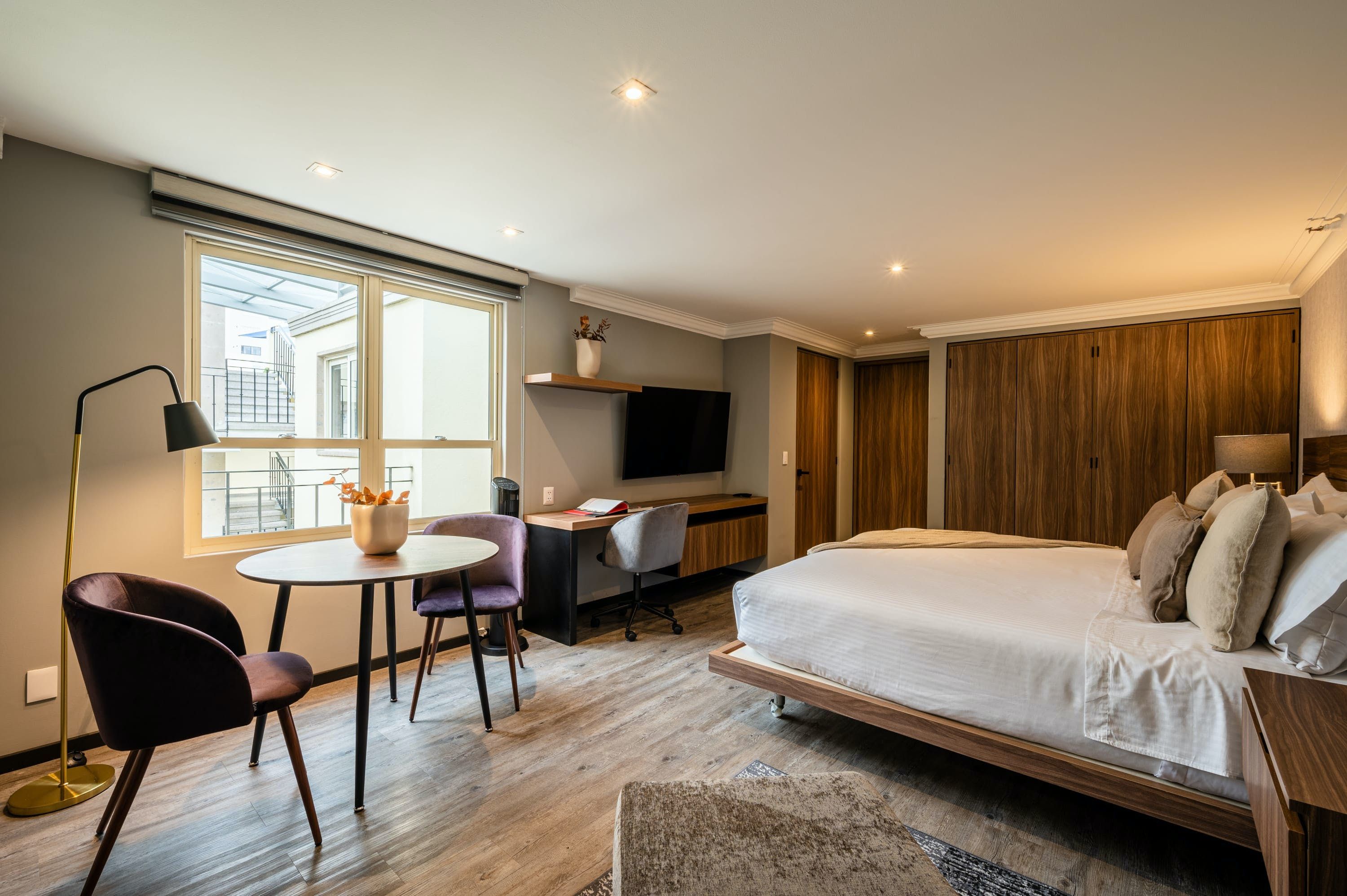 This apartment is located on an exclusive street in Mexico City. Situated between Parque Lincoln and Paseo de la Reforma, you’ll be surrounded by top restaurants and bars. And if you’re interested in culture, there are also museums and galleries nearby. So, that’s the fantastic address, what about the apartment? Well, firstly, we need to mention the communal facilities here – there’s a restaurant, as well as a gym. Another bonus is the secure underground parking. We love the rooftop terrace, too, with its Jacuzzi and stunning views over the city – the perfect place to relax after a busy day. Or you can unwind in this home’s large open-plan living space. This place has all you need for a memorable trip.