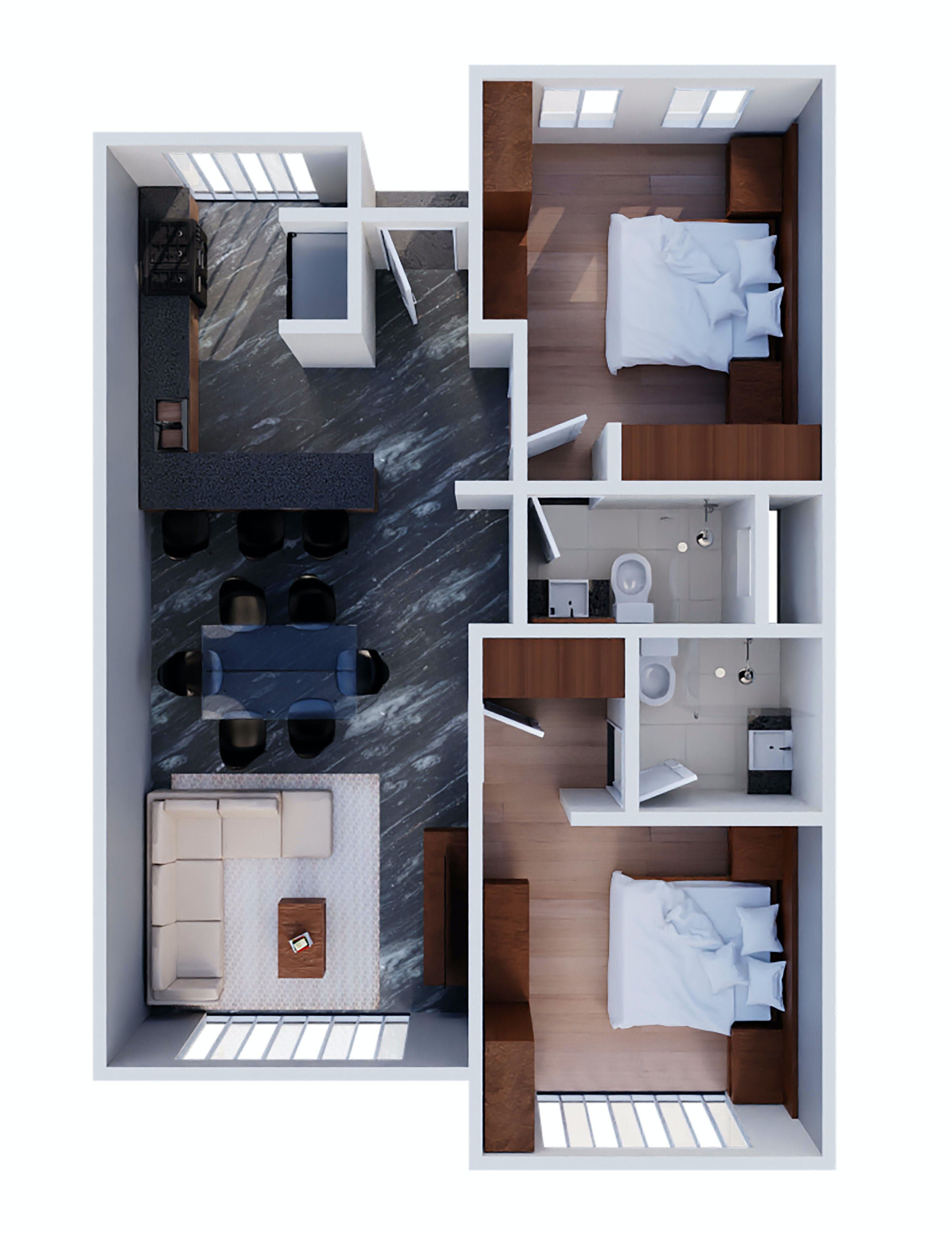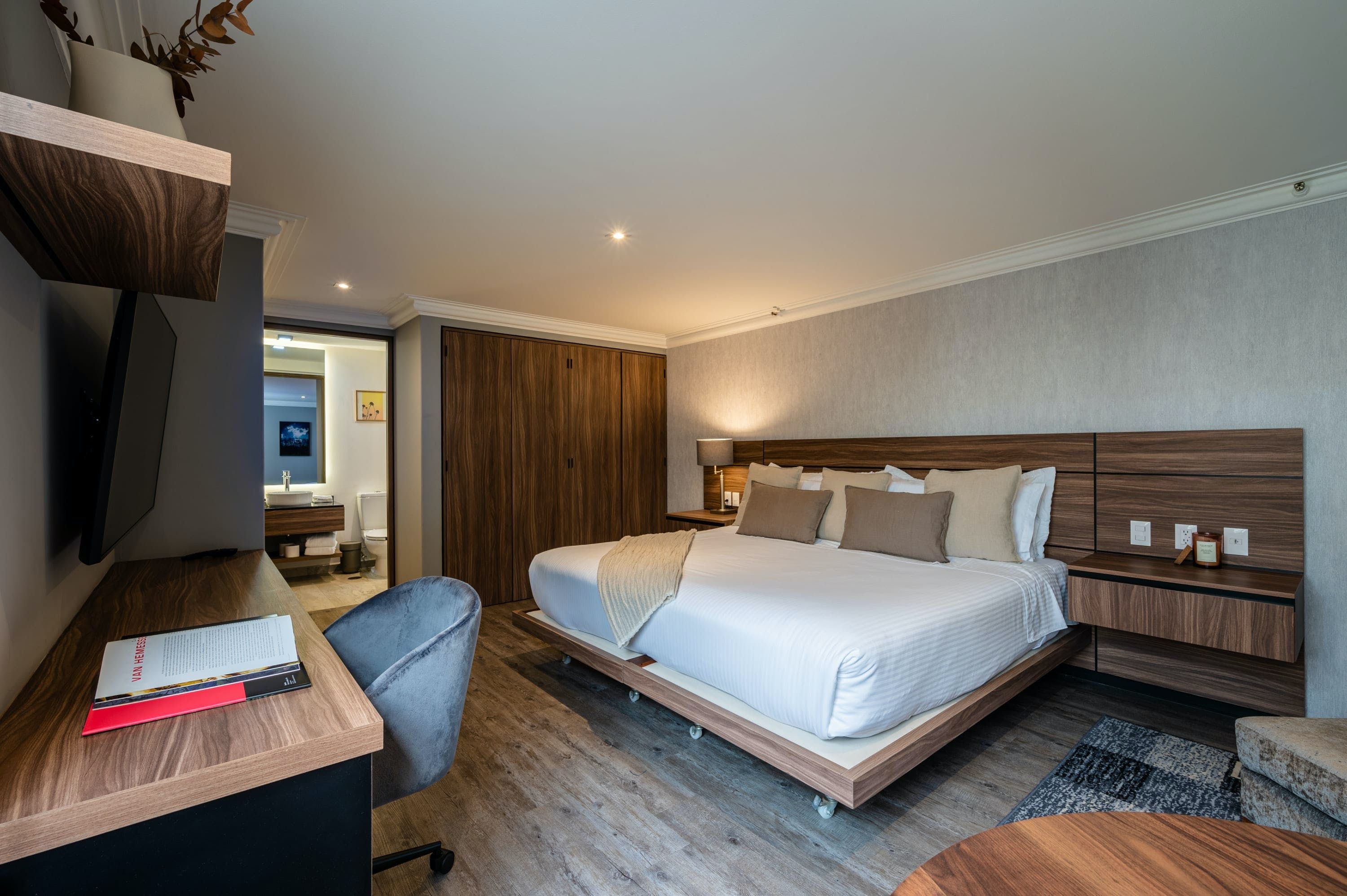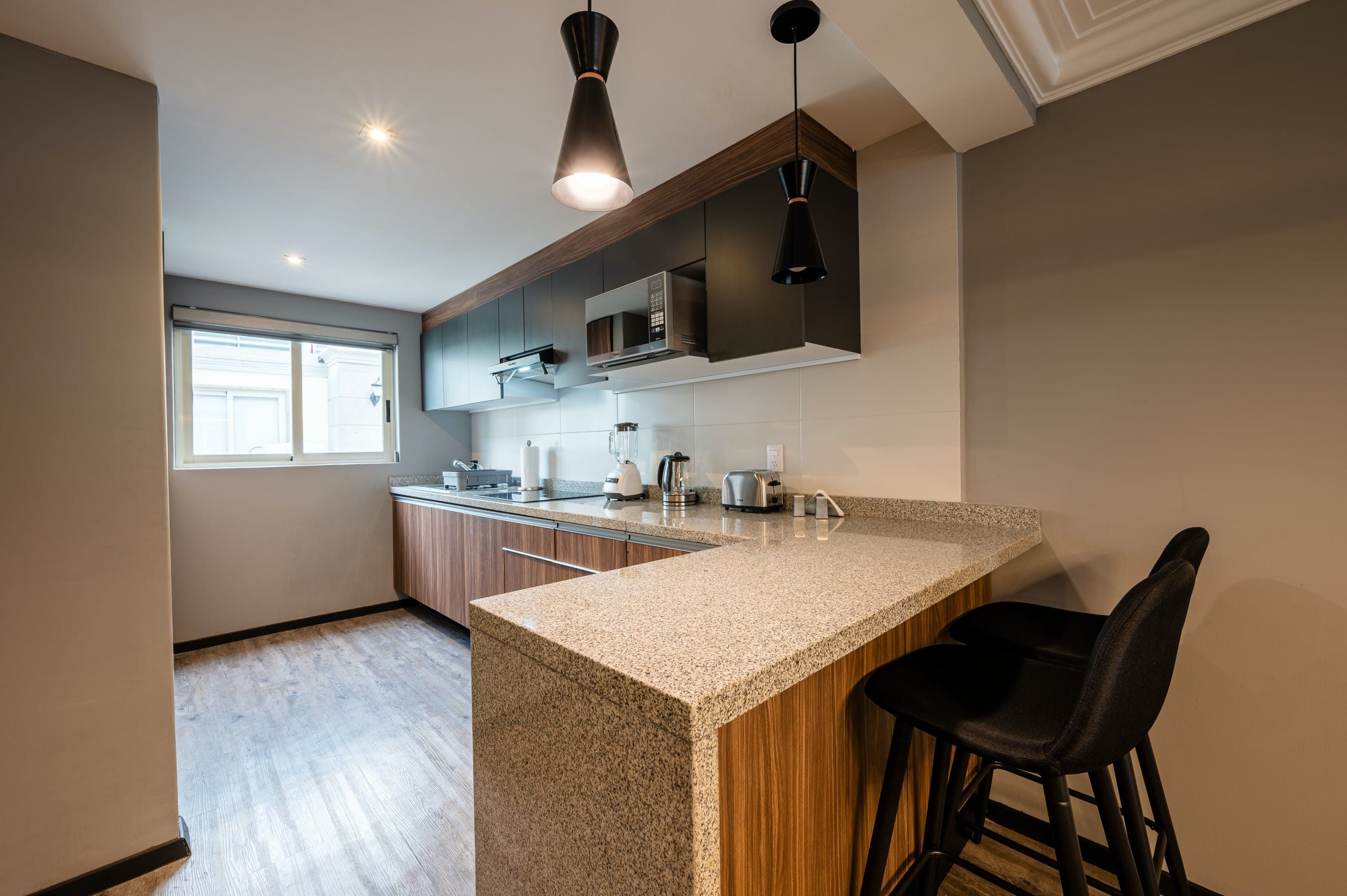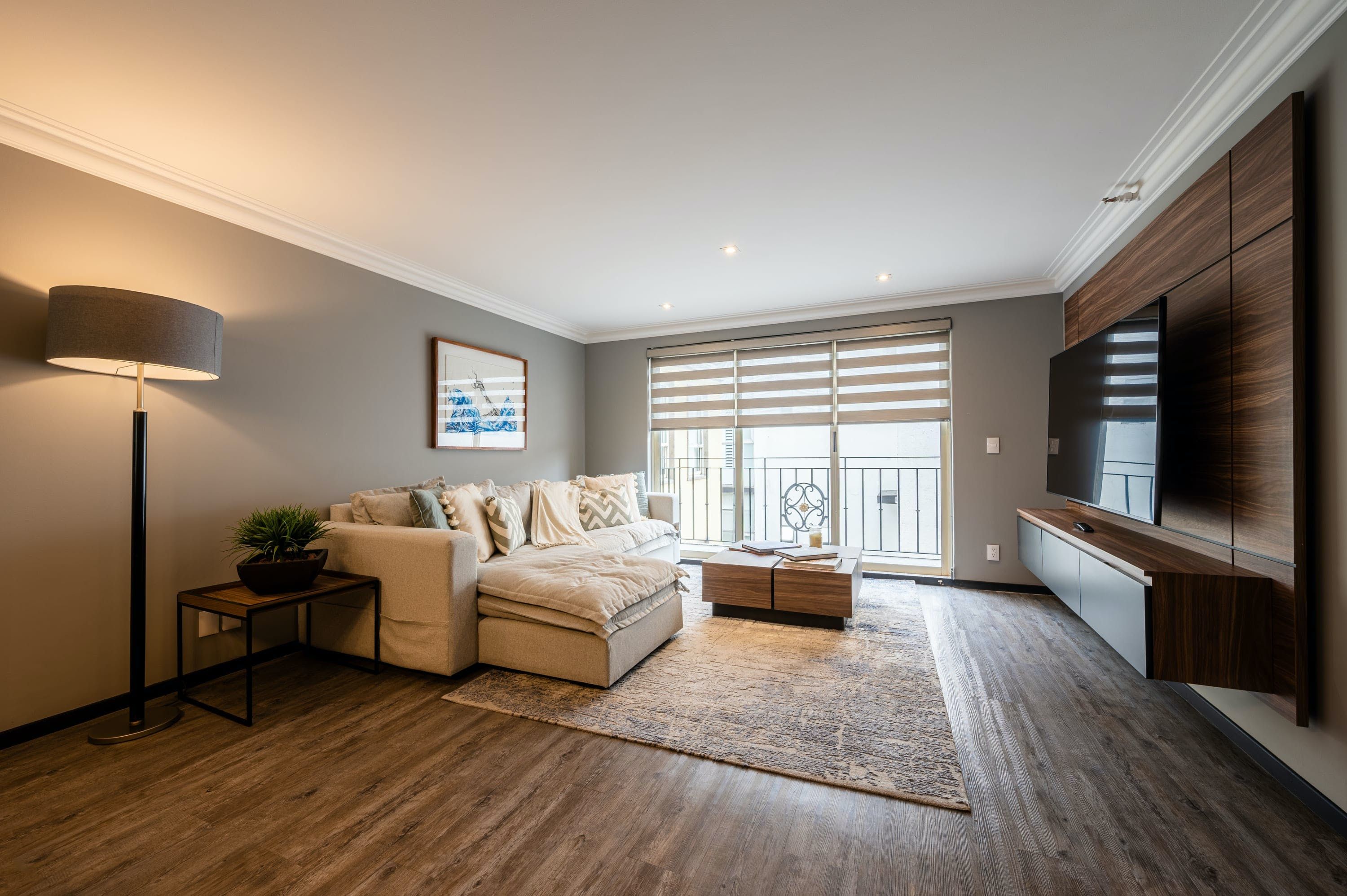 This apartment is located on an exclusive street in Mexico City. Situated between Parque Lincoln and Paseo de la Reforma, you’ll be surrounded by top restaurants and bars. And if you’re interested in culture, there are also museums and galleries nearby. So, that’s the fantastic address, what about the apartment? Well, firstly, we need to mention the communal facilities here – there’s a restaurant, as well as a gym. Another bonus is the secure underground parking. We love the rooftop terrace, too, with its Jacuzzi and stunning views over the city – the perfect place to relax after a busy day. Or you can unwind in this home’s large open-plan living space. This place has all you need for a memorable trip.