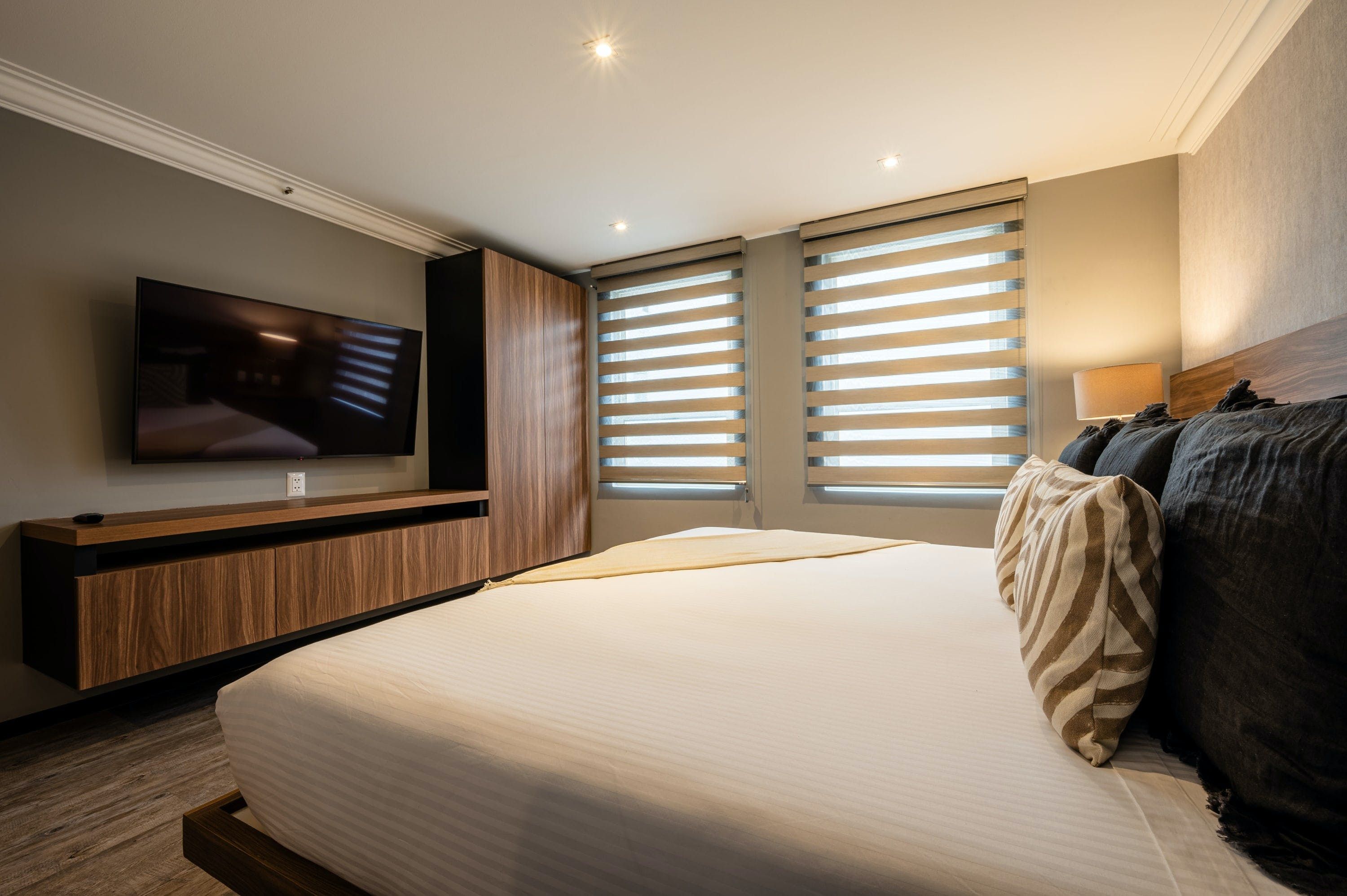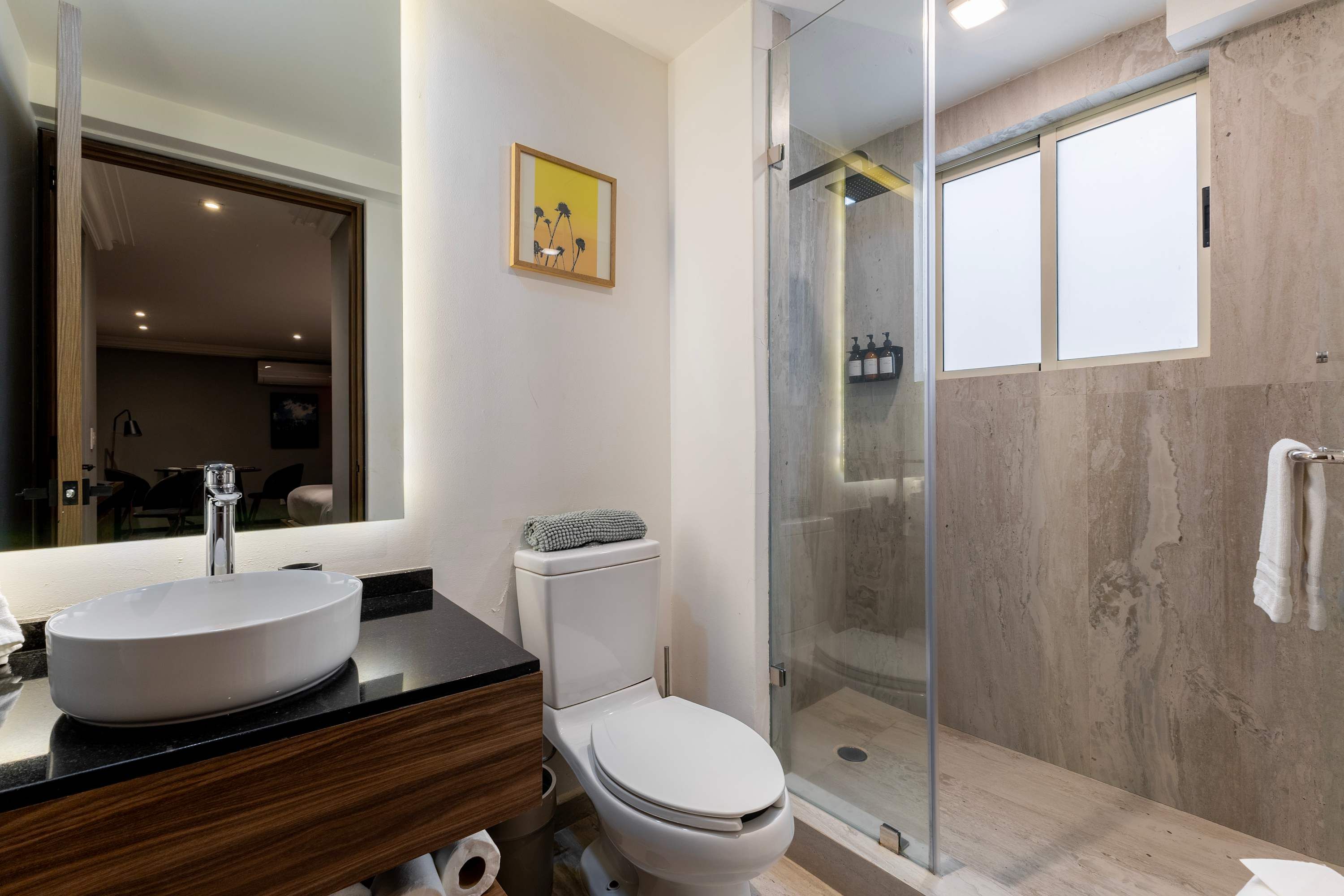 This apartment is located on an exclusive street in Mexico City. Situated between Parque Lincoln and Paseo de la Reforma, you’ll be surrounded by top restaurants and bars. And if you’re interested in culture, there are also museums and galleries nearby. So, that’s the fantastic address, what about the apartment? Well, firstly, we need to mention the communal facilities here – there’s a restaurant (breakfast is included) as well as a gym. We love the rooftop terrace, too, with its Jacuzzi and stunning views over the city. Or you can unwind in this home’s large open-plan living space or on the private patio – the perfect place to relax after a busy day.