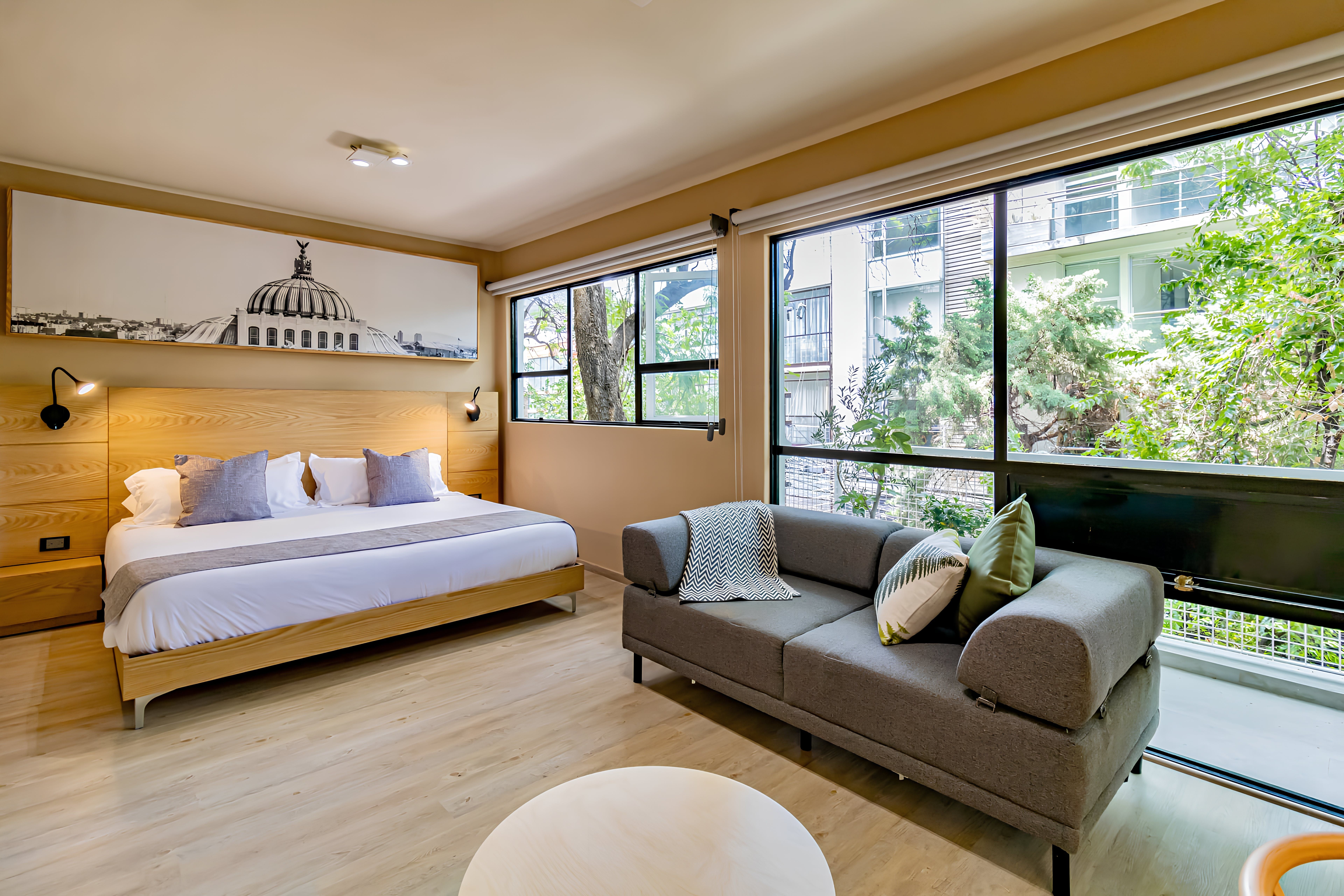 Close to the city centre but far enough away from the true bustle, this city apartment has a lot going for it. Start your day with a cup of coffee on the private balcony, surrounded by potted plants and the street’s leafy trees. Inside, the warm timber gives the home an unmistakably modern flair – but with only one bathroom, we think it might get a bit crowded at full occupancy here. If that’s not an issue, then this apartment’s location makes it a true winner – see some of the city’s best mural art at the Polyforum Cultural Siqueiros just around the corner, or hop on the Metrobus for a quick trip right into the city centre.