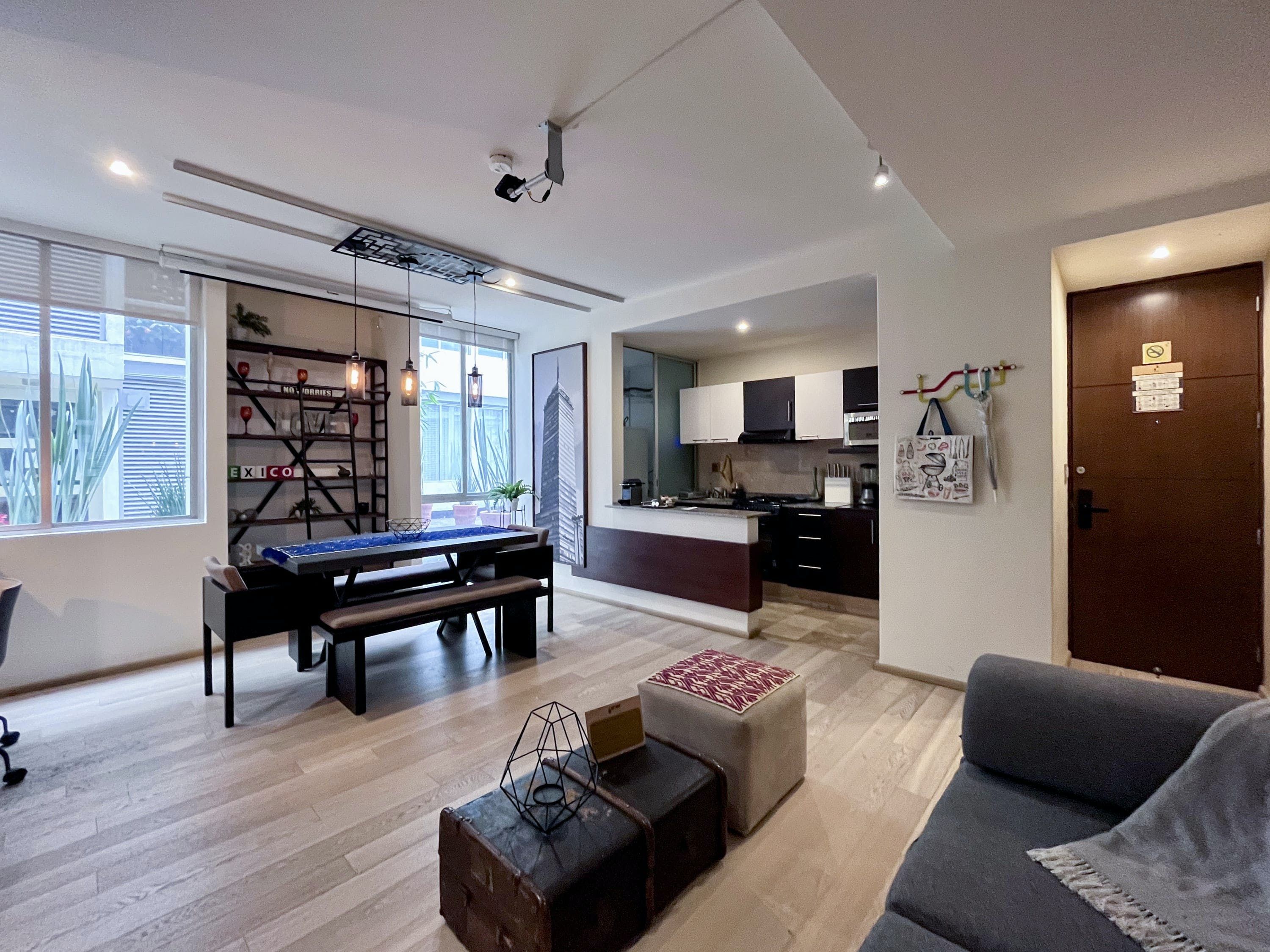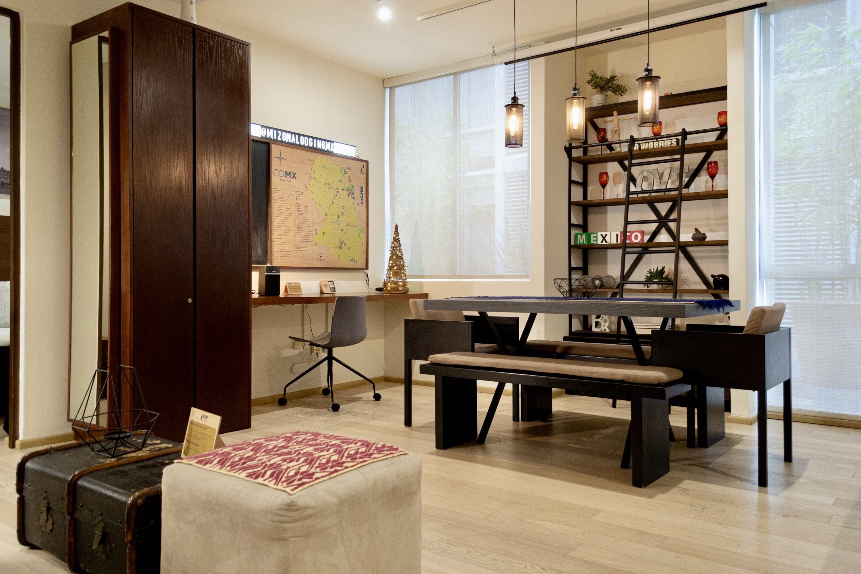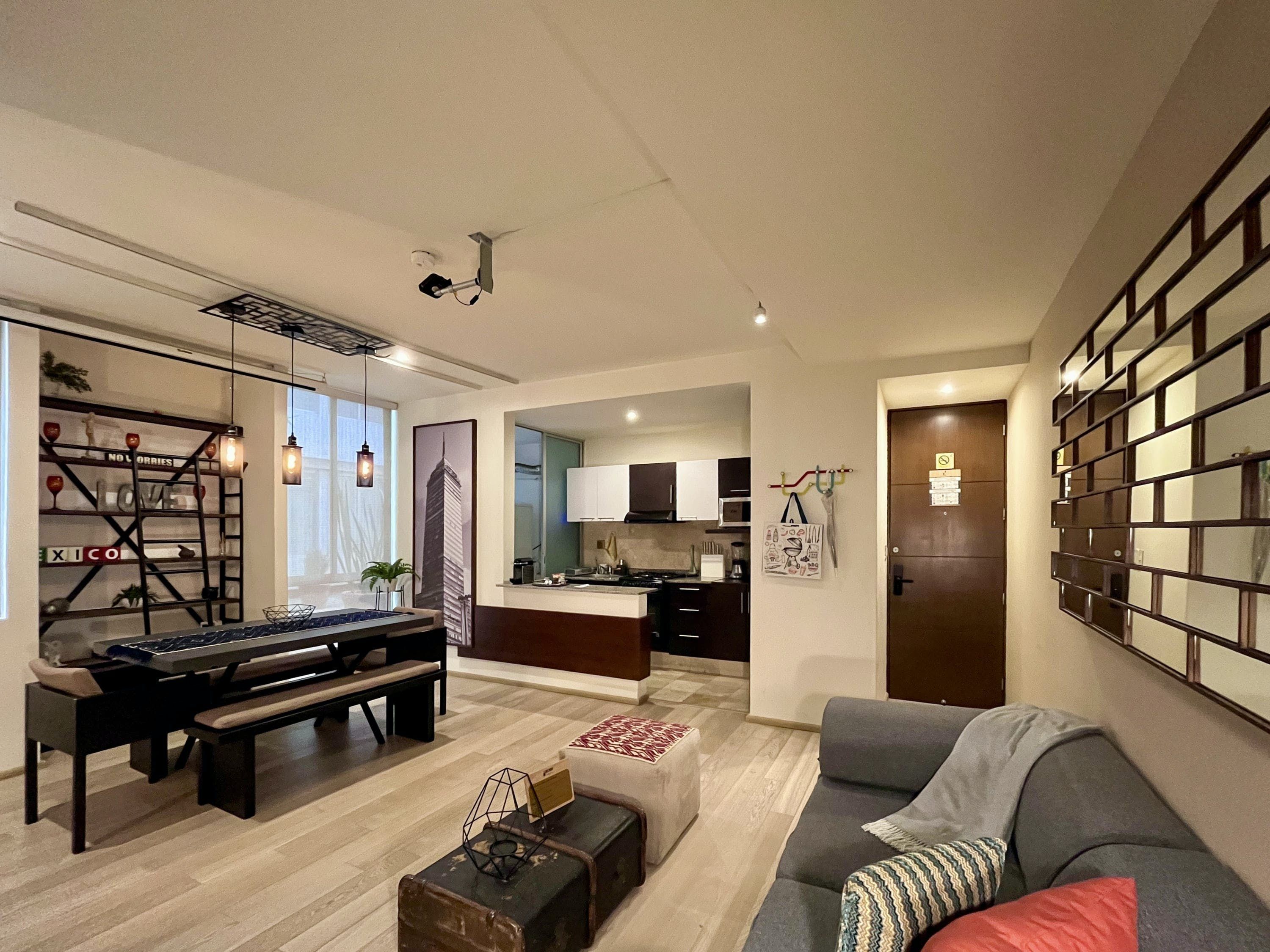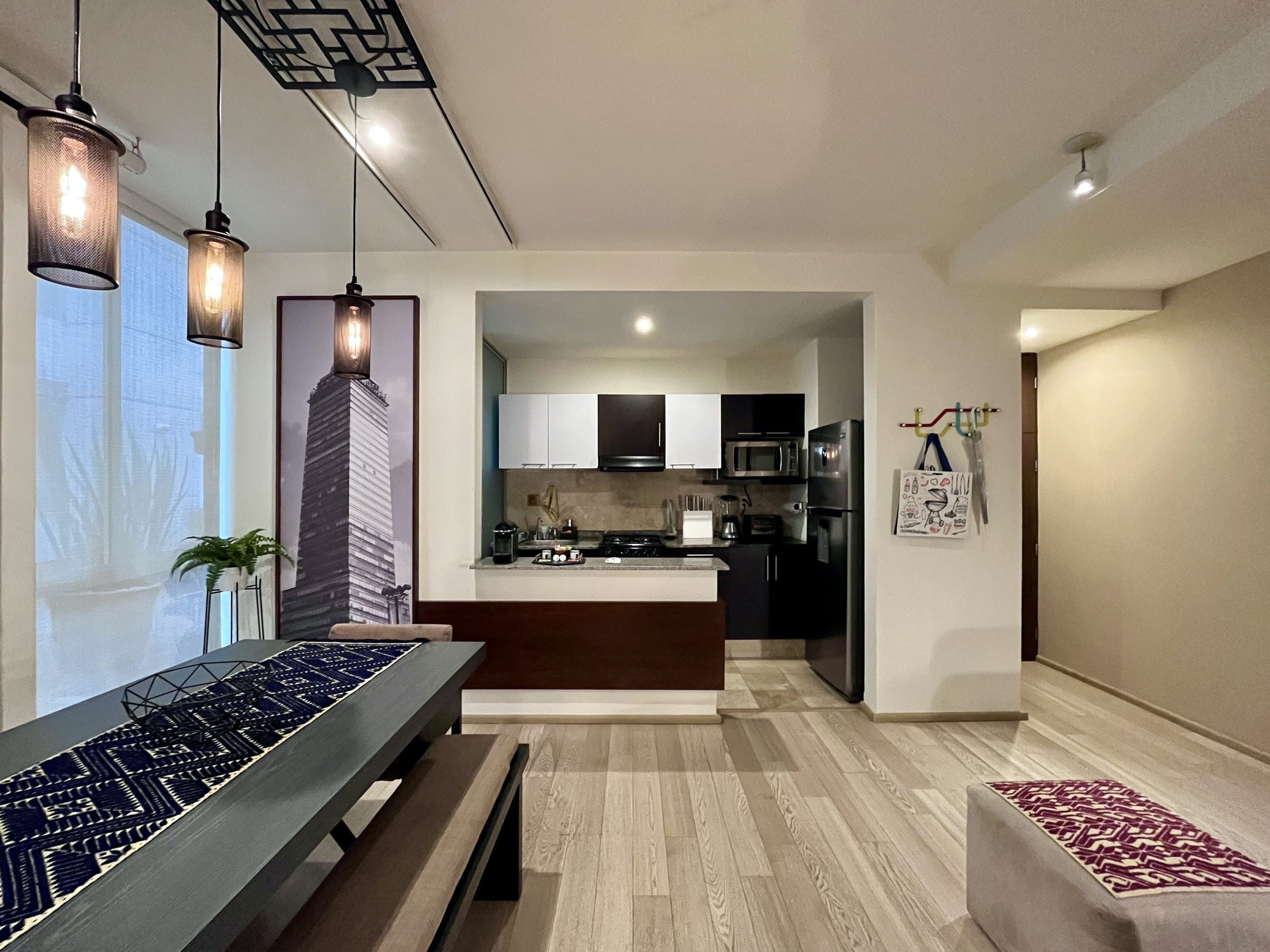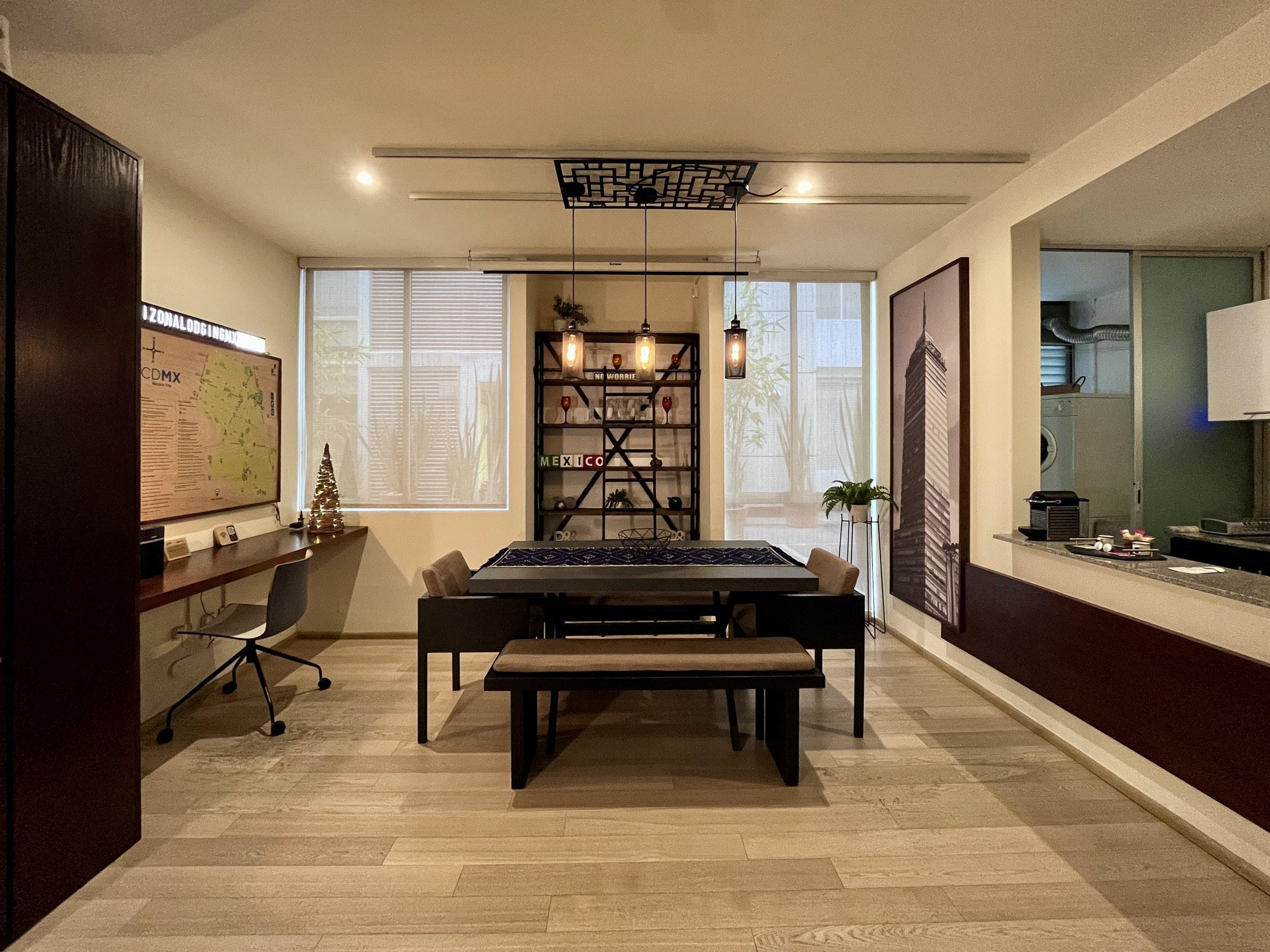 The apartment offers an elegant and urban design with a unique touch. Decorated in neutral tones and warm lighting, this urban oasis aims to create an atmosphere that feels like stepping into a serene retreat amid the vibrant dynamism of the city. The space invites guests to unwind and recharge, providing a peaceful sanctuary after a day exploring the bustling streets. With a blend of contemporary art pieces and cozy furnishings, the ambiance exudes both comfort and sophistication. Open the windows to let in the gentle breeze while enjoying panoramic views of Ciudad de México. Immerse yourself in the city's cultural landmarks, indulge in authentic cuisine, then return to this charming urban getaway to relax and rejuvenate for another exciting day.