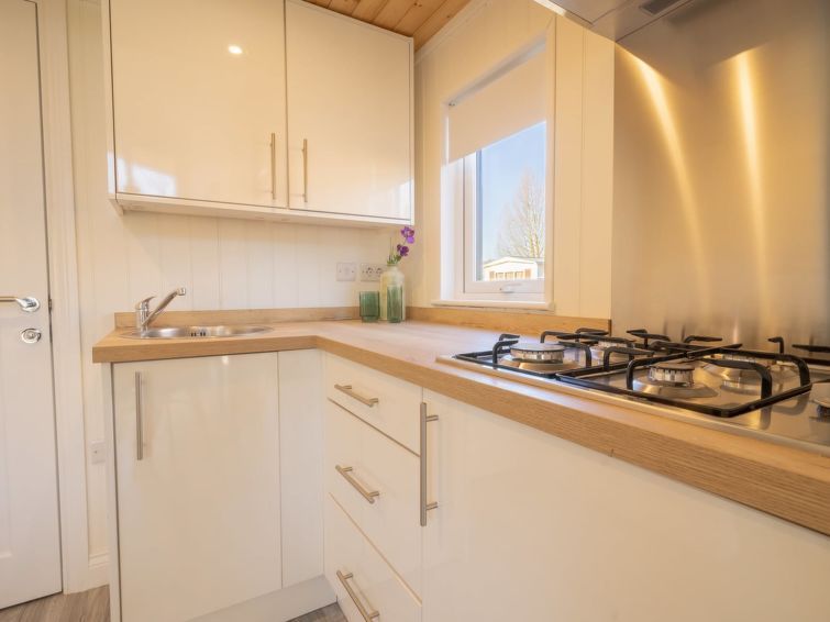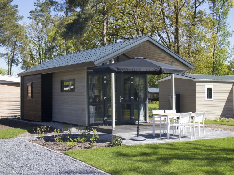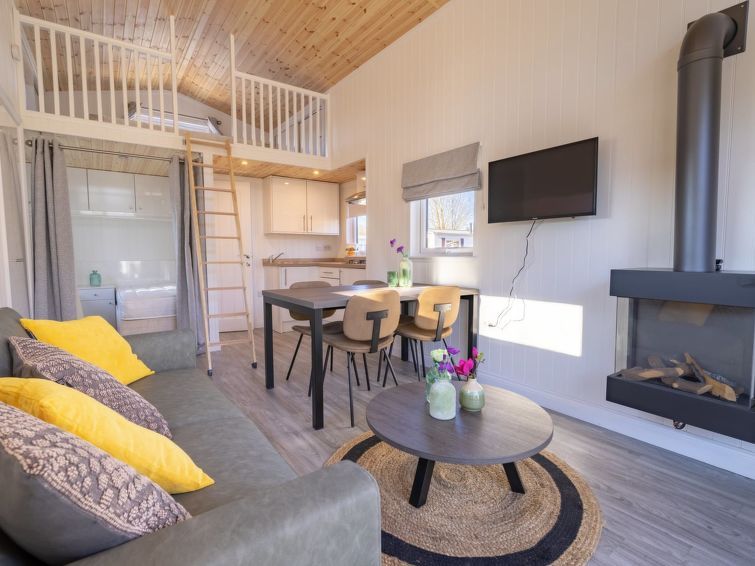 "Tiny Lodge 4", 2-room mobile home 30 m2 on 2 levels. Practical and cosy furnishings: living/sleeping room with dining table, TV and wood-burning stove. Exit to the terrace. 1 open room with curtain with 2 beds. Kitchenette (4 gas rings, kettle, electric coffee machine). Shower/WC.