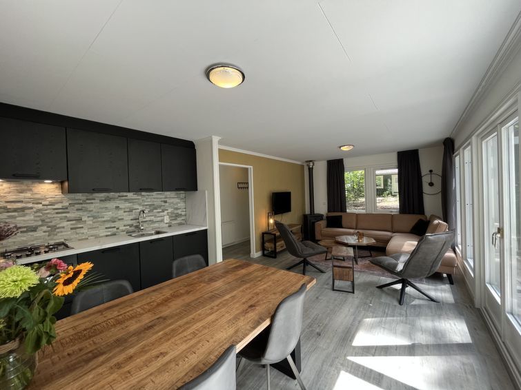 "Fins Chalet", 4-room bungalow 80 m2, on the ground floor. Comfortable furnishings: entrance hall with separate WC. Open living/dining room with dining table and flat screen. Exit to the terrace. 3 double bedrooms, each room with 2 beds. Open kitchen (dishwasher, Gas stove, 4 gas rings, kettle, microwave, electric coffee machine).
