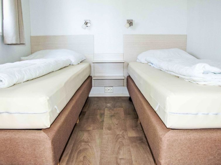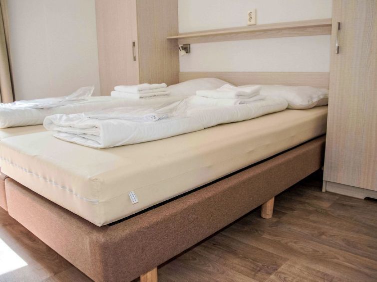 "Heidelodge", 3-room bungalow 60 m2, on the ground floor. Simple furnishings: living/dining room with dining table and flat screen. 2 double bedrooms, each room with 2 beds. Open kitchen (dishwasher, Gas stove, 4 gas rings, kettle, electric coffee machine, combination microwave). Shower/WC.