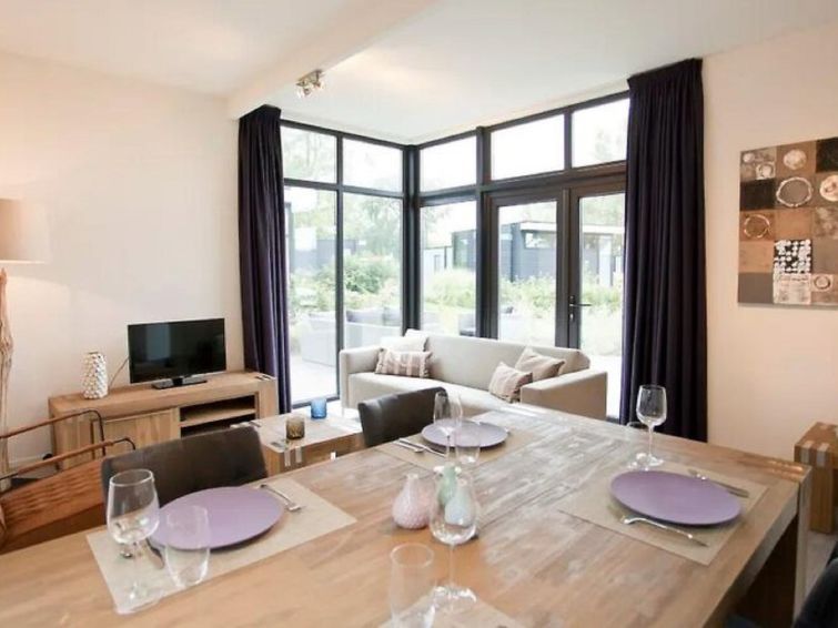"Cube la Mer 4", 3-room chalet on the ground floor. Comfortable furnishings: living/dining room with 1 sofabed and flat screen. Exit to the terrace. 1 double bedroom with 1 double bed. 1 double bedroom with 2 beds. Open kitchen (4 hot plates, oven, dishwasher, microwave, electric coffee machine) with dining table and dining nook.
