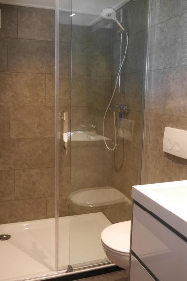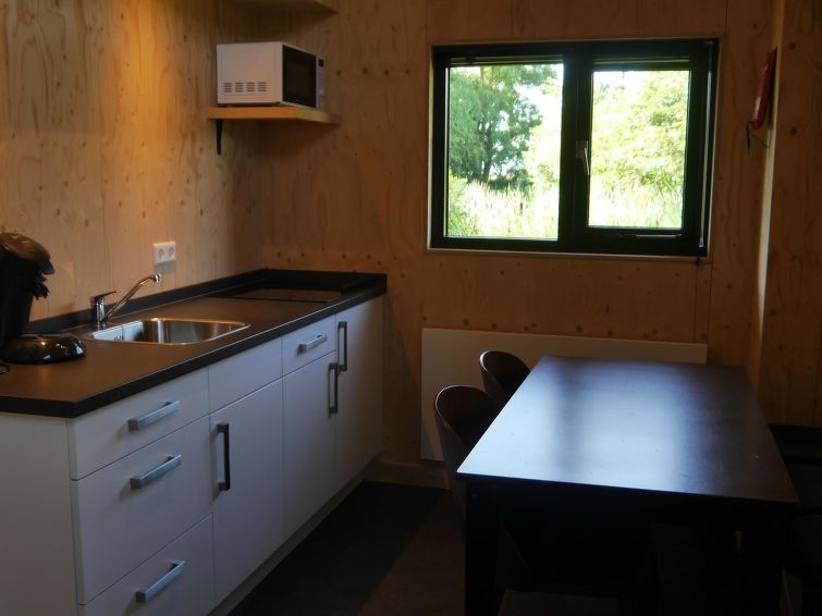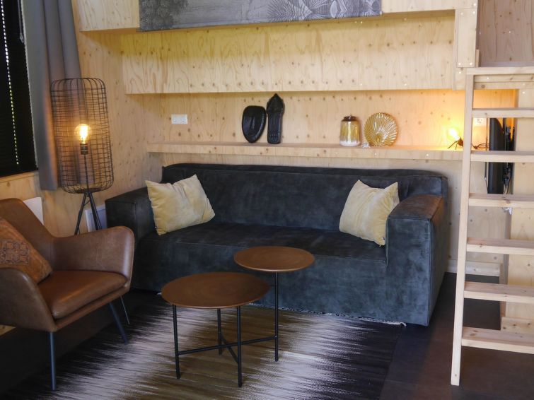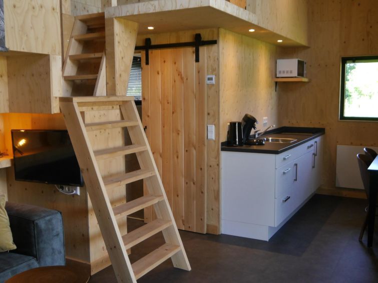 "Tiny House 4", 1-room house 45 m2. Cosy and wooden furniture furnishings: small living/dining room with dining table and TV. Exit to the terrace. Small kitchenette (kettle, electric coffee machine). Shower/WC. Heating. Upper floor: (ladder) open small alcove with sloping ceilings with 2 sleeping facilities.