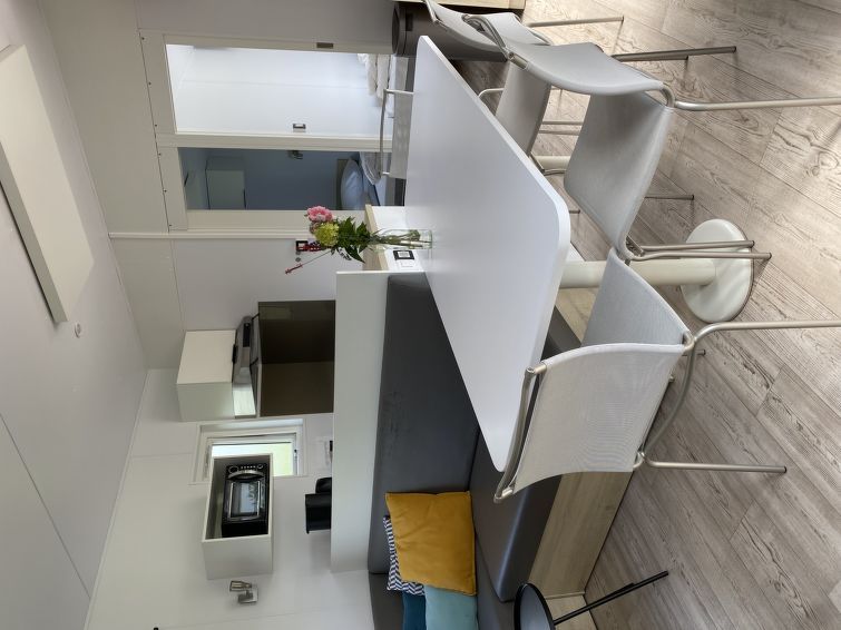 "6-persoons Jildau", 4-room mobile home 40 m2. Comfortable furnishings: living/dining room with dining table and flat screen. Exit to the terrace. 2 rooms, each room with 2 beds. 1 room with 1 double bed. Open kitchen (4 hot plates, dishwasher, kettle, microwave, electric coffee machine).