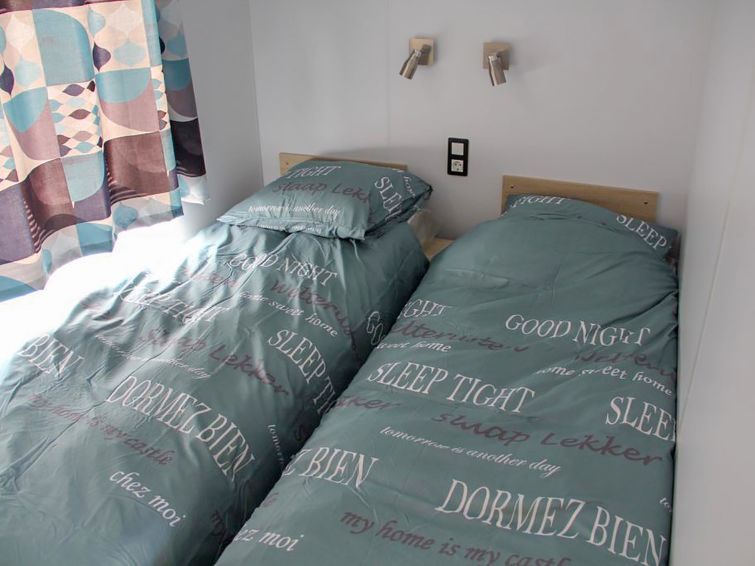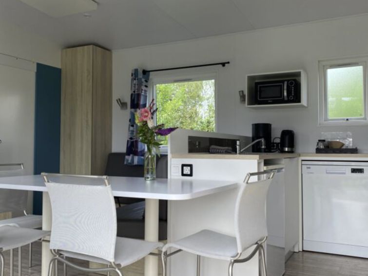 "6-persoons Eke", 4-room mobile home 40 m2. Comfortable furnishings: living/dining room with dining table and flat screen. Exit to the terrace. 2 rooms, each room with 2 beds. 1 room with 1 double bed. Open kitchen (4 hot plates, dishwasher, kettle, microwave, electric coffee machine).